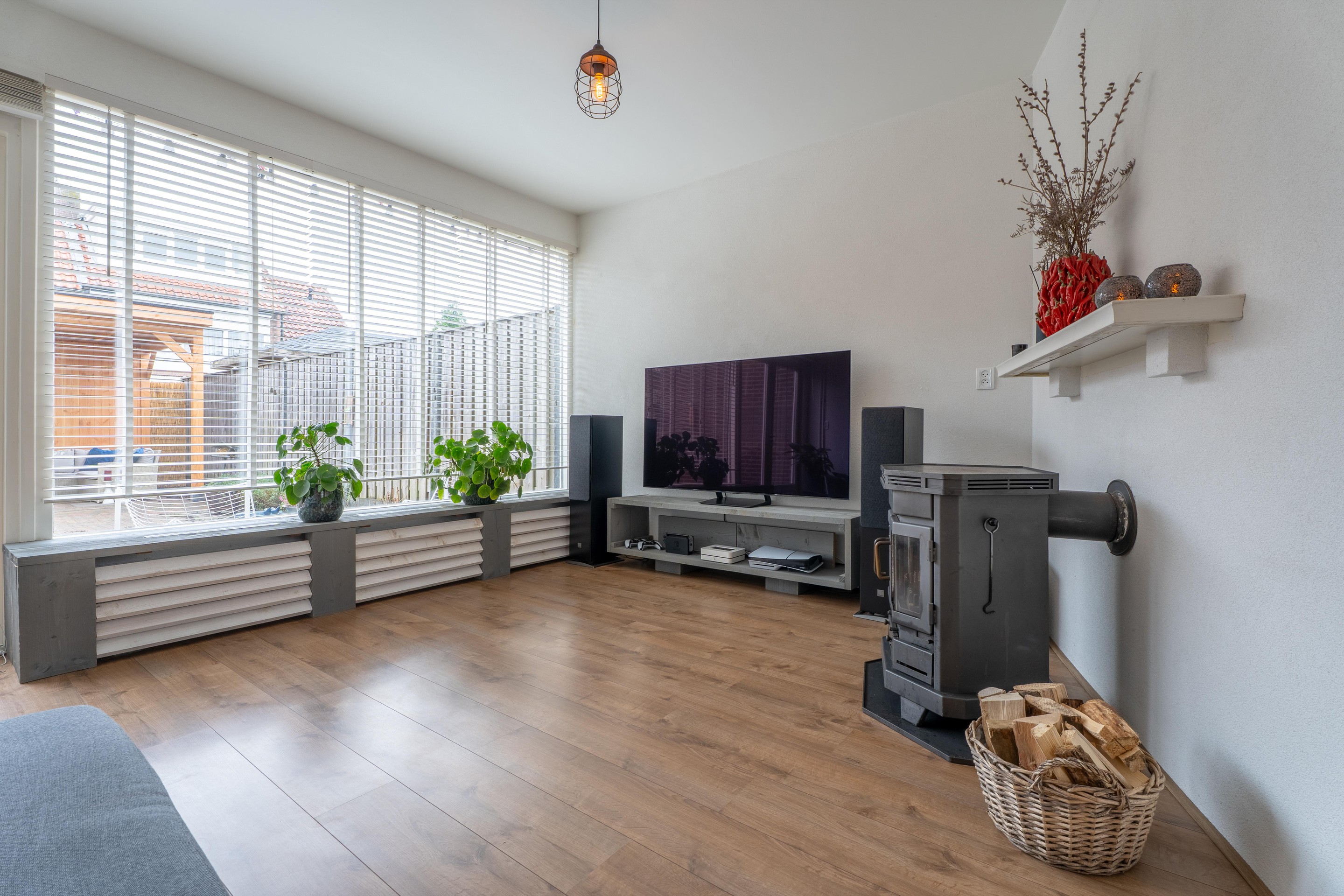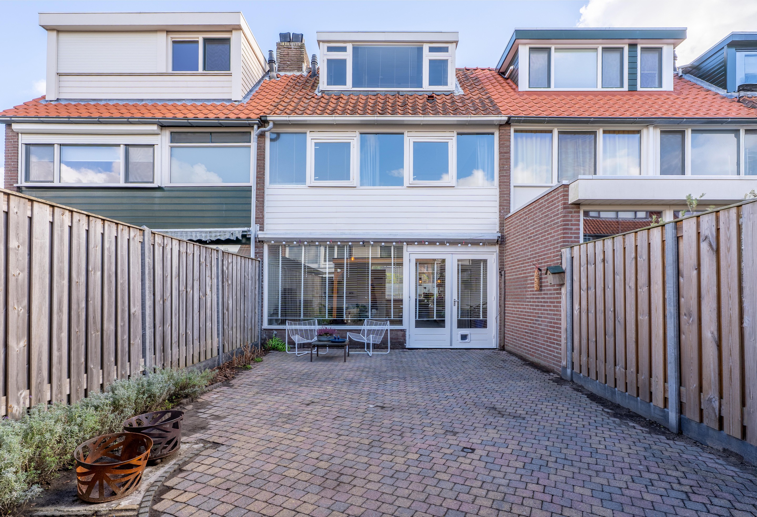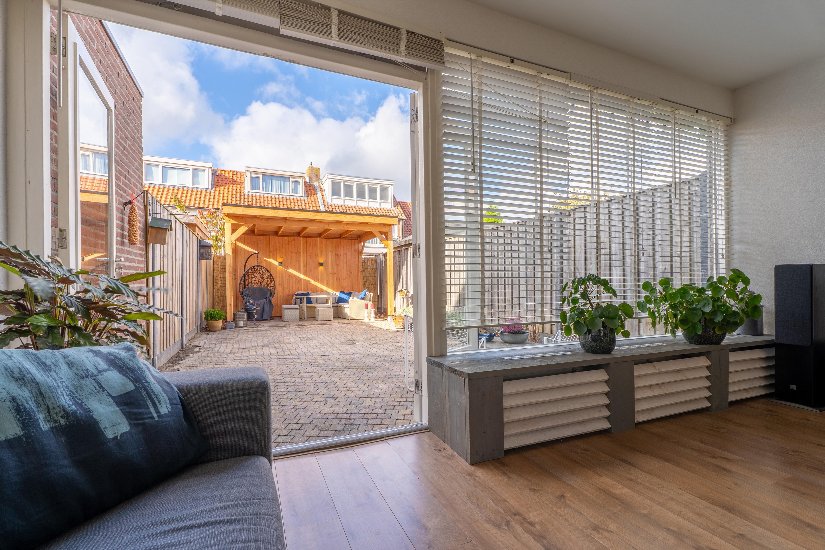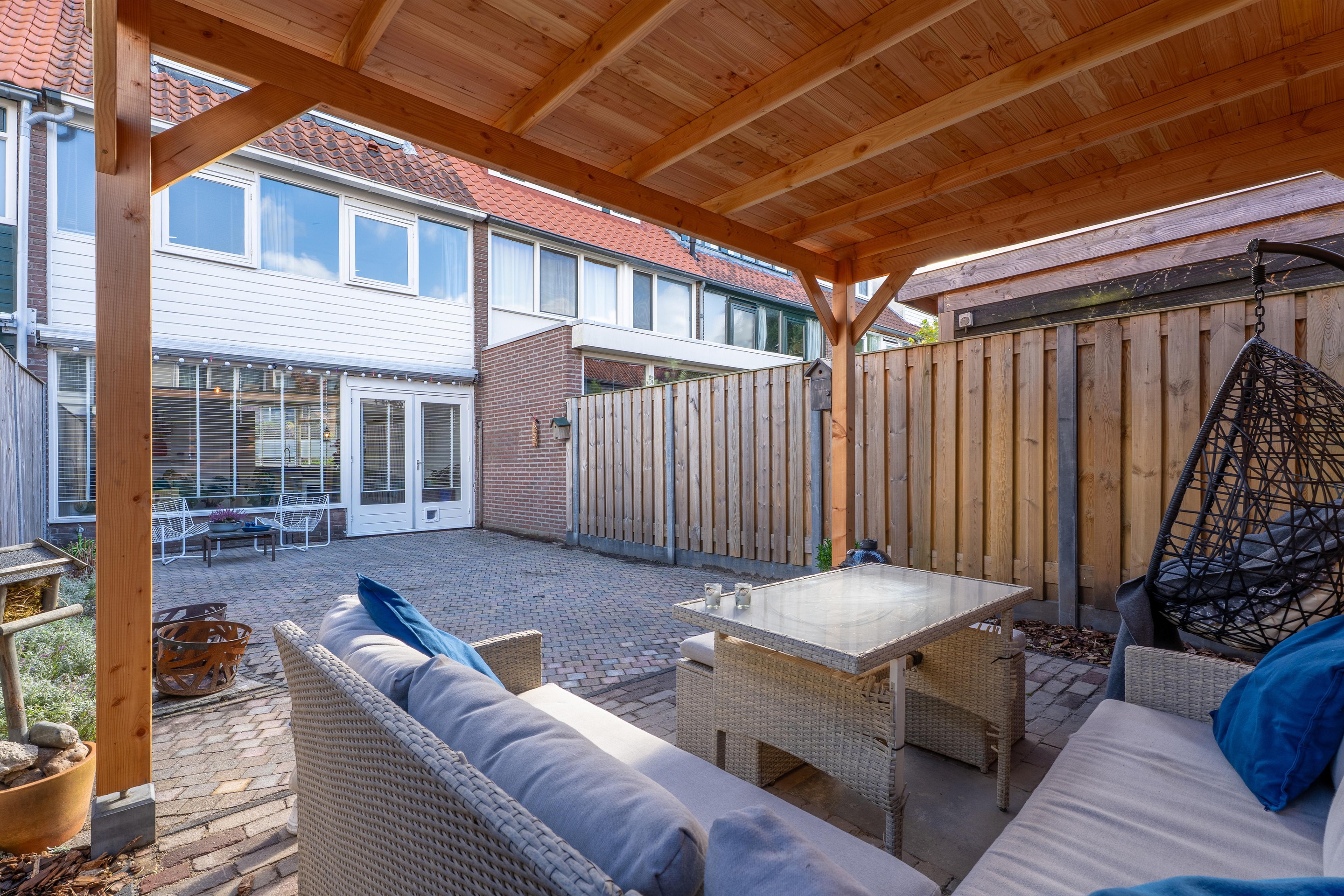 Via de openslaande pui in de woonkamer heb je toegang tot de achtertuin gelegen op het westen. Hier geniet je van volop zon en onder de houten overkapping kun je het hele jaar heerlijk vertoeven.