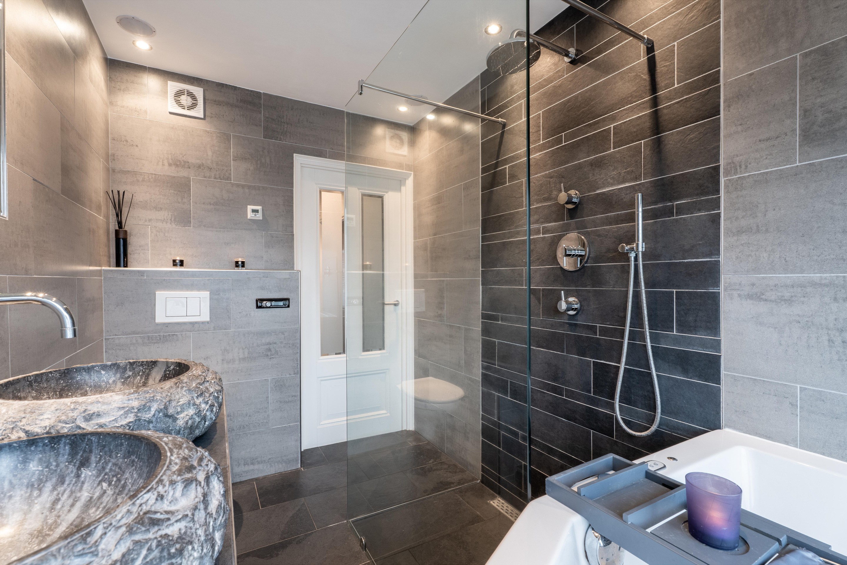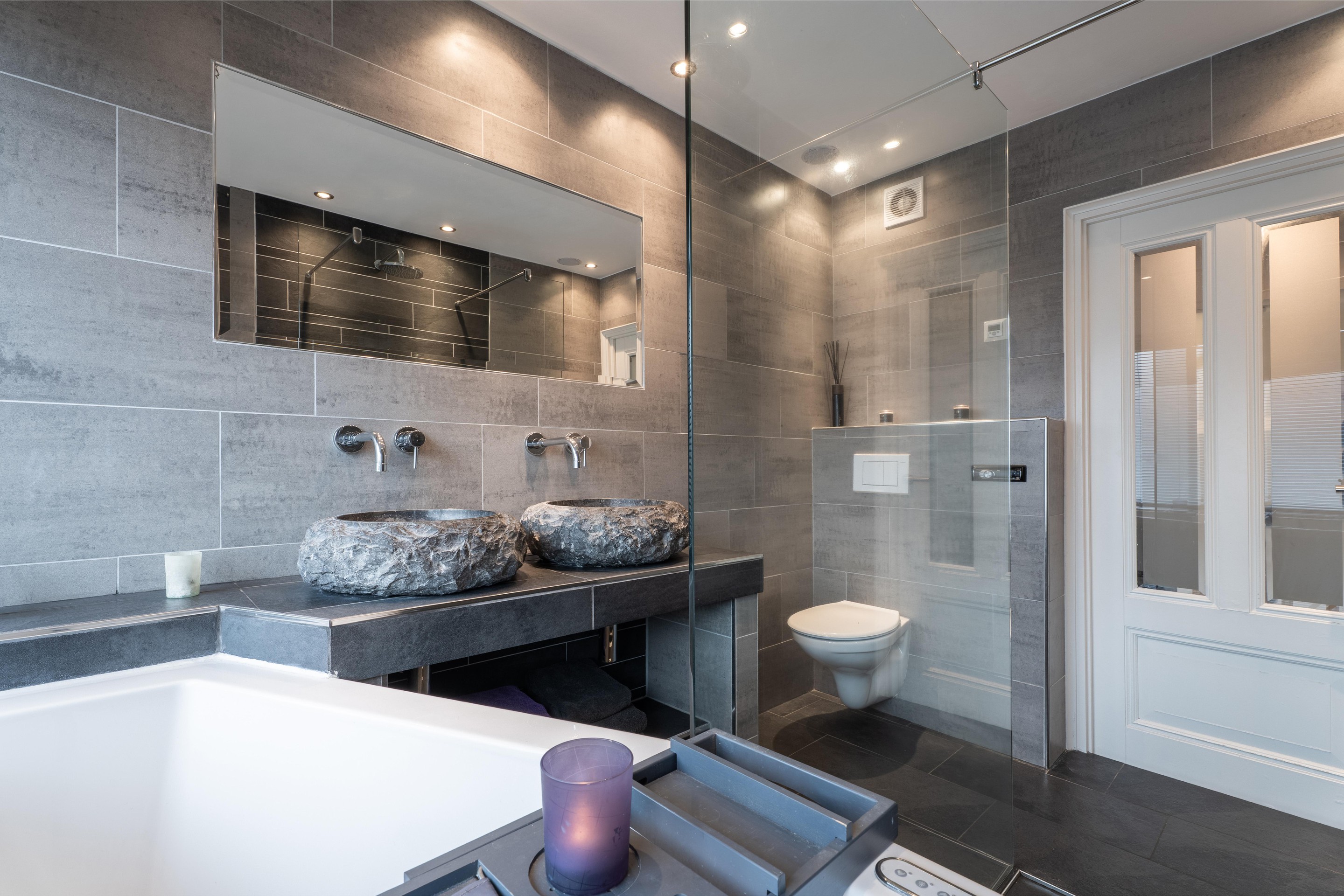 De badkamer is volledig betegeld en is voorzien van een ligbad, een ruime inloopdouche, een wastafelmeubel met dubbele wasbak en een hangend toilet.