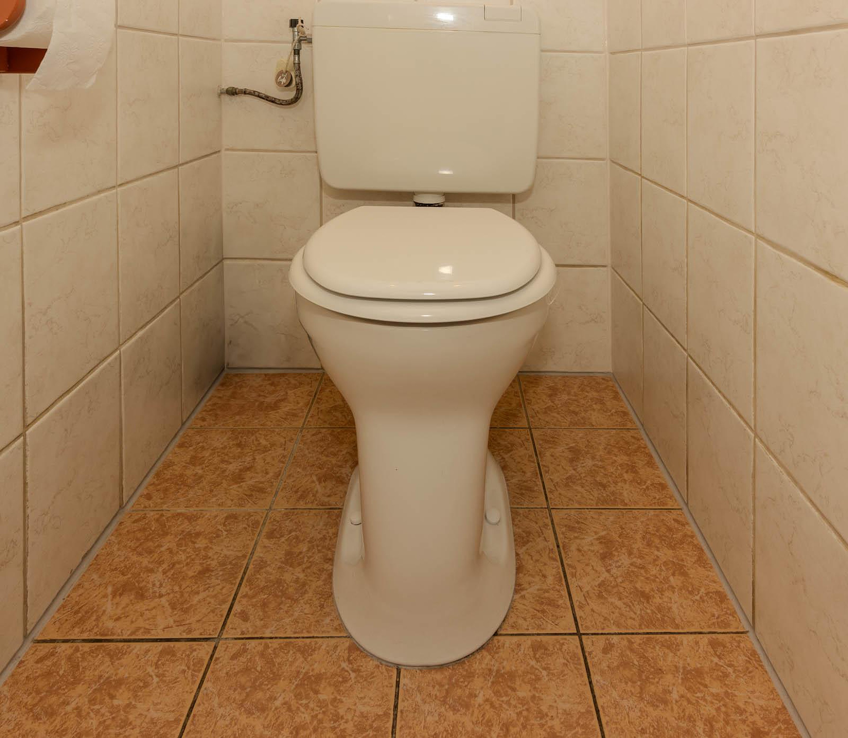 Het toilet is half betegeld en is voorzien van een staand toilet.