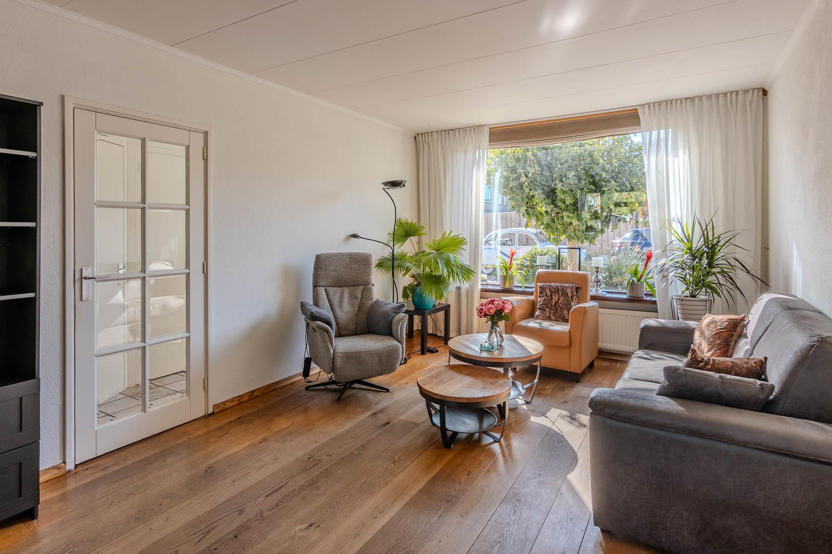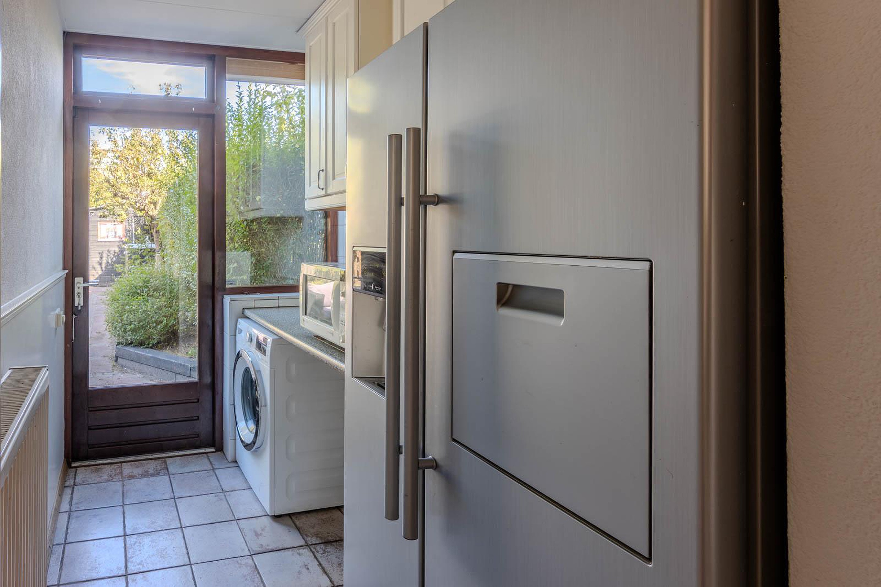 De woonkamer is voorzien van een Amerikaans eiken vloer en de ruime uitbouw zorgt voor extra leefruimte op de begane grond. De uitbouw is verdeeld in een gezellige zithoek en de praktische bijkeuken. In de bijkeuken is de opstelling voor de wasmachine gesitueerd.