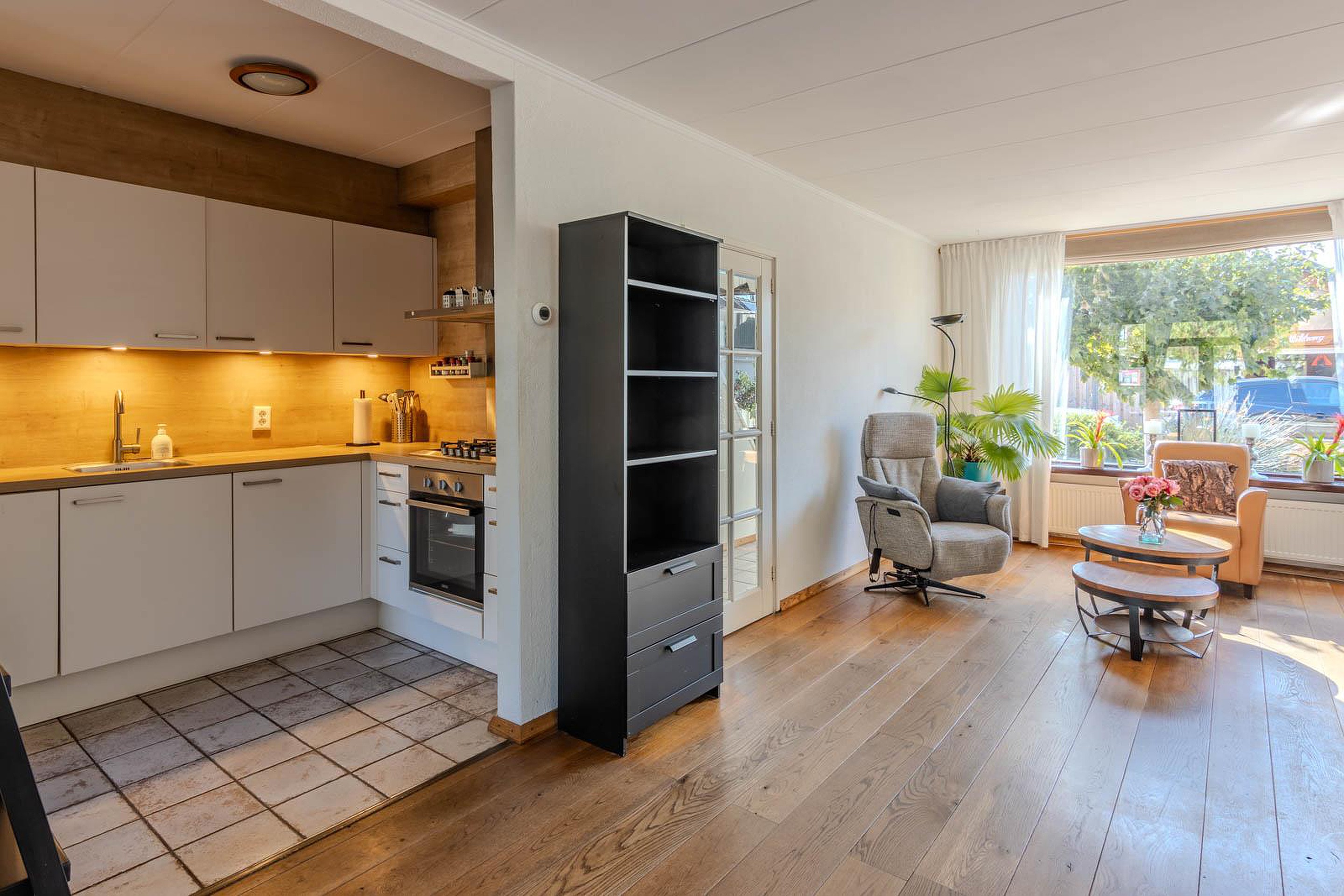 De woonkamer biedt toegang tot de open keuken. De keuken in L-opstelling is in 2021 gerenoveerd en is voorzien van een 5-pits gaskookplaat, een oven, heeft een vaatwasser en een losse koel-vriescombi.
