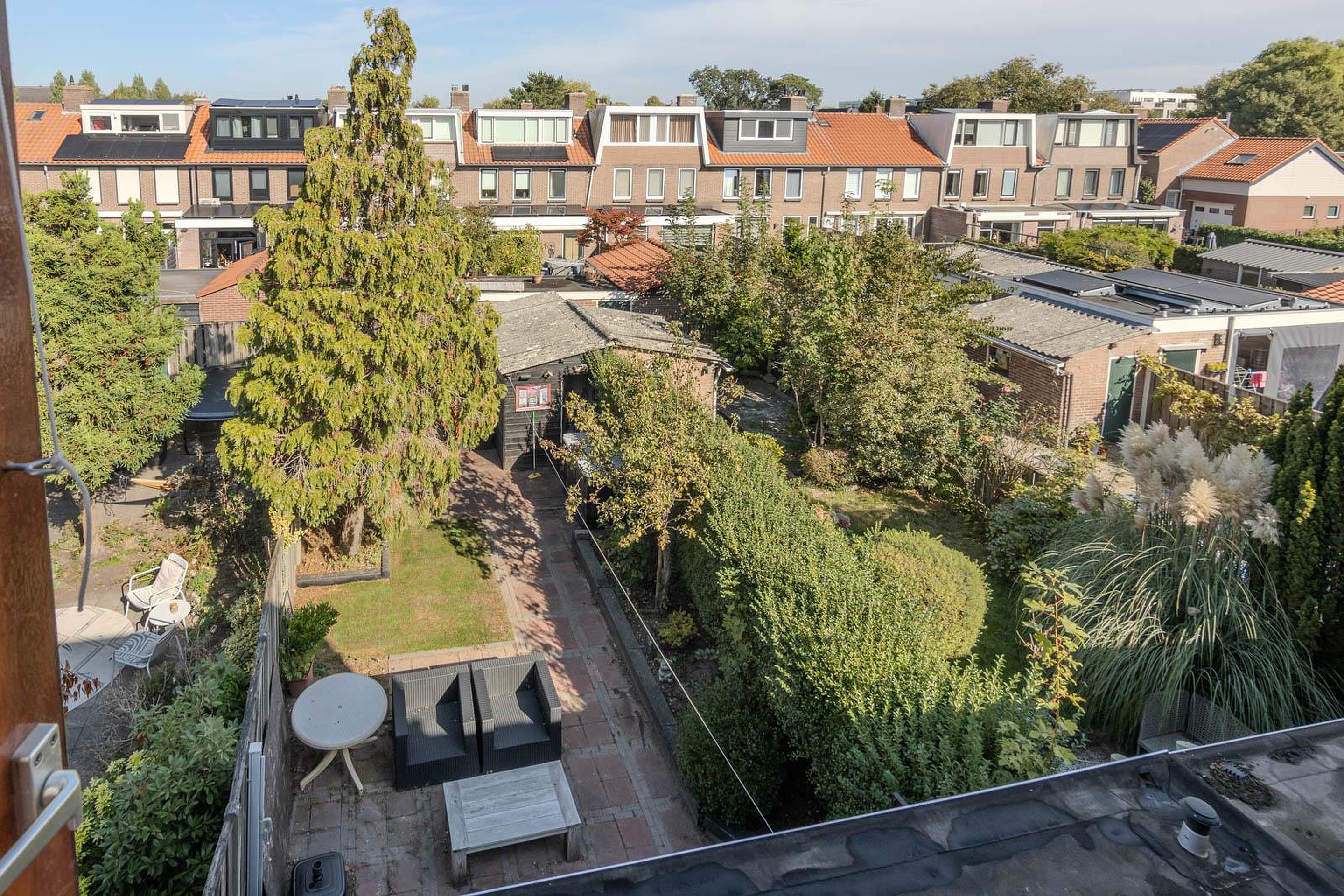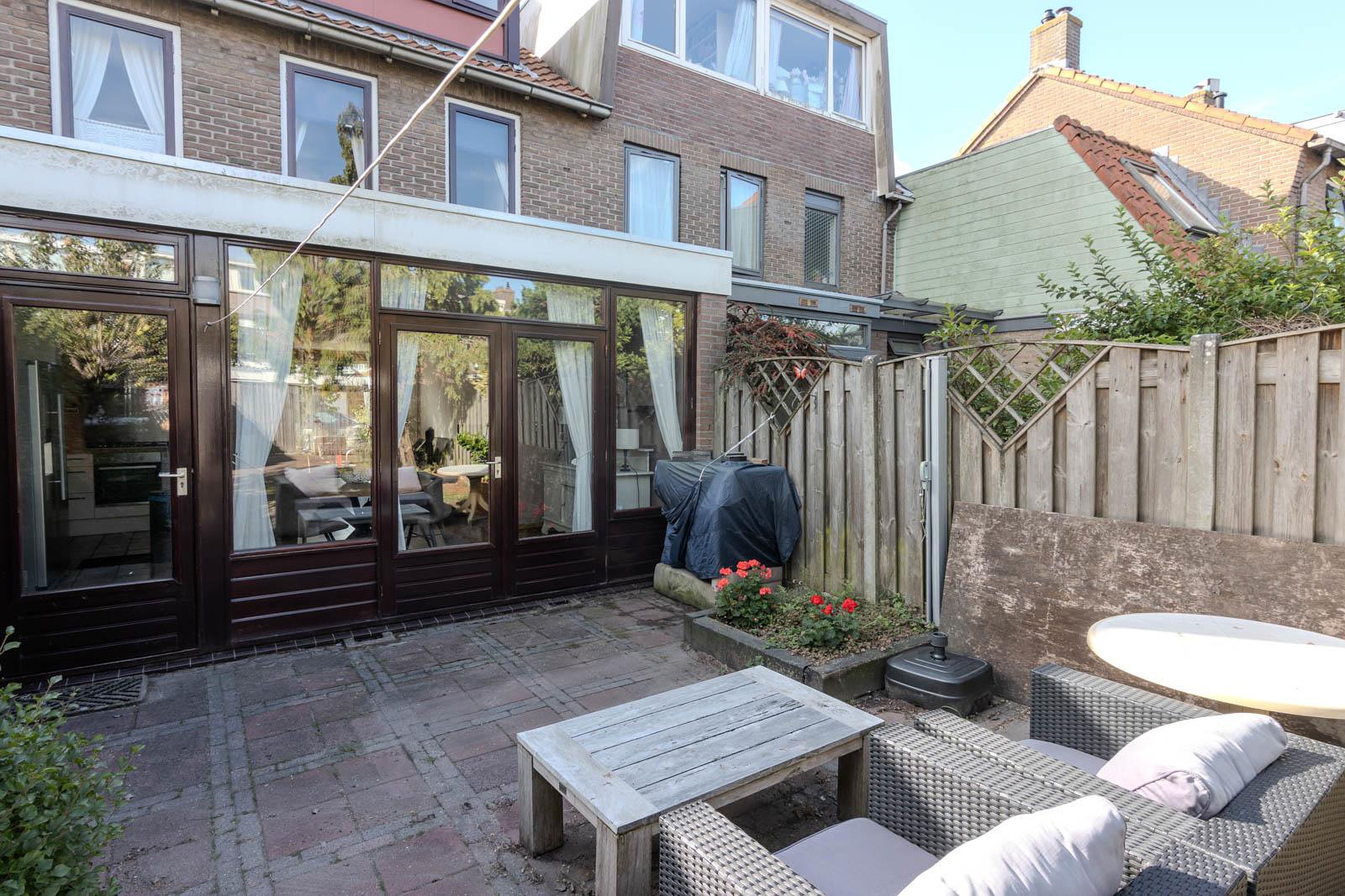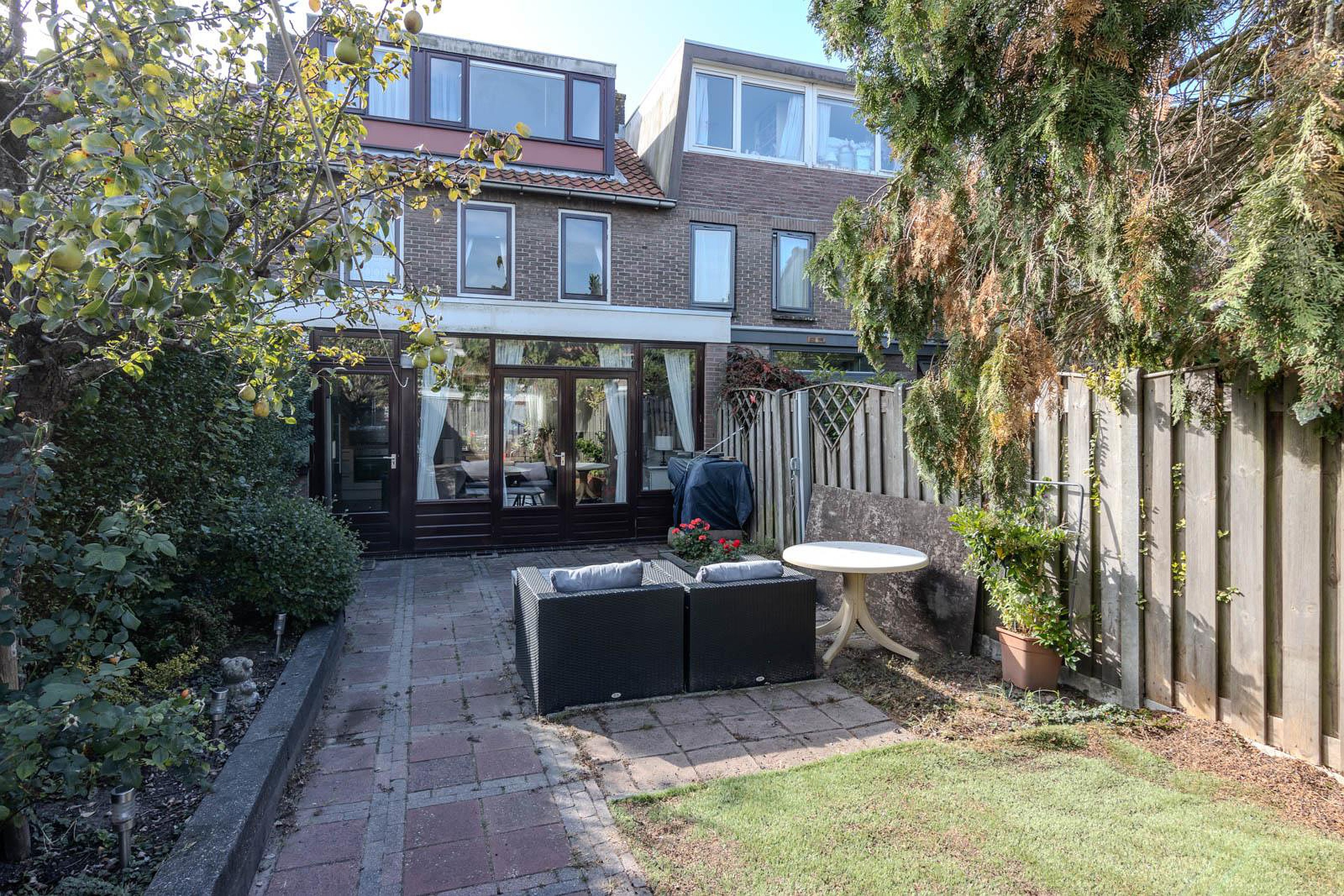 De openslaande deuren in de woonkamer en de keukendeur in de bijkeuken bieden toegang tot de zeer ruime achtertuin gelegen op het noorden. De achtertuin is voorzien van een achterom en heeft een stenen en een houten berging.