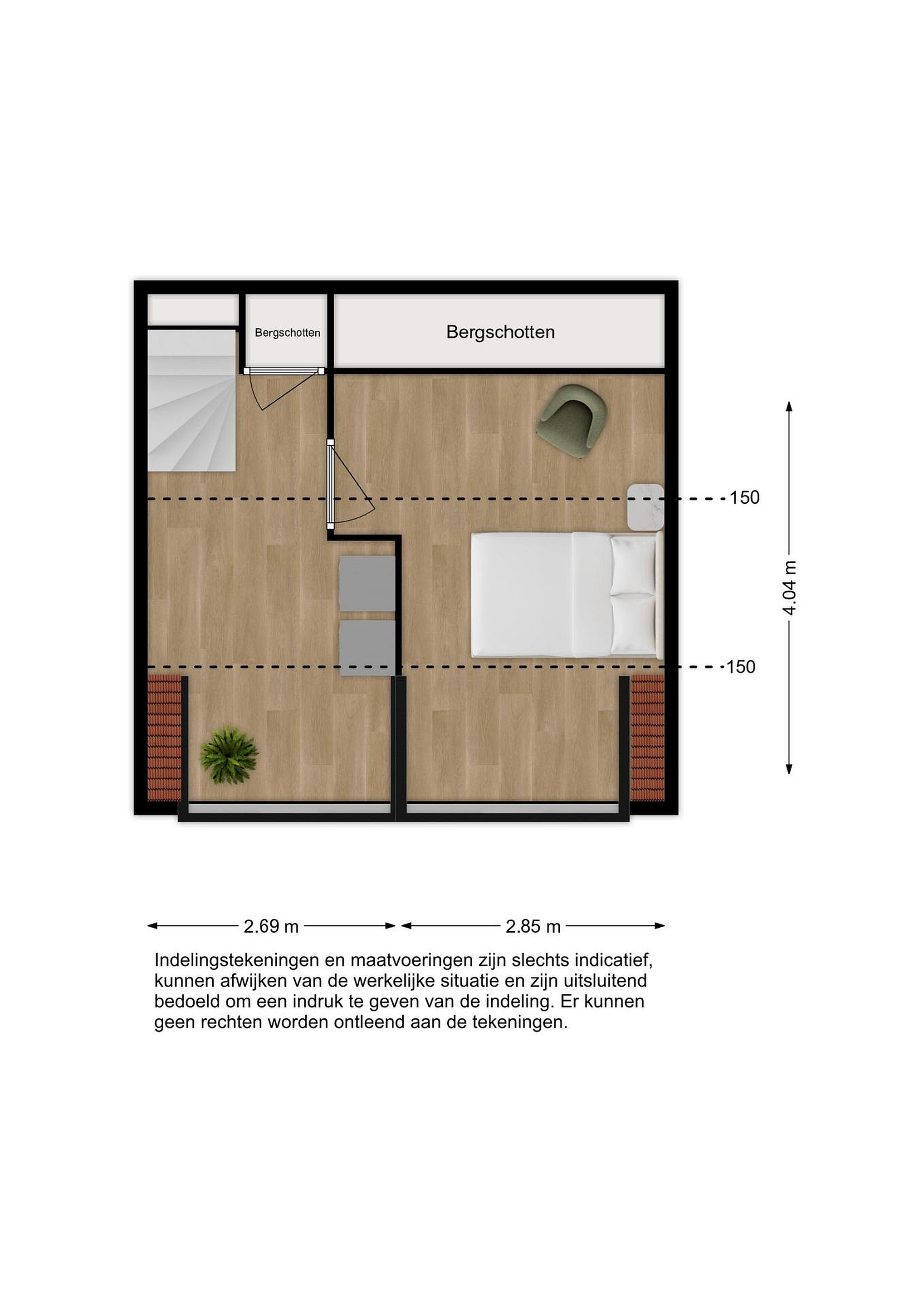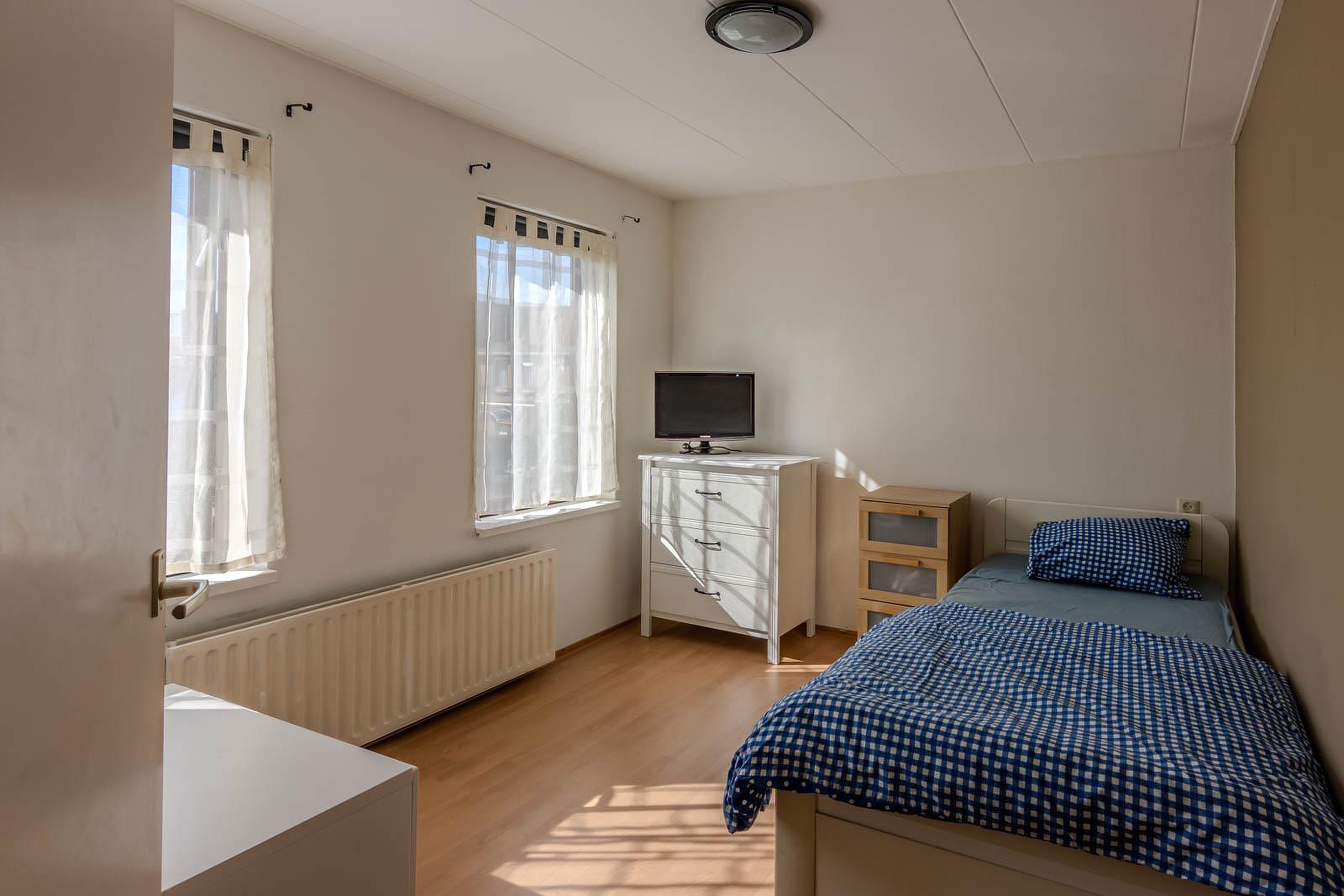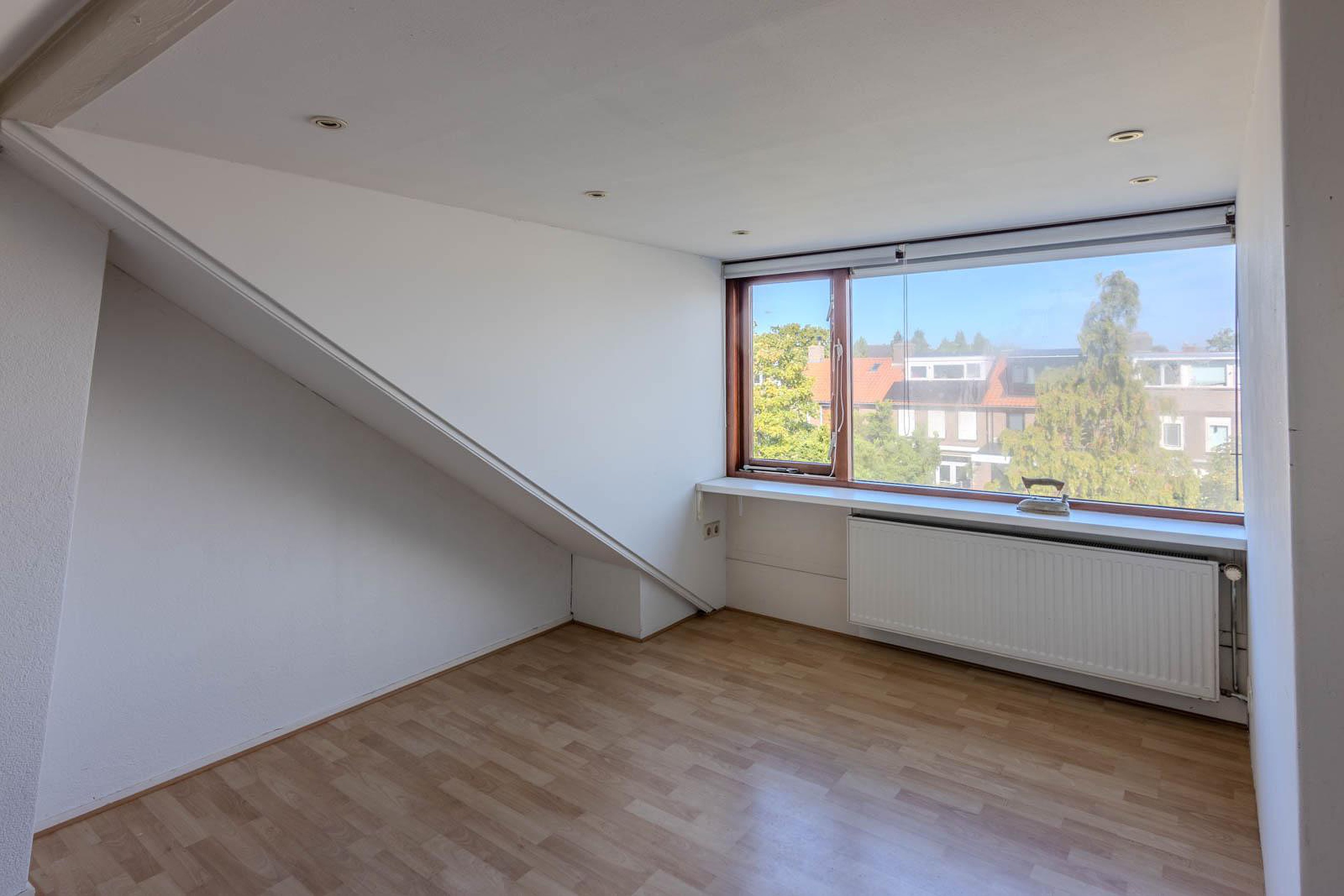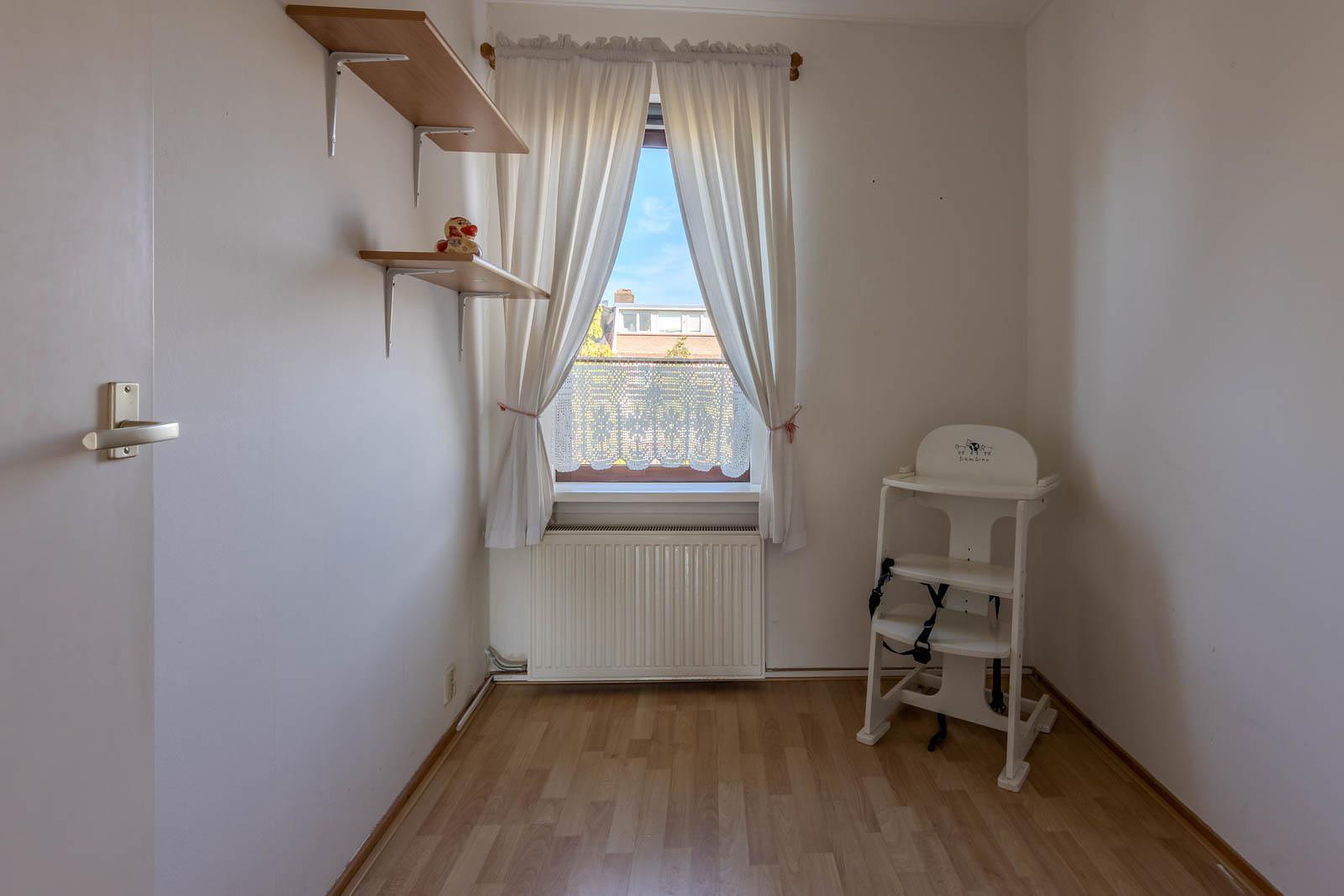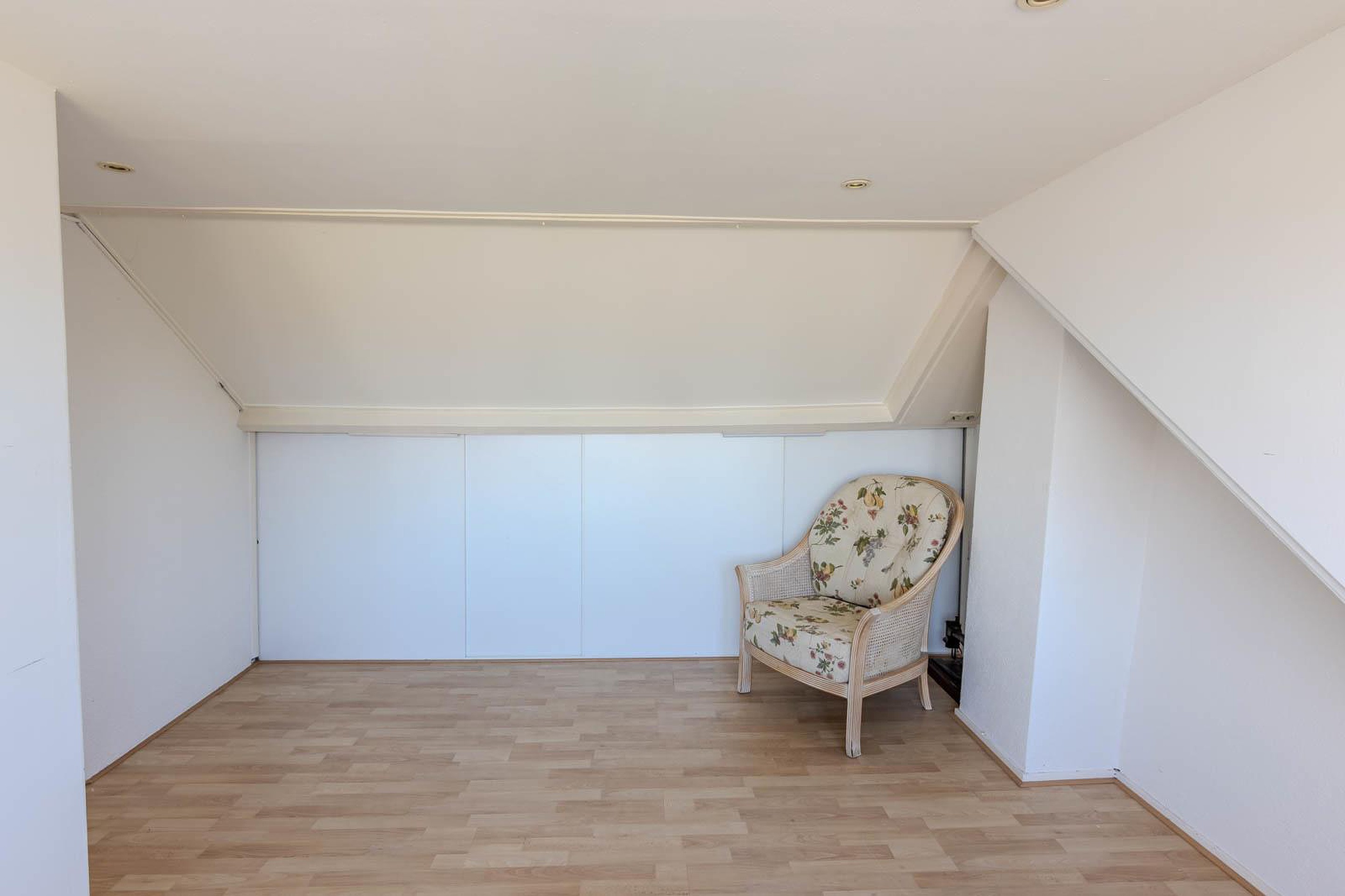 De zolderkamer is voorzien van een dakkapel voor extra ruimte en is afgewerkt met een laminaatvloer en bergschotten voor voldoende opbergruimte.
