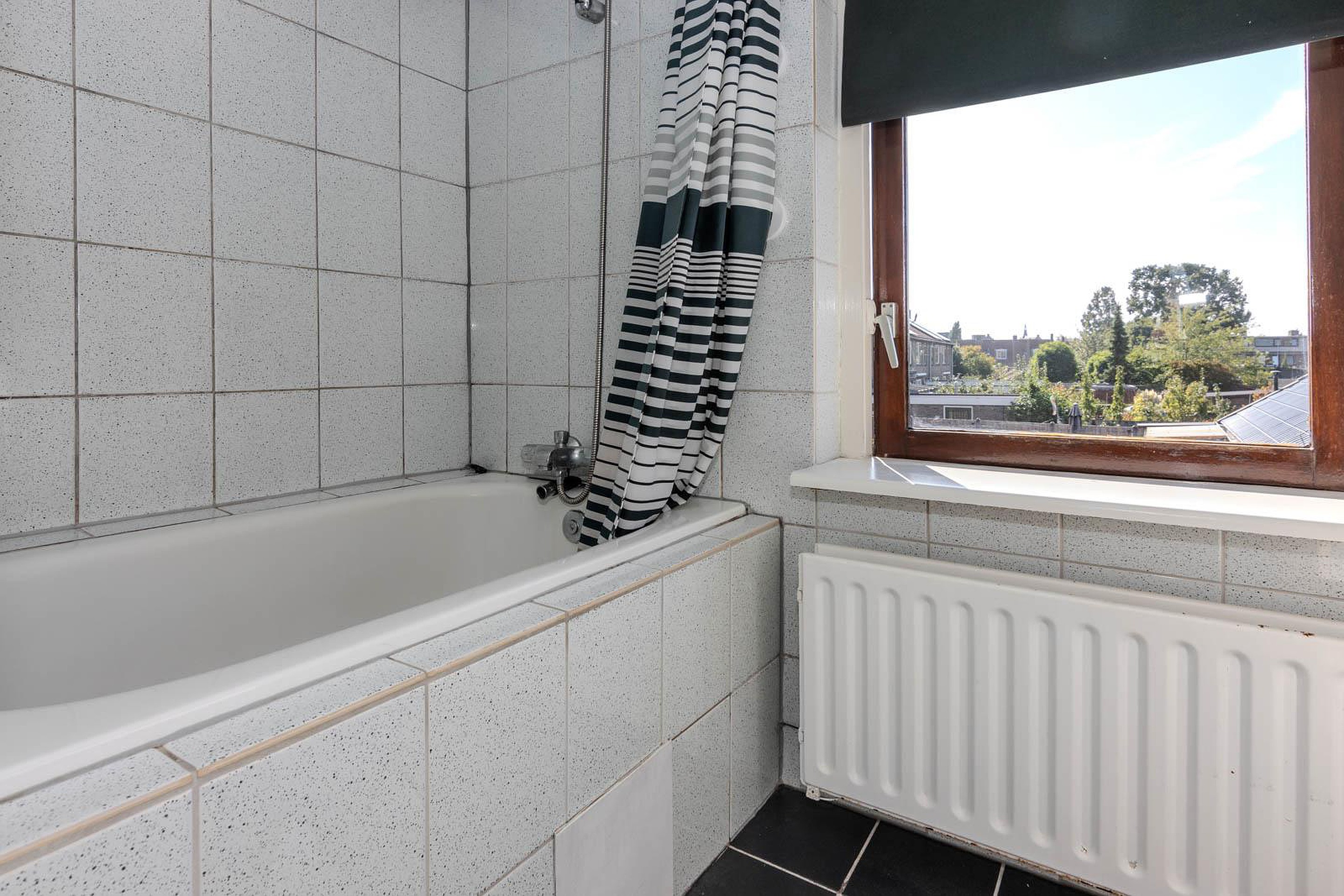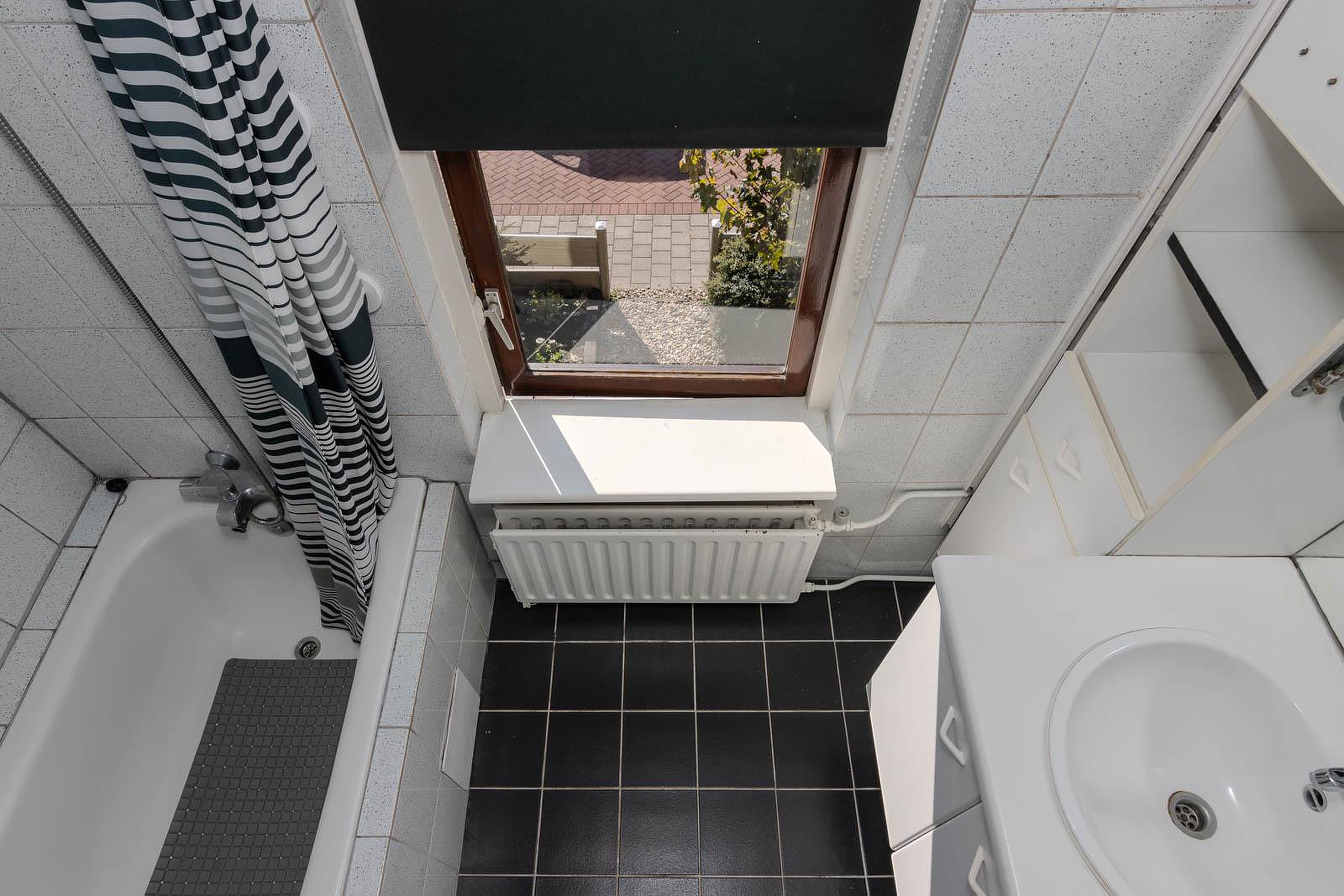 De badkamer is volledig betegeld en is voorzien van een ligbad- met douche en een wastafelmeubel met opbergmogelijkheden.