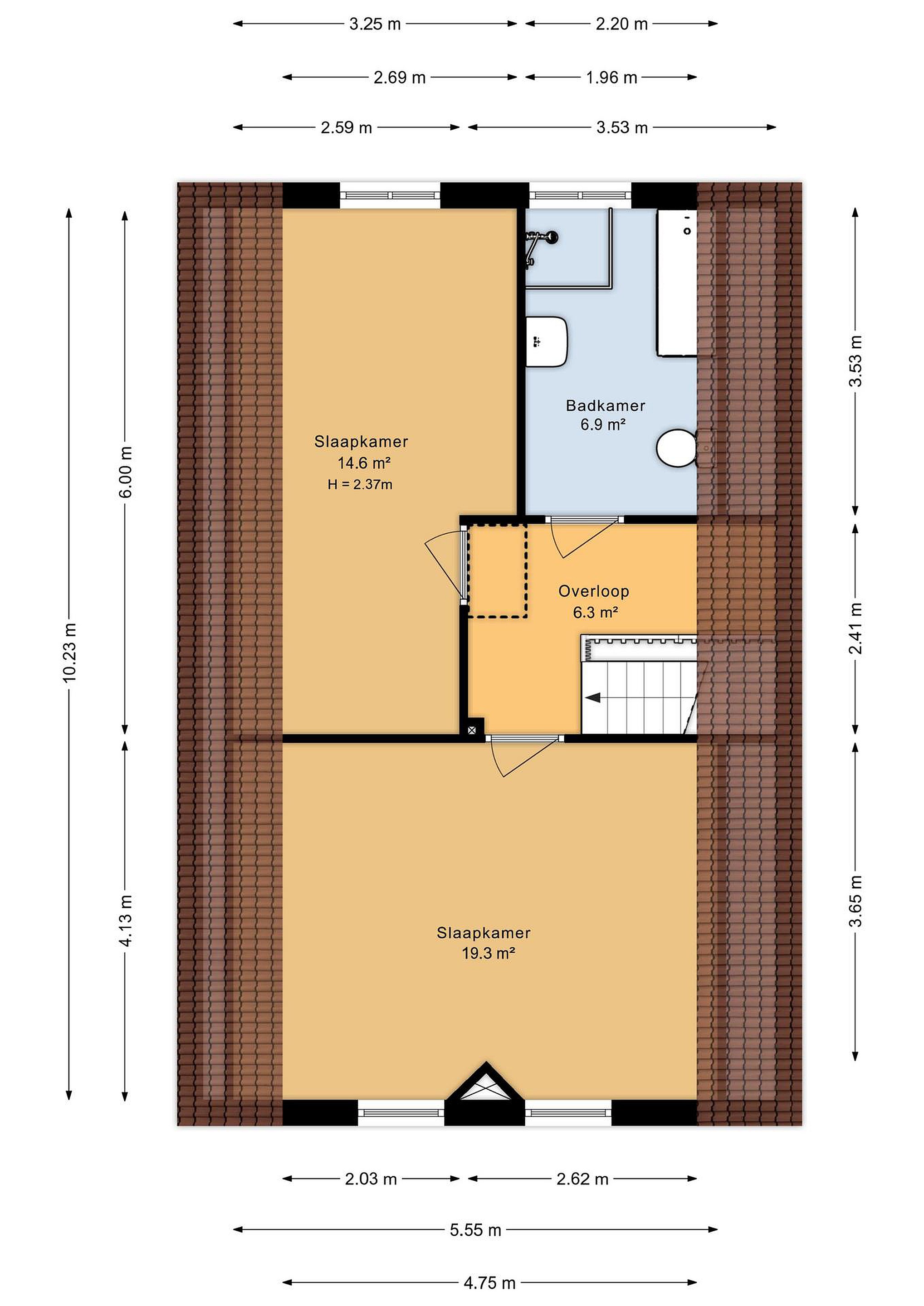 Op de eerste verdieping bevinden zich twee ruime slaapkamers en een nette badkamer. De grootste slaapkamer (ca. 19 m2) ligt aan de voorzijde van de woning en biedt volop ruimte voor een groot tweepersoonsbed, kastenwand of zelfs een kleine zithoek. De tweede slaapkamer bevindt zich aan de achterzijde en is eveneens goed van formaat – ideaal als logeerkamer, werkkamer of hobbyruimte.