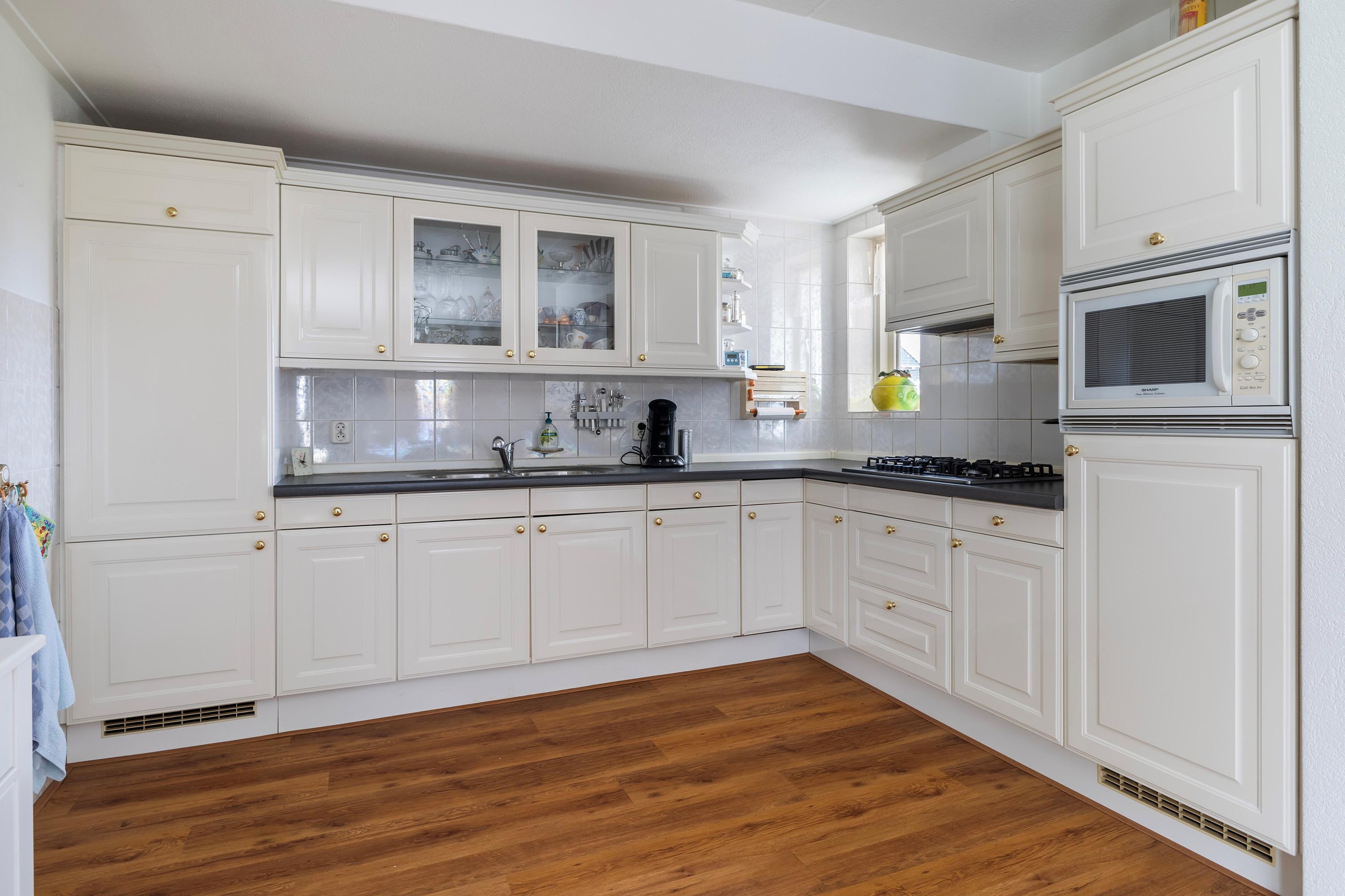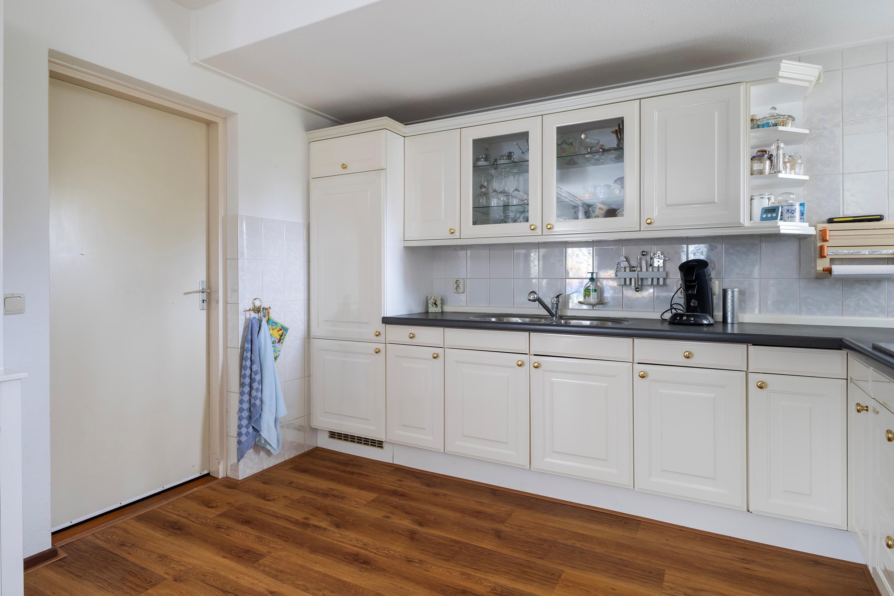 De keuken ligt aan de achterzijde en is praktisch ingericht. Aangrenzend bevindt zich de bijkeuken, waar plaats is voor witgoed en extra bergruimte. Vanuit hier heb je toegang tot de aangebouwde garage van ca. 20 m2 — ideaal voor het stallen van een auto, fietsen of als hobby- en werkruimte.