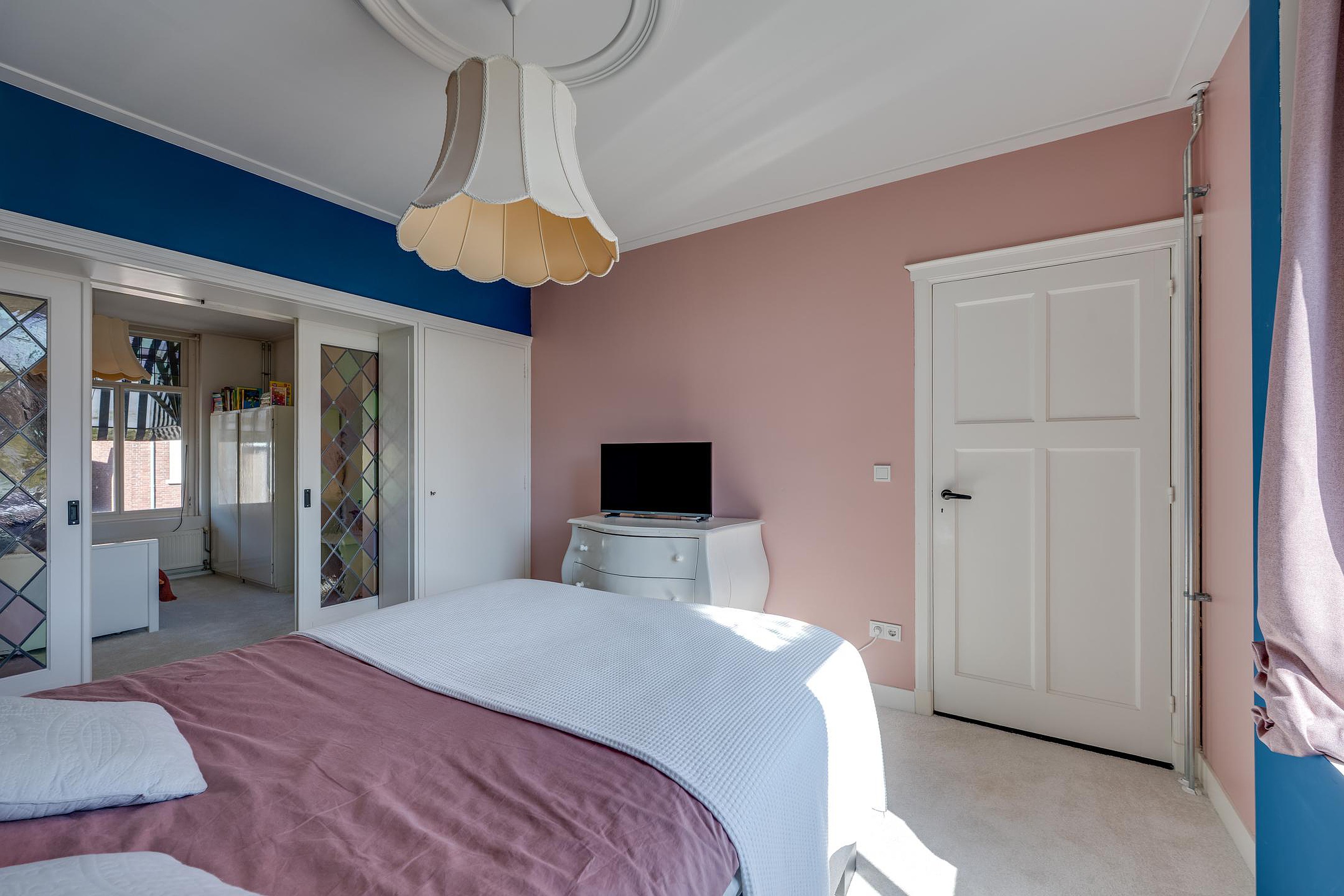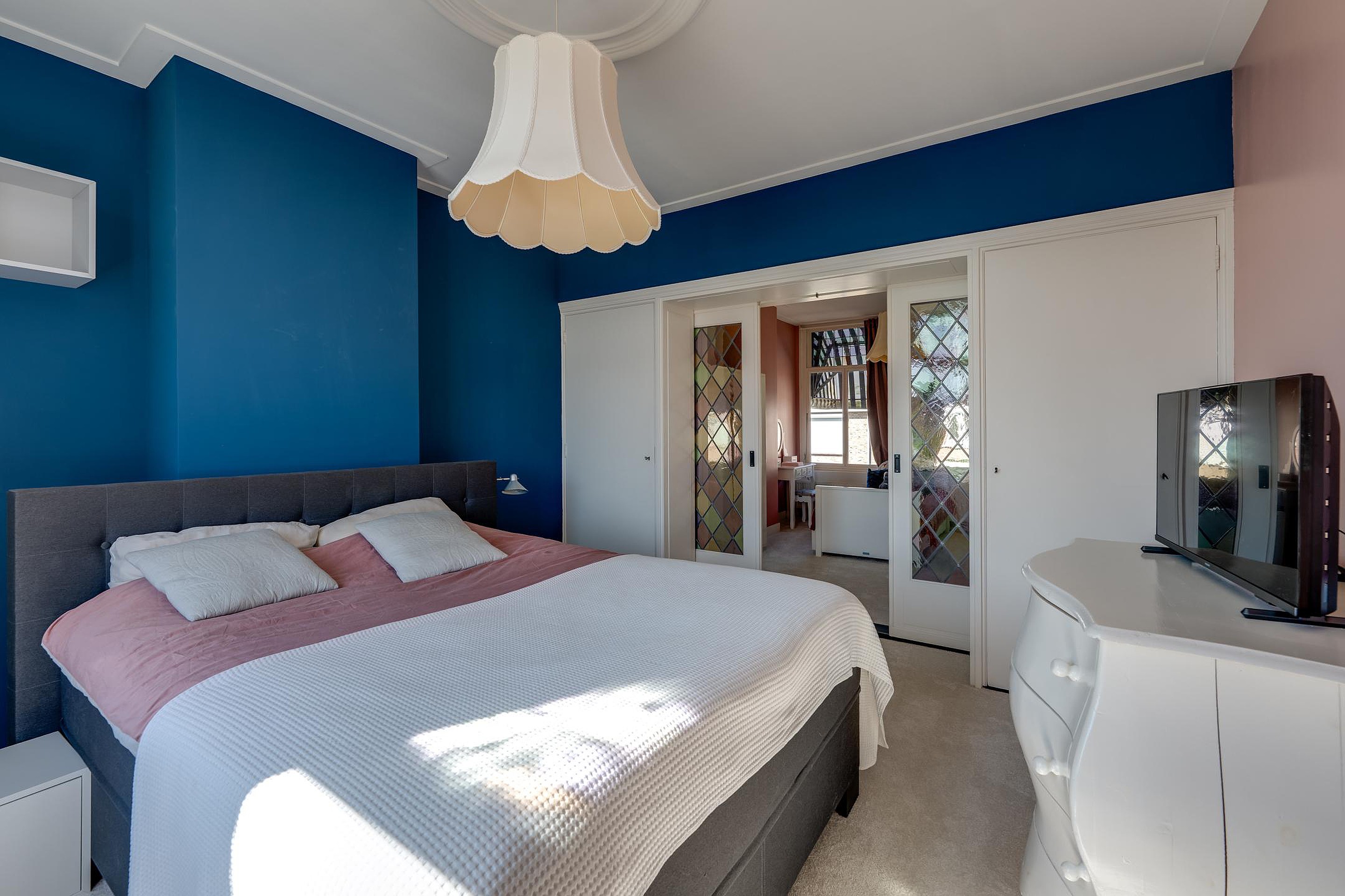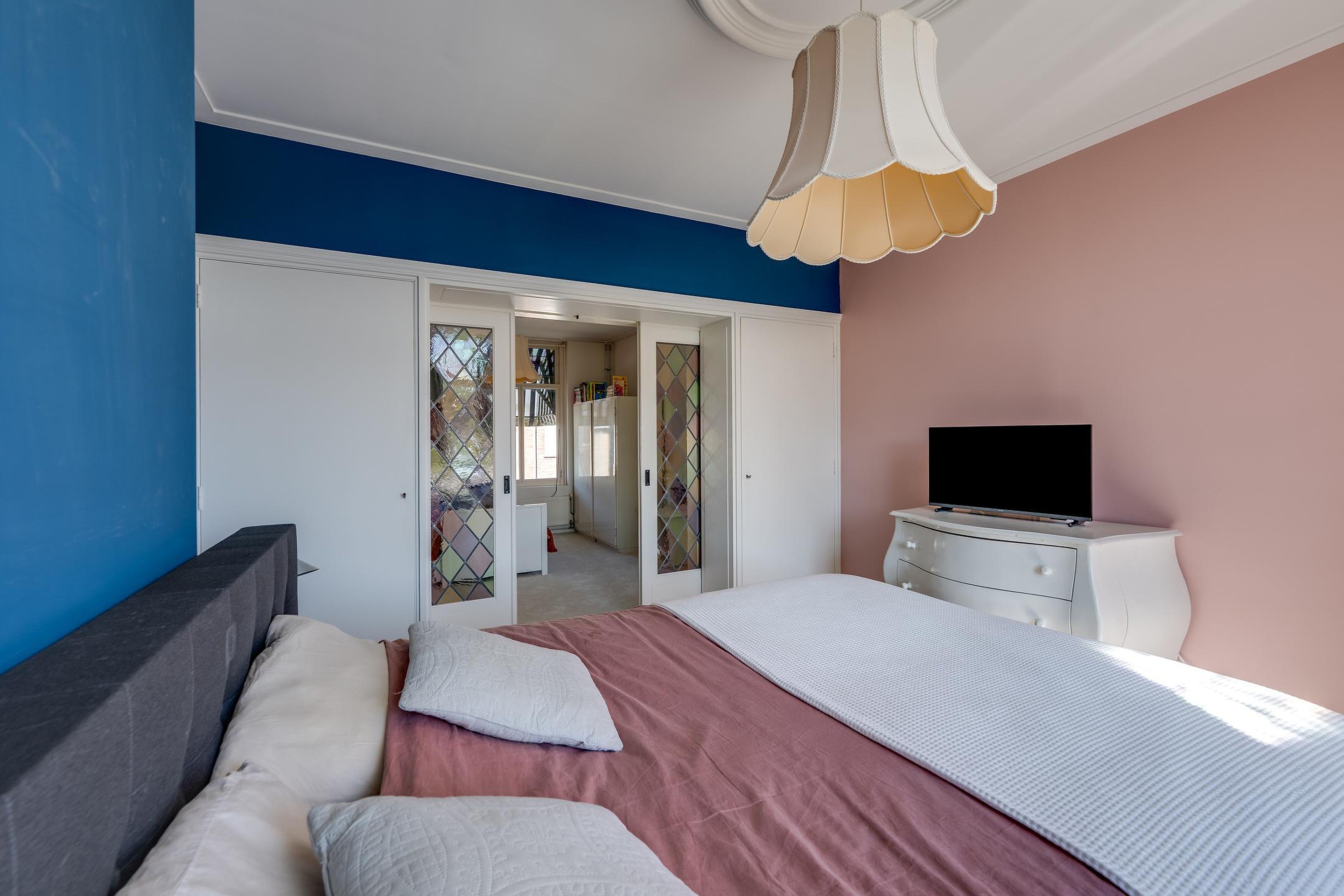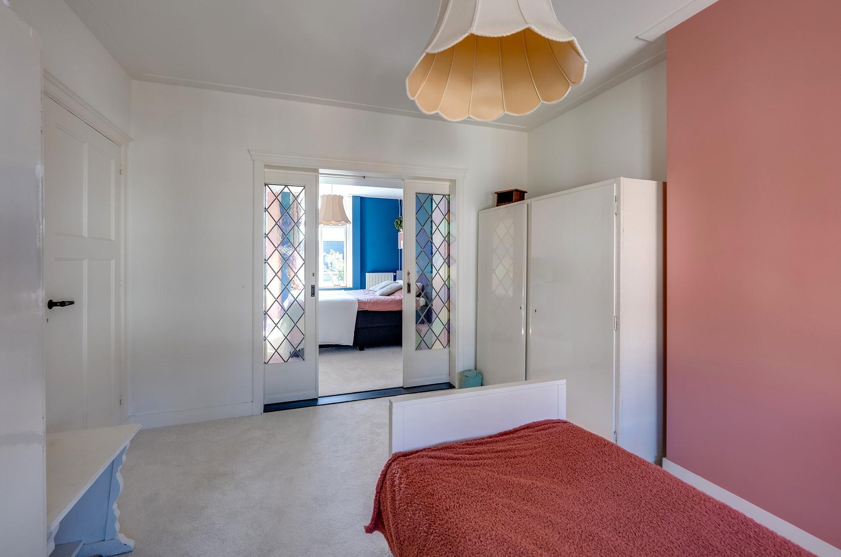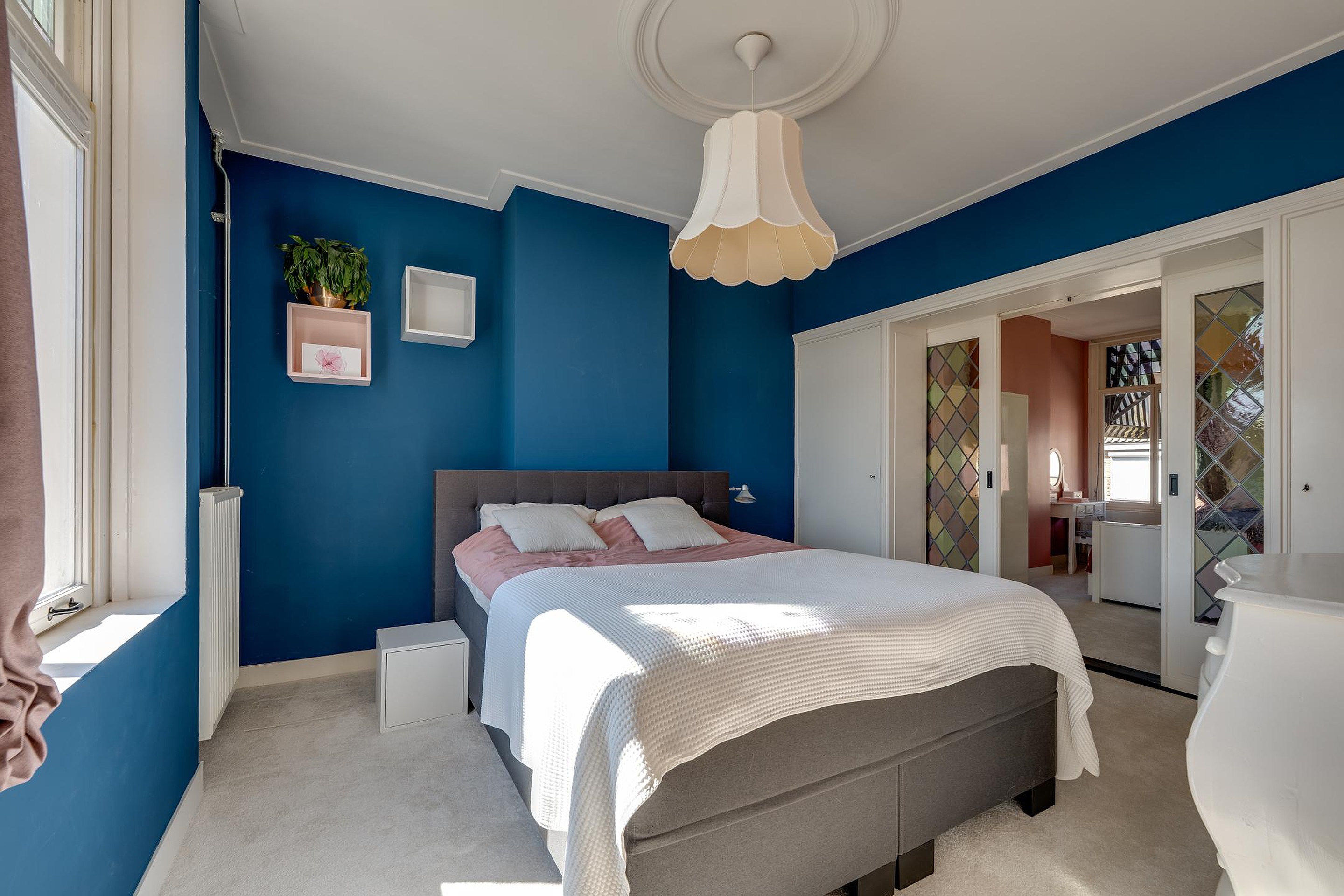 Deze slaapkamer (4,54 m. x 3,66 m.) ligt aan de achterzijde van de woning en wordt van de voorkamer gescheiden door een twee dichte kamer en suitekasten met sfeervolle glas in lood schuifdeuren. Het plafond is v.v. sierlijsten en ornamenten, de wanden zijn glad afgewerkt en er ligt een comfortabele, lichte vloerbedekking. De originele hardhouten schuiframen zijn v.v. HR++ glas en het originele glas in lood bovenin is weer netjes in dubbel glas gezet.