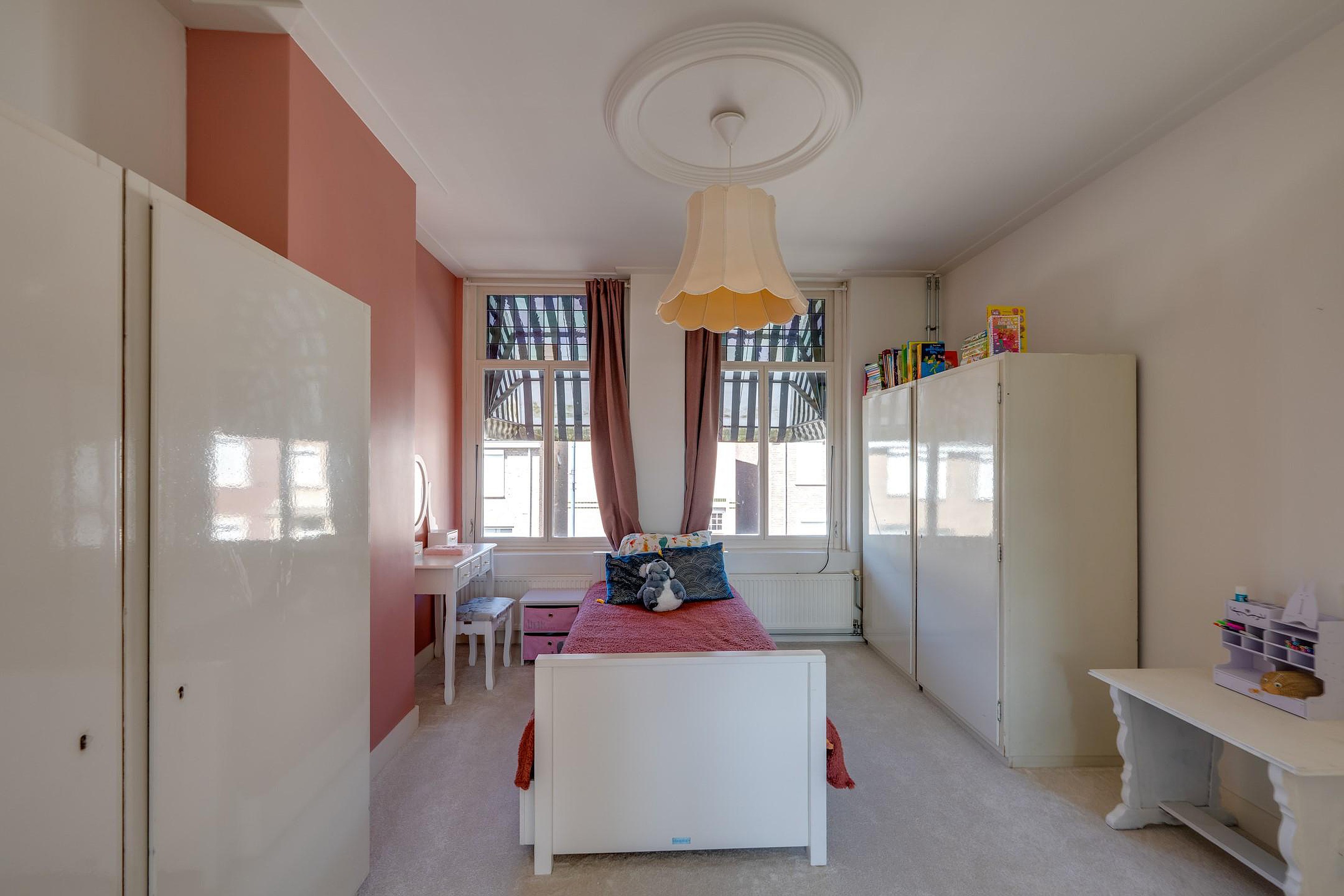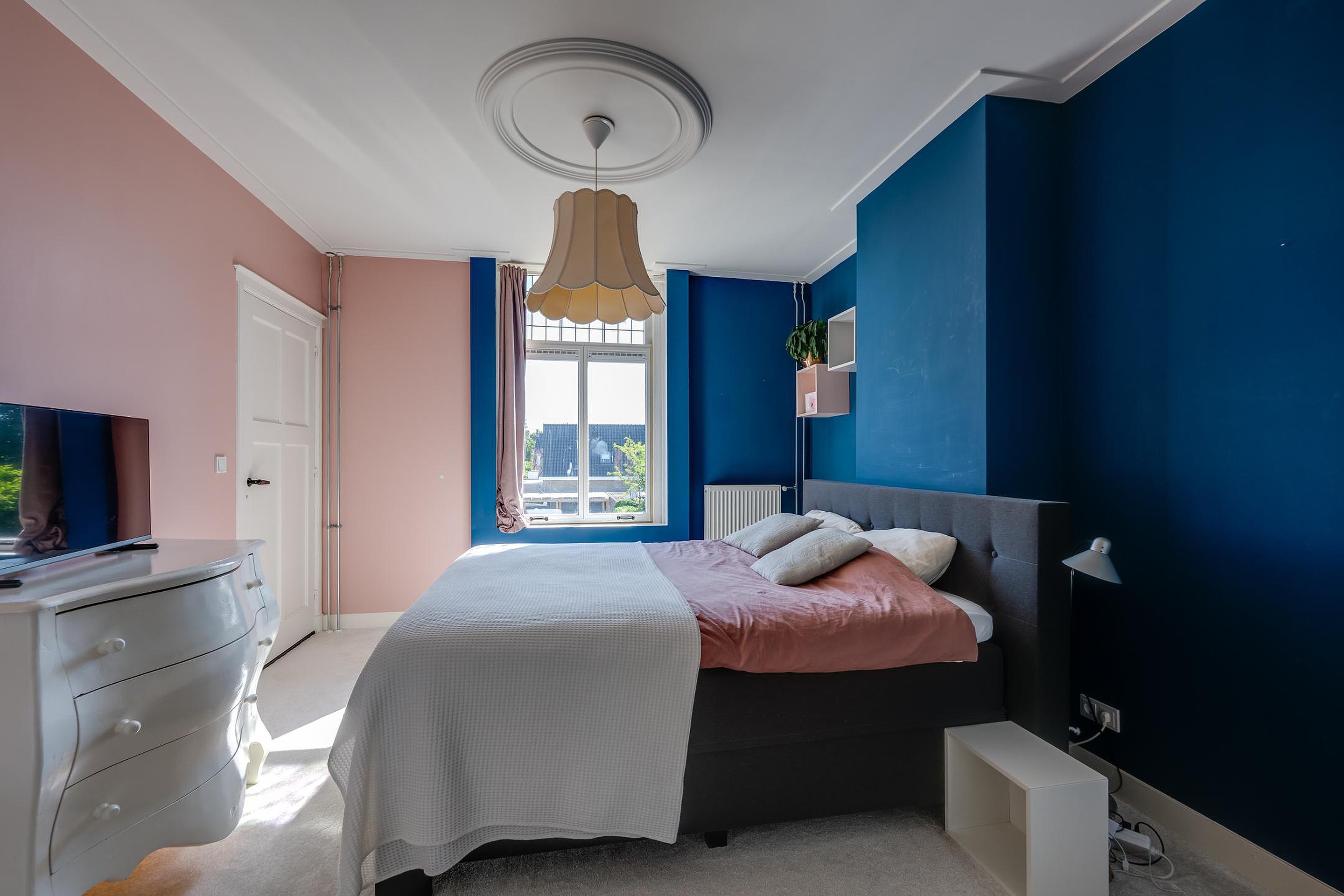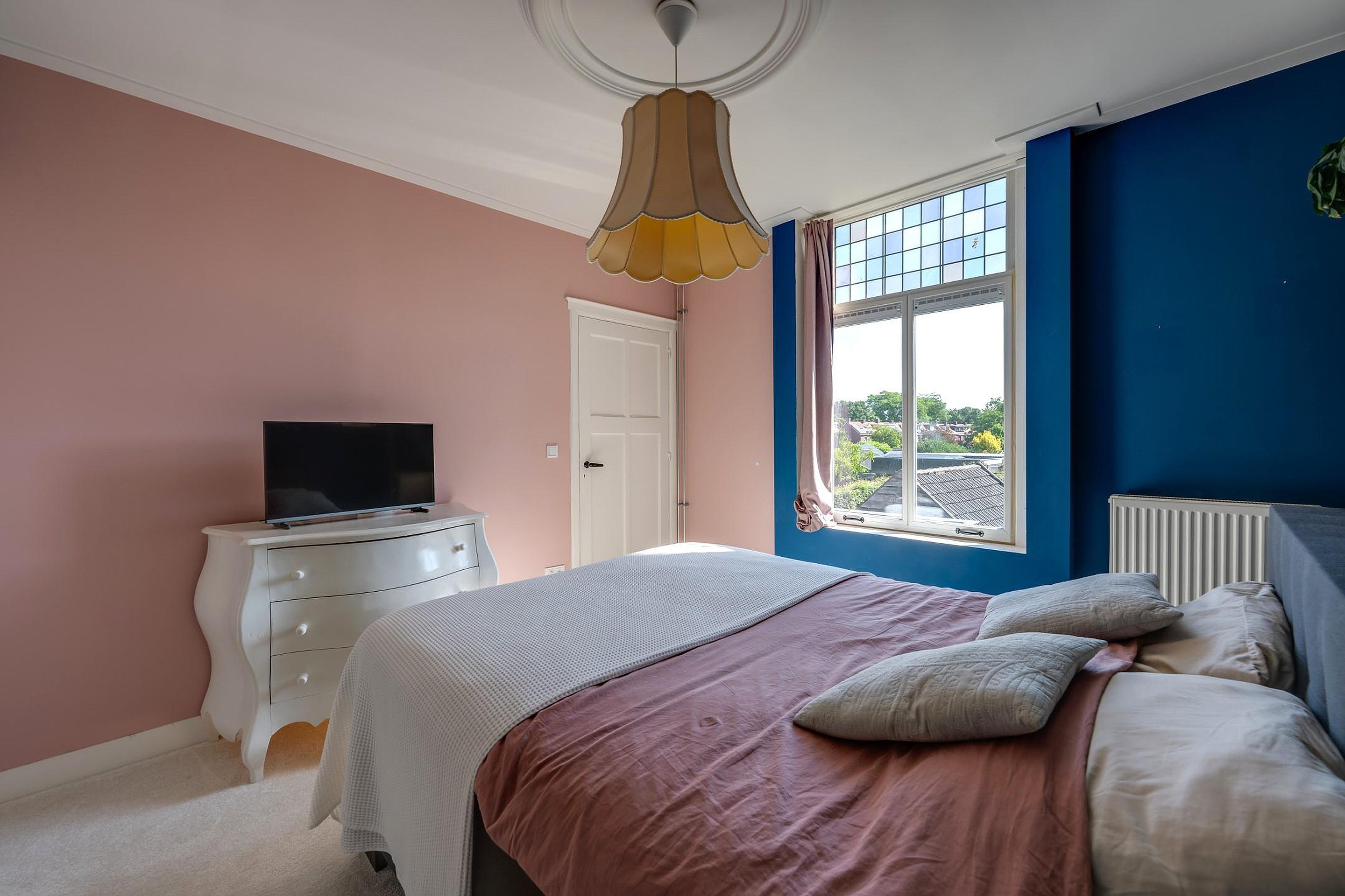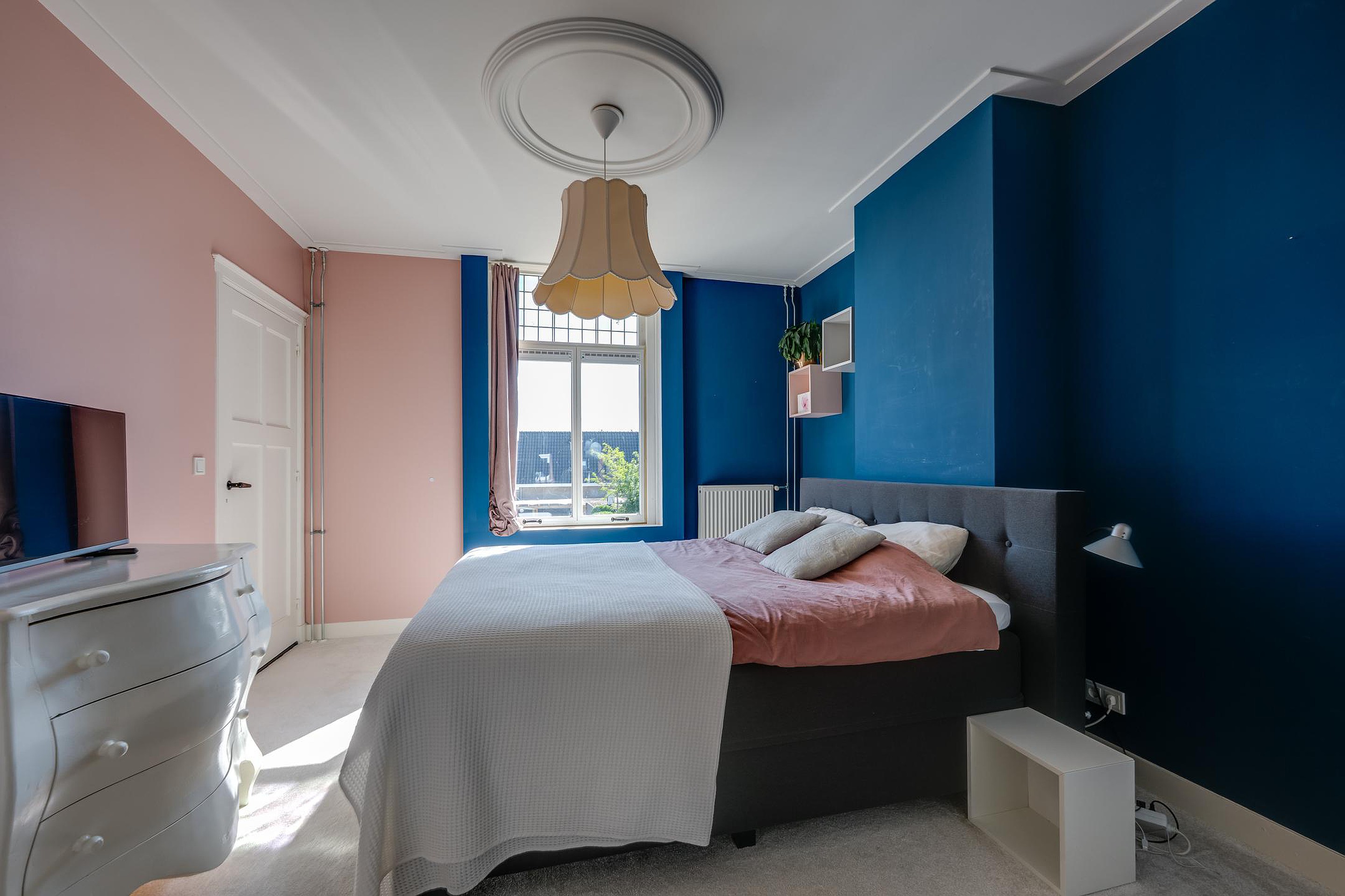 Deze slaapkamer (4,54 m. x 3,66 m.) ligt aan de achterzijde van de woning en wordt van de voorkamer gescheiden door een twee dichte kamer en suitekasten met sfeervolle glas in lood schuifdeuren. Het plafond is v.v. sierlijsten en ornamenten, de wanden zijn glad afgewerkt en er ligt een comfortabele, lichte vloerbedekking. De originele hardhouten schuiframen zijn v.v. HR++ glas en het originele glas in lood bovenin is weer netjes in dubbel glas gezet.