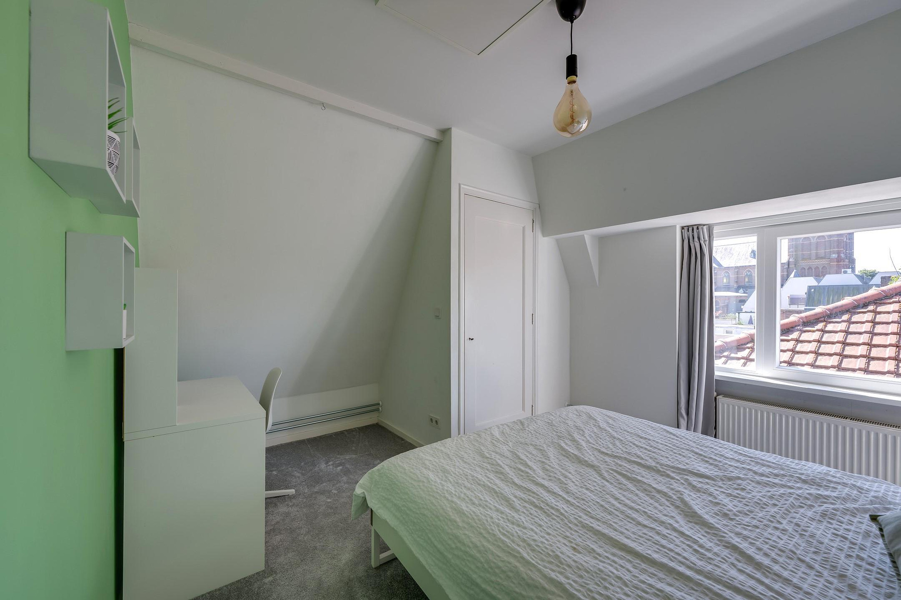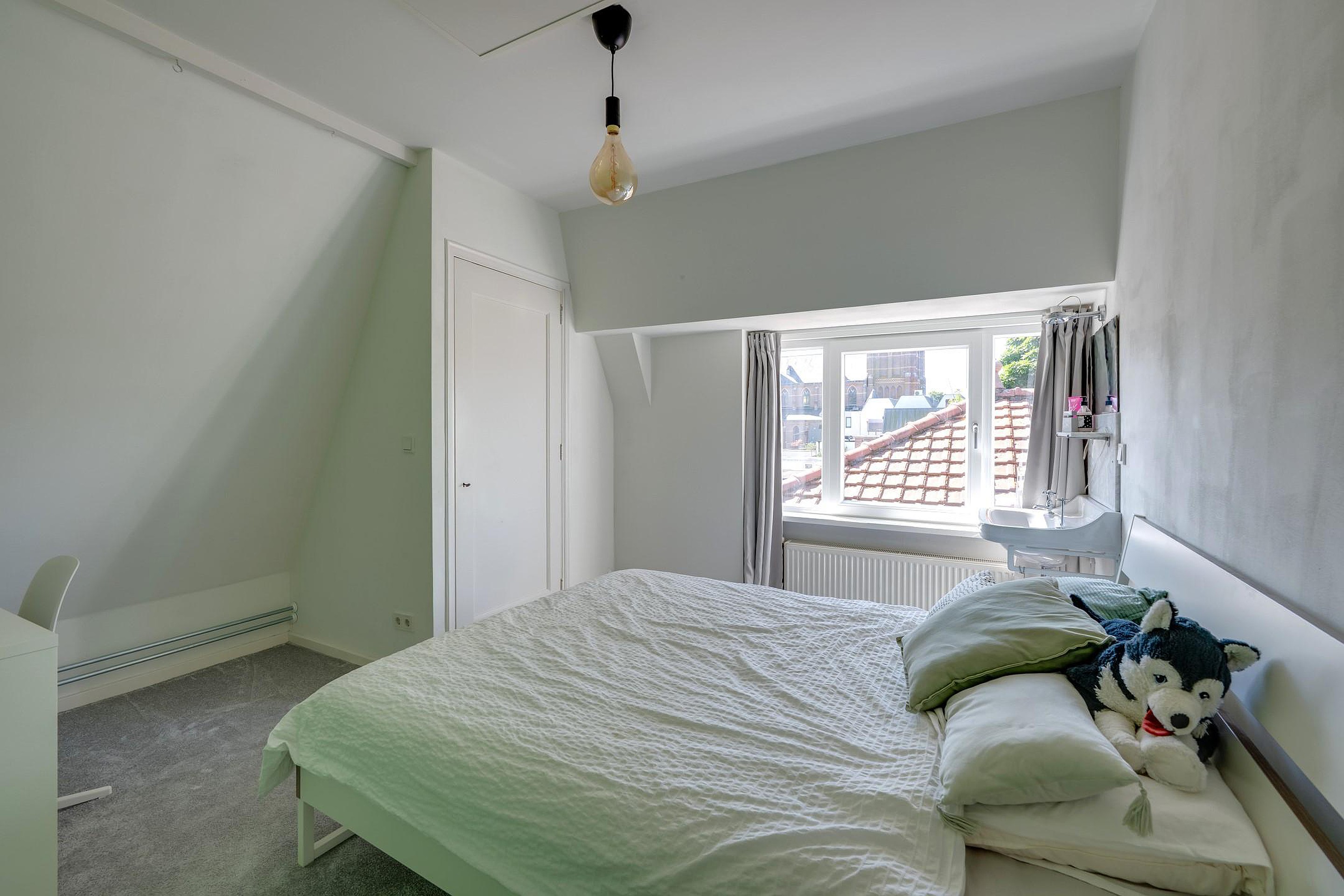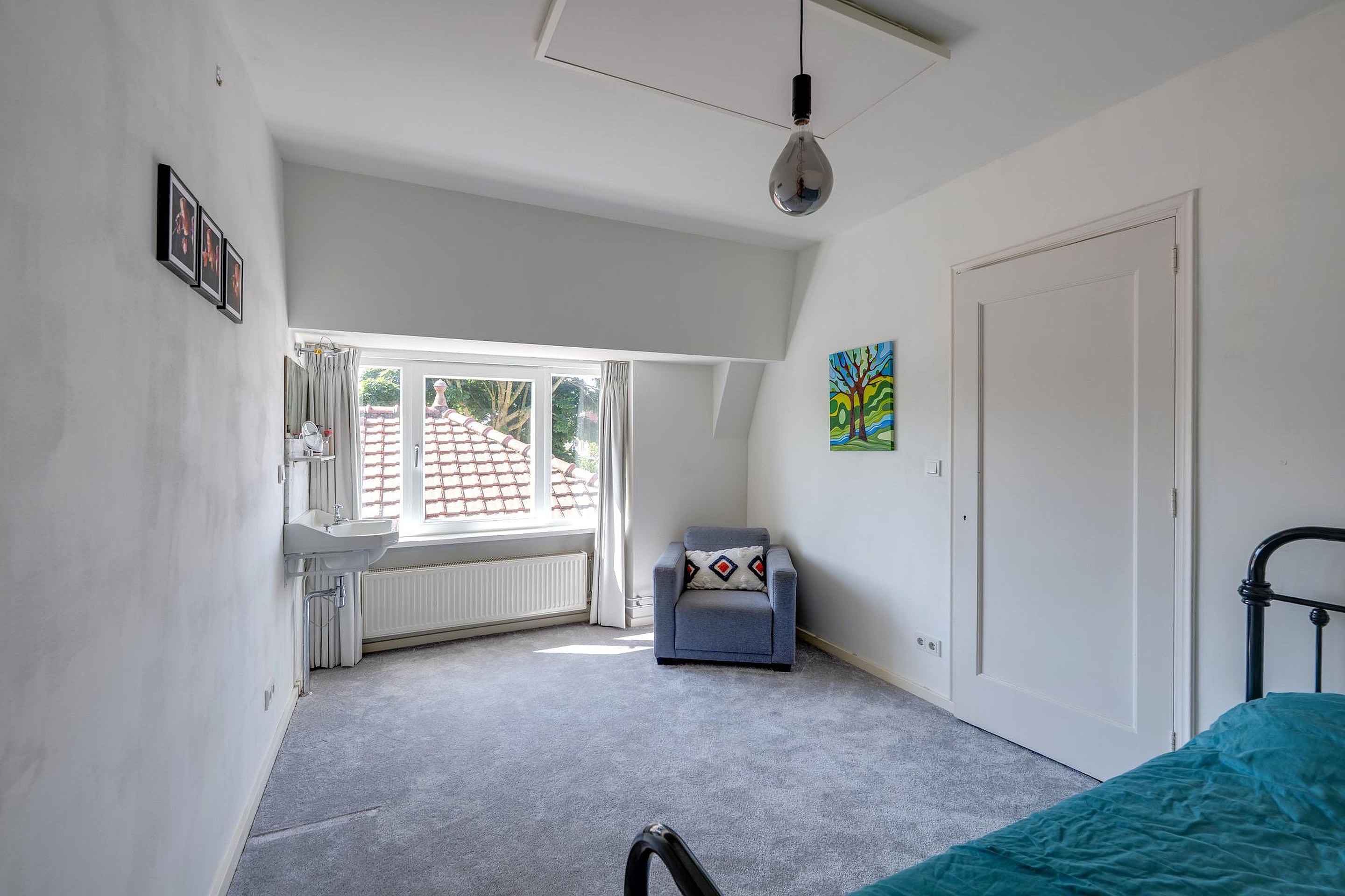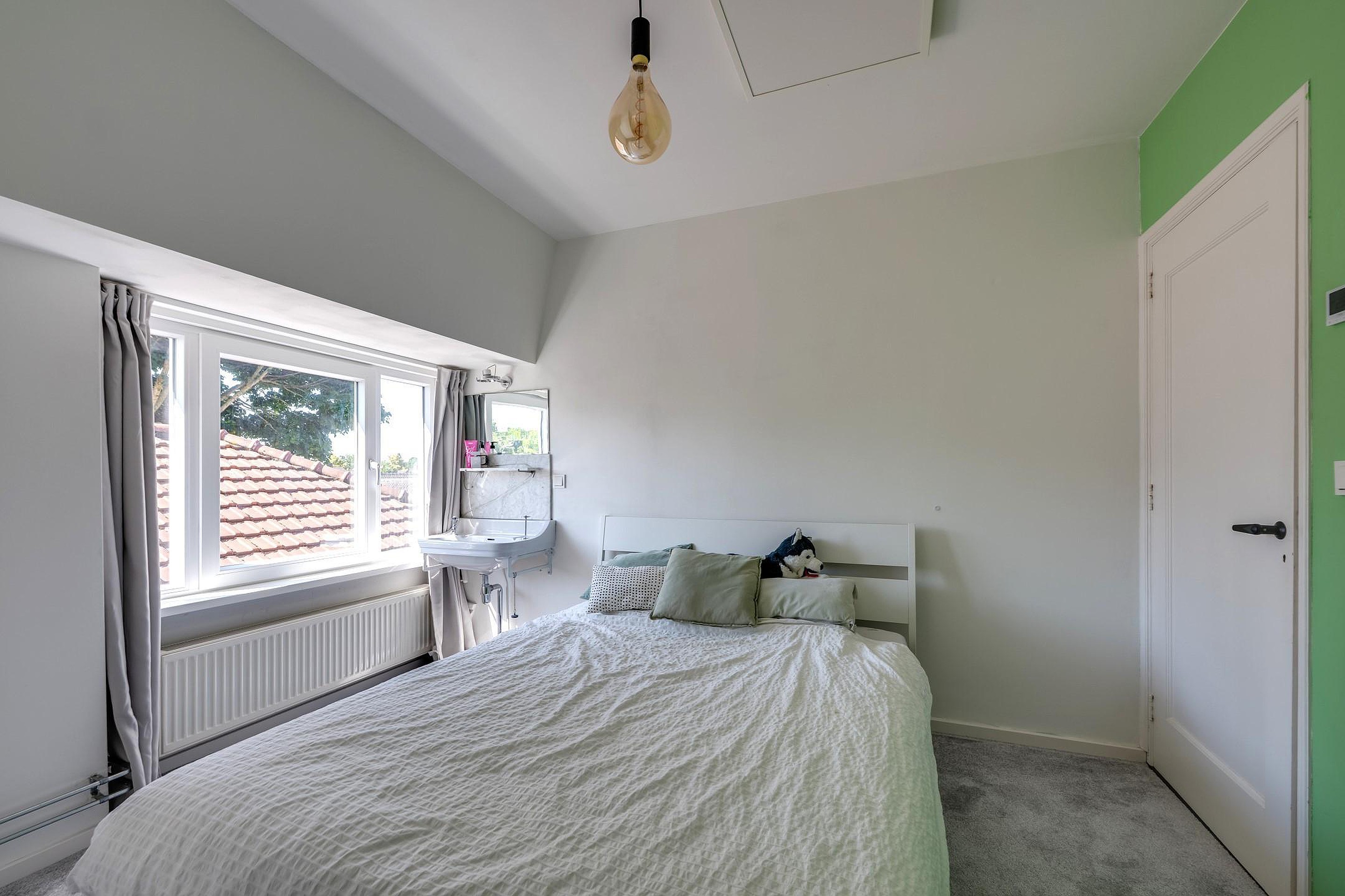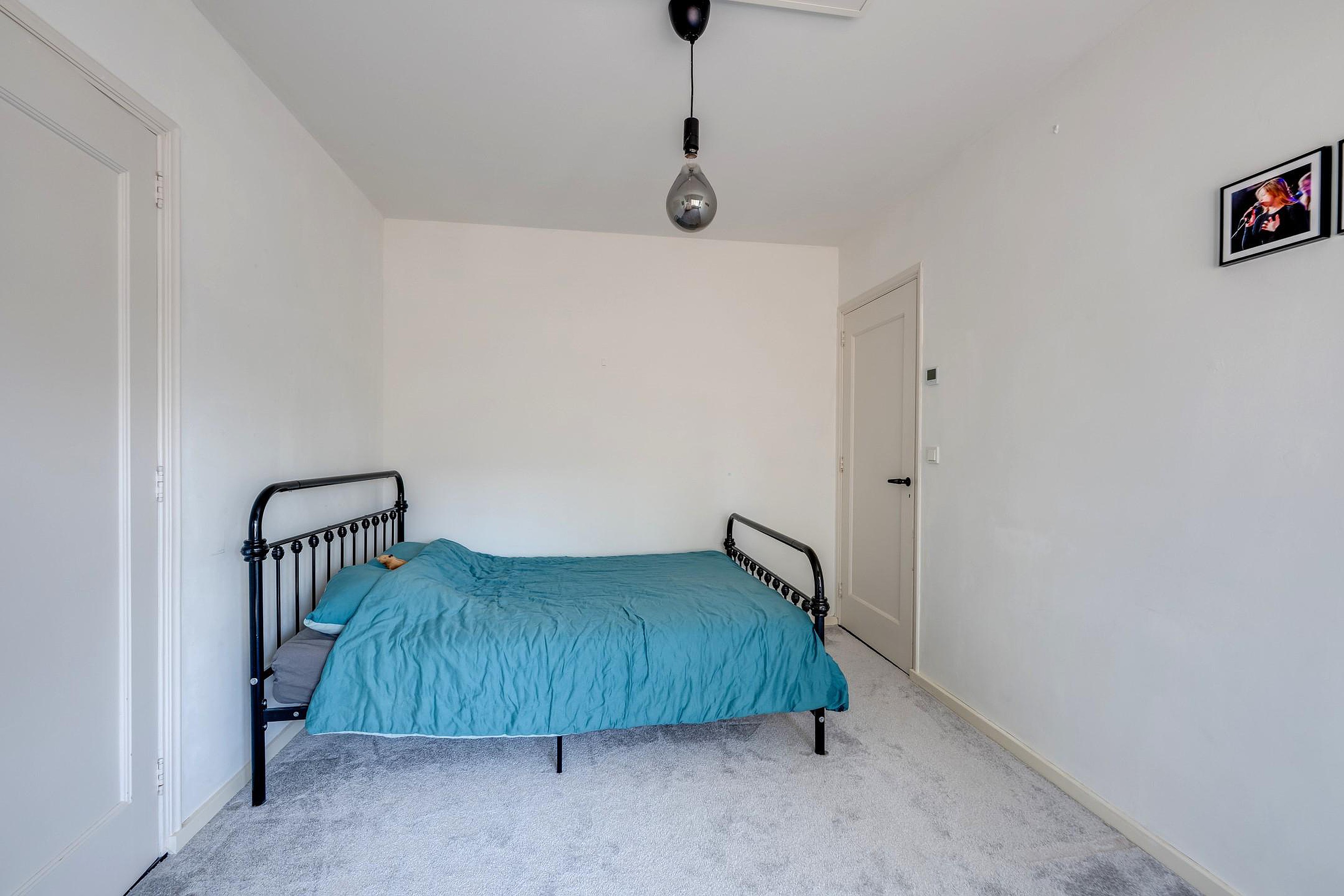 Deze slaapkamer (4,54 m. x 3,66 m.) ligt aan de achterzijde van de woning en wordt van de voorkamer gescheiden door een twee dichte kamer en suitekasten met sfeervolle glas in lood schuifdeuren. Het plafond is v.v. sierlijsten en ornamenten, de wanden zijn glad afgewerkt en er ligt een comfortabele, lichte vloerbedekking. De originele hardhouten schuiframen zijn v.v. HR++ glas en het originele glas in lood bovenin is weer netjes in dubbel glas gezet.
