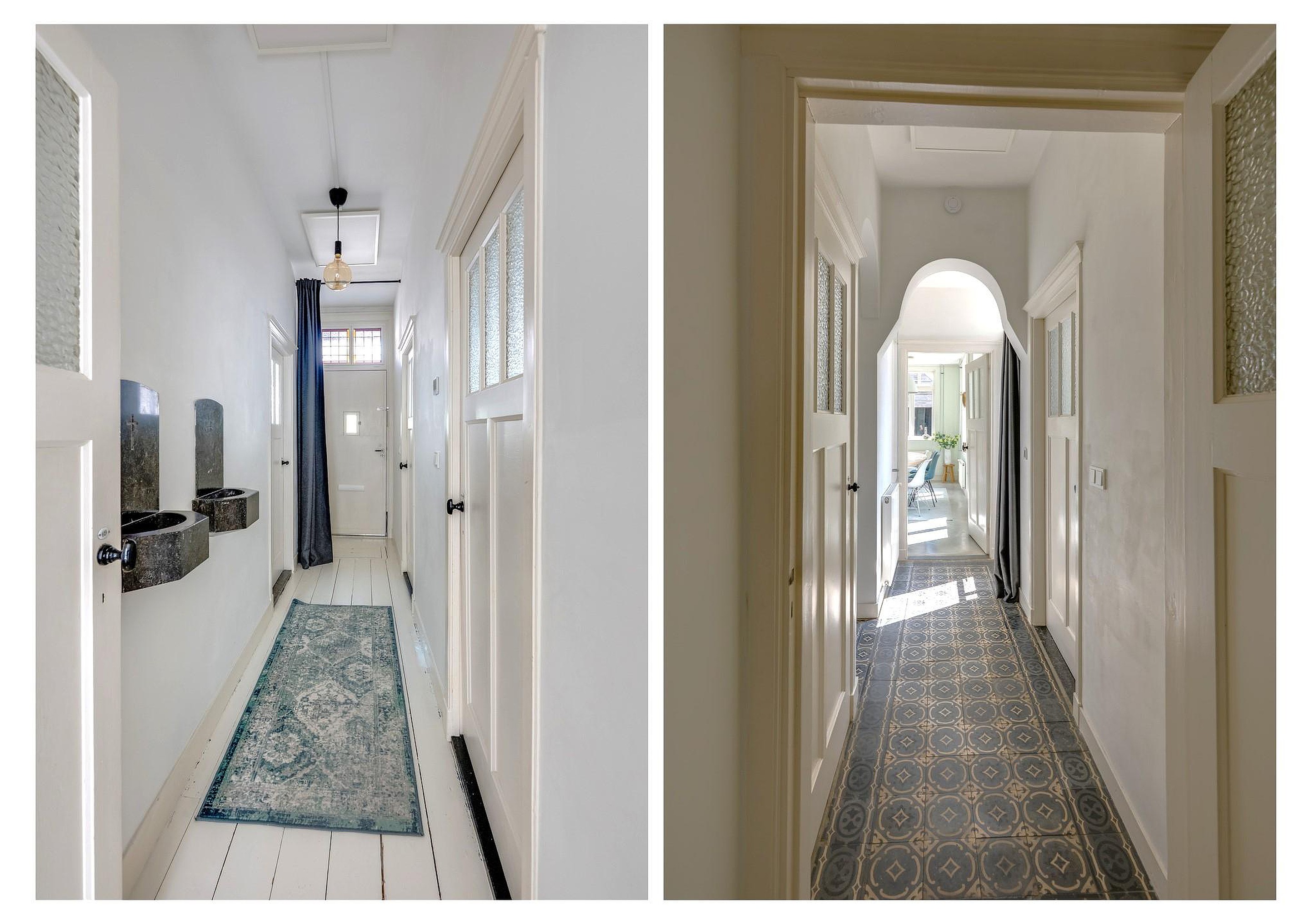 De lange hal, meer dan 8 meter, bestaat uit twee delen. Het voorste deel heeft een houten vloer en geeft toegang tot de voorkamer en suite, en de tv-kamer/kantoor met schuifdeuren naar de hal met de trapopgang naar de eerste verdieping.