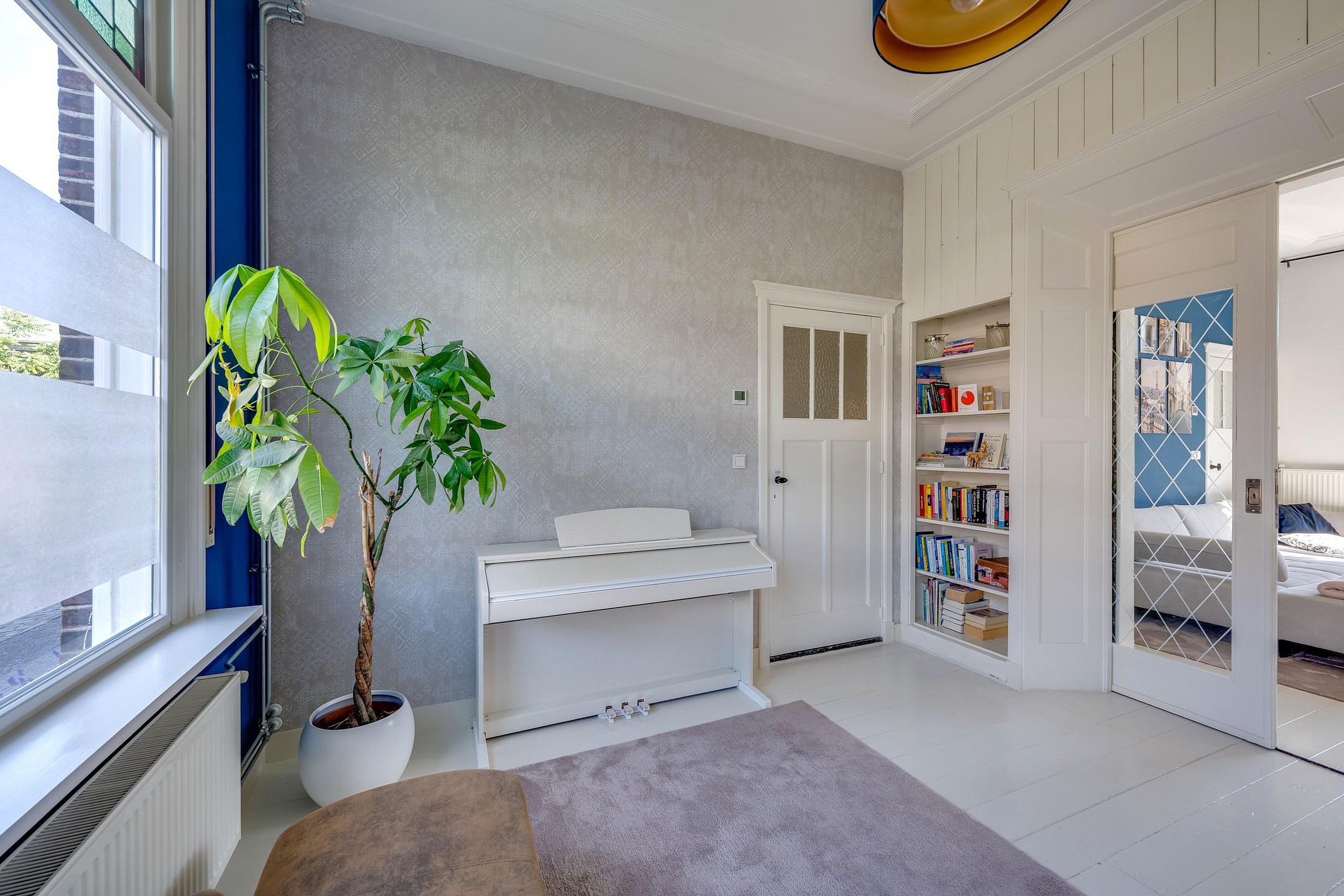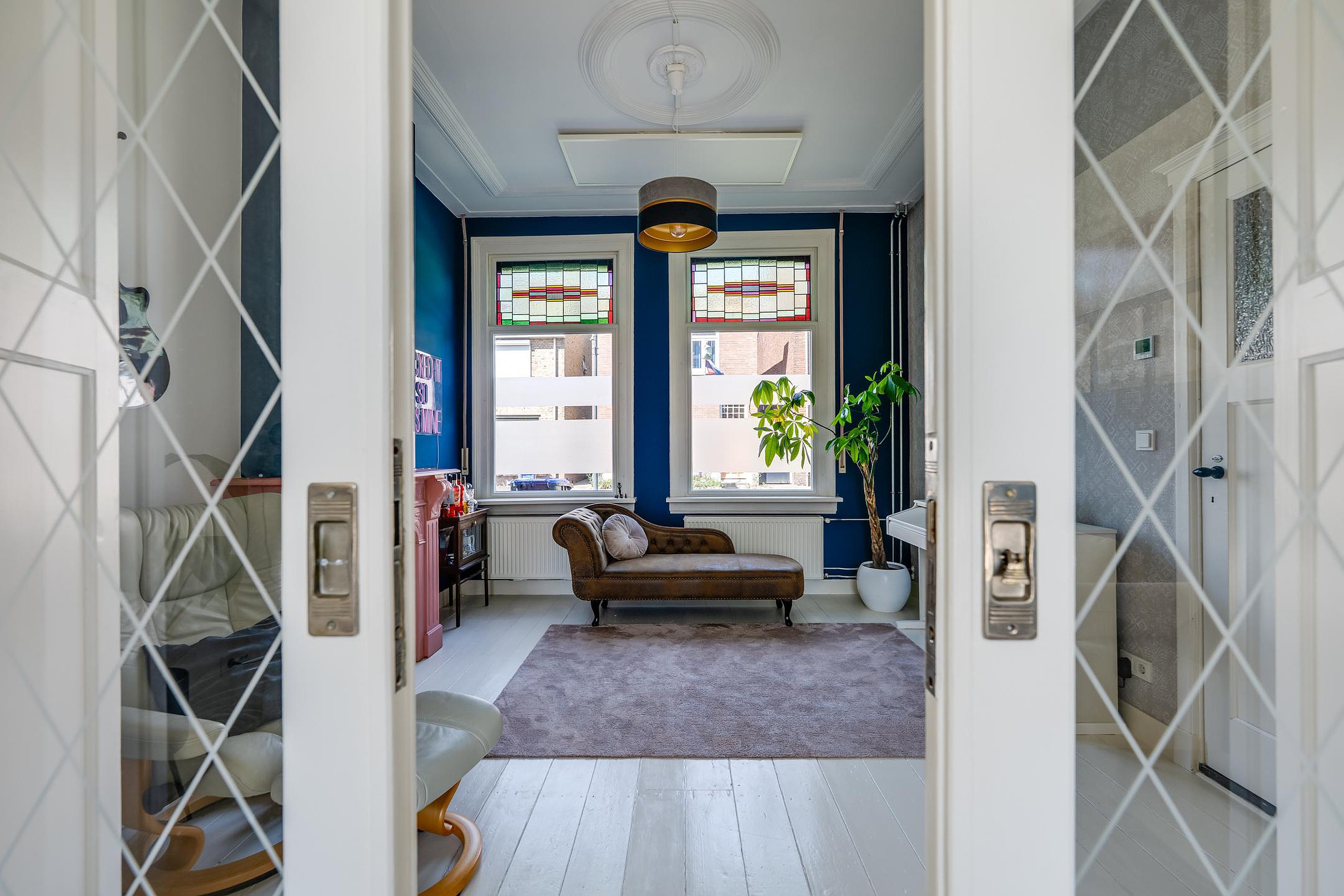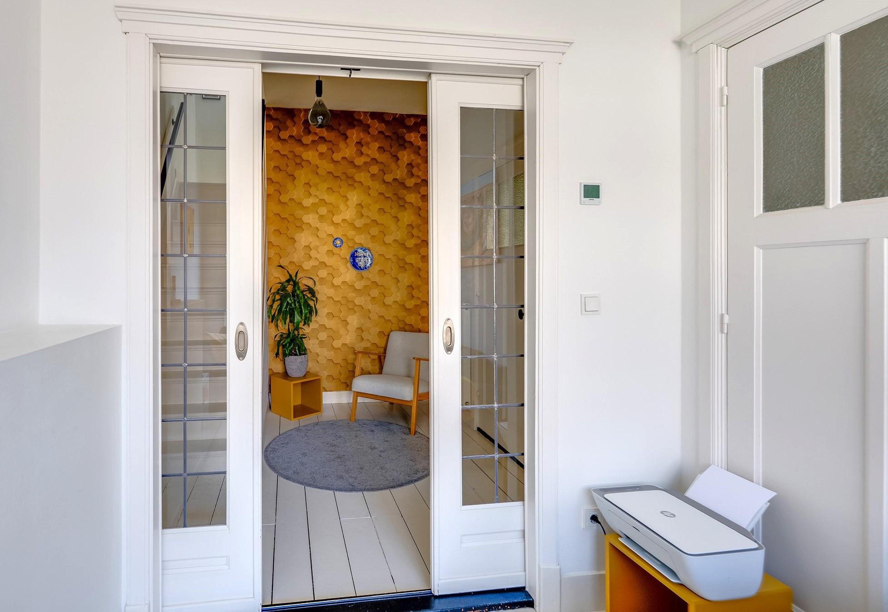 Aan de linkerzijde van dit prachtige herenhuis bevindt zich een elegante kamer (3,34 m. x 2,58 m.), die zowel vanuit de straat als vanuit de woning toegankelijk is. Deze veelzijdige ruimte leent zich perfect voor verschillende doeleinden, of het nu gaat om een gezellige tv-kamer, een sfeervolle woonruimte of een inspirerende werkkamer. Ook is deze kamer ideaal voor een beroep aan huis, waardoor u werk en privé moeiteloos kunt combineren. Tussen de hal, met de trapopgang erachter, vindt u schuifdeuren met authentiek glas-in-lood.