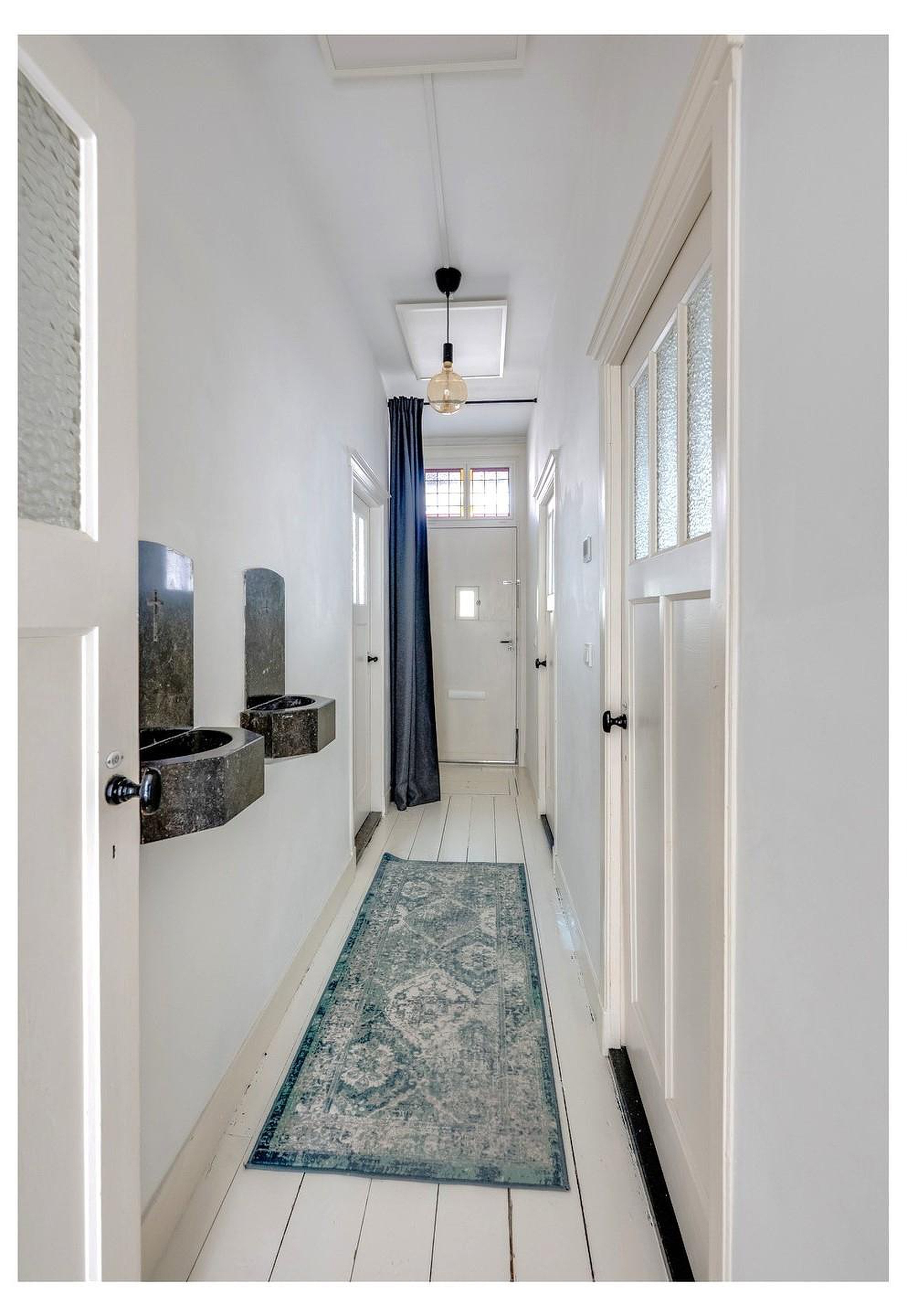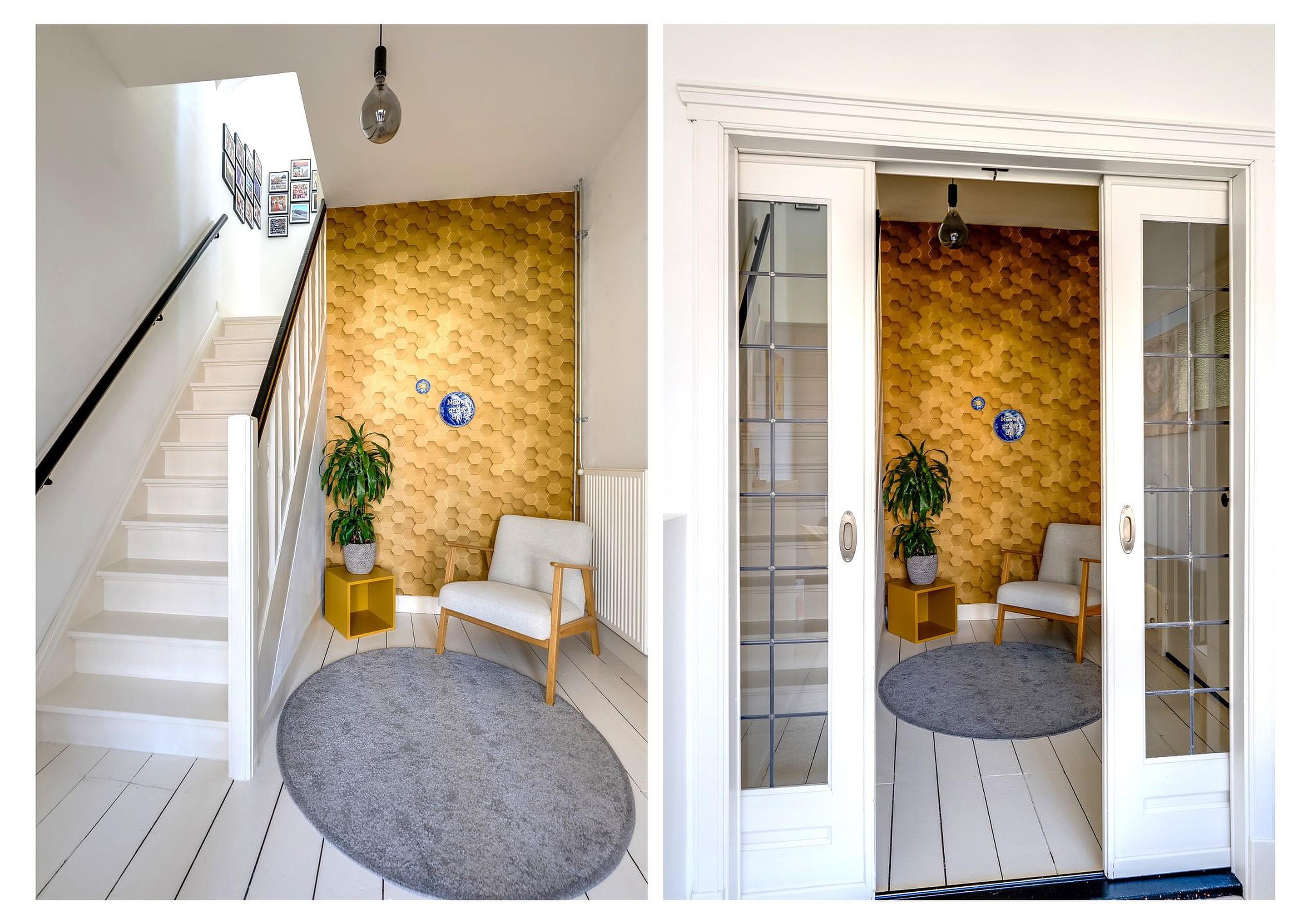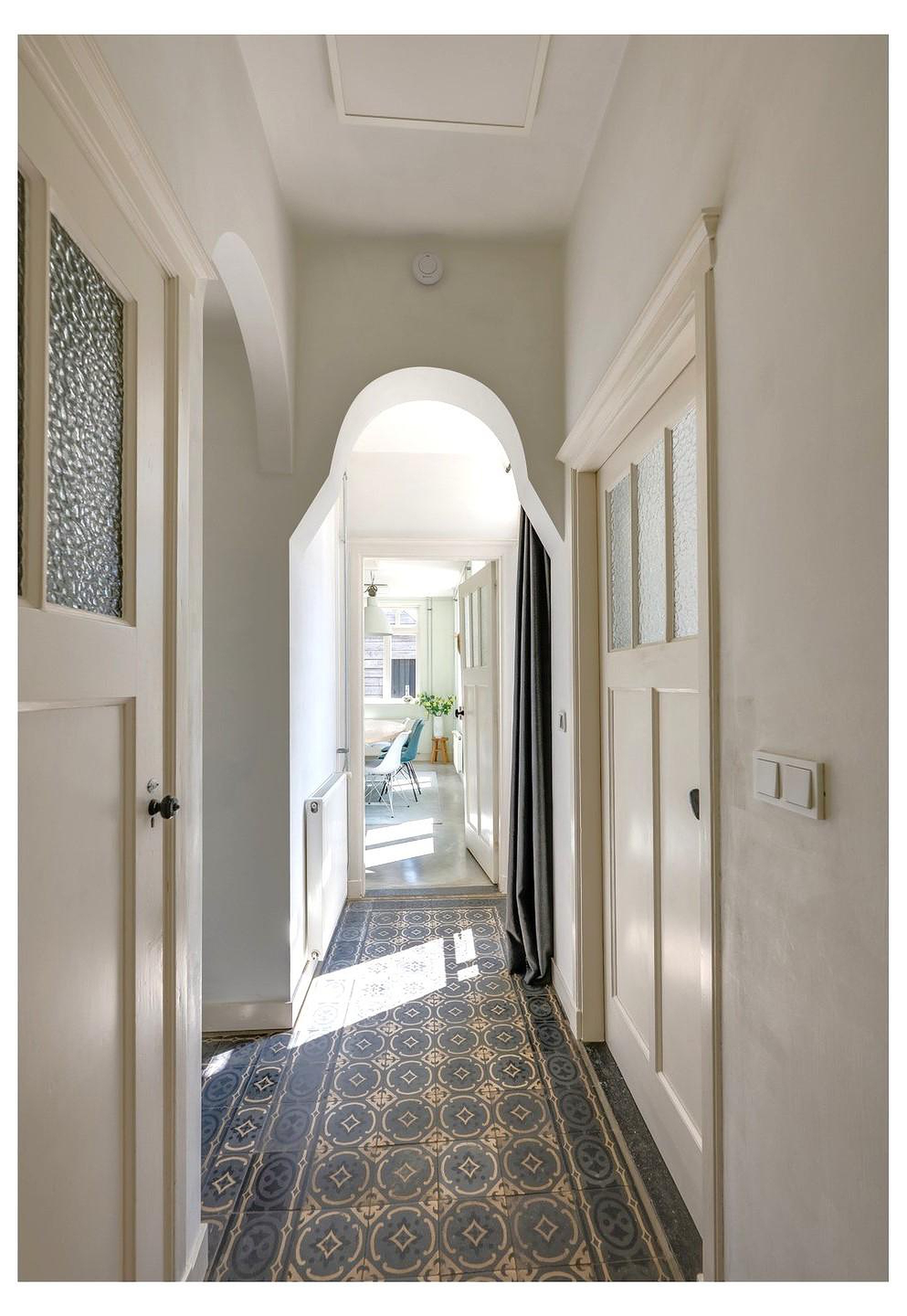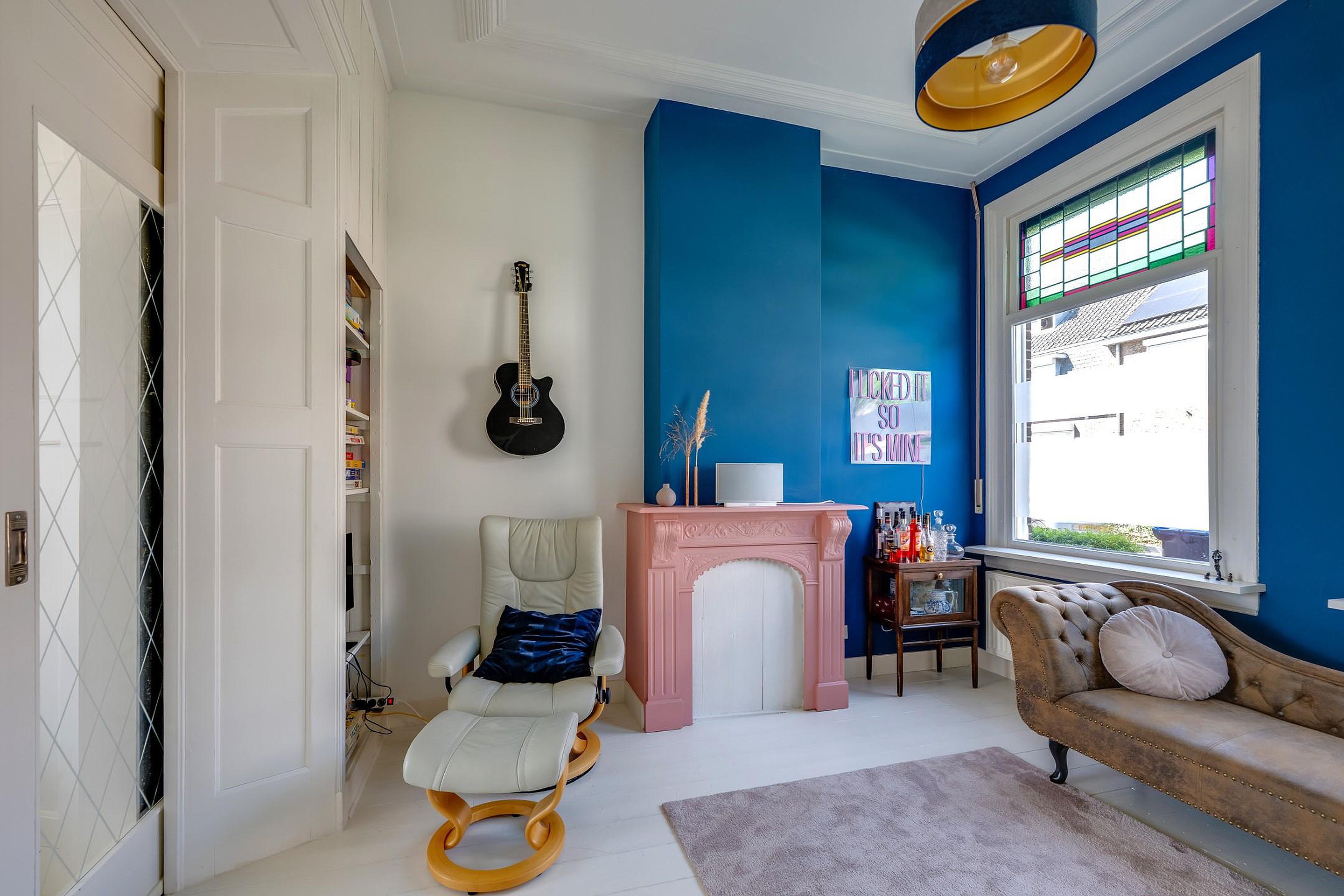 Aan de linkerzijde van dit prachtige herenhuis bevindt zich een elegante kamer (3,34 m. x 2,58 m.), die zowel vanuit de straat als vanuit de woning toegankelijk is. Deze veelzijdige ruimte leent zich perfect voor verschillende doeleinden, of het nu gaat om een gezellige tv-kamer, een sfeervolle woonruimte of een inspirerende werkkamer. Ook is deze kamer ideaal voor een beroep aan huis, waardoor u werk en privé moeiteloos kunt combineren. Tussen de hal, met de trapopgang erachter, vindt u schuifdeuren met authentiek glas-in-lood.