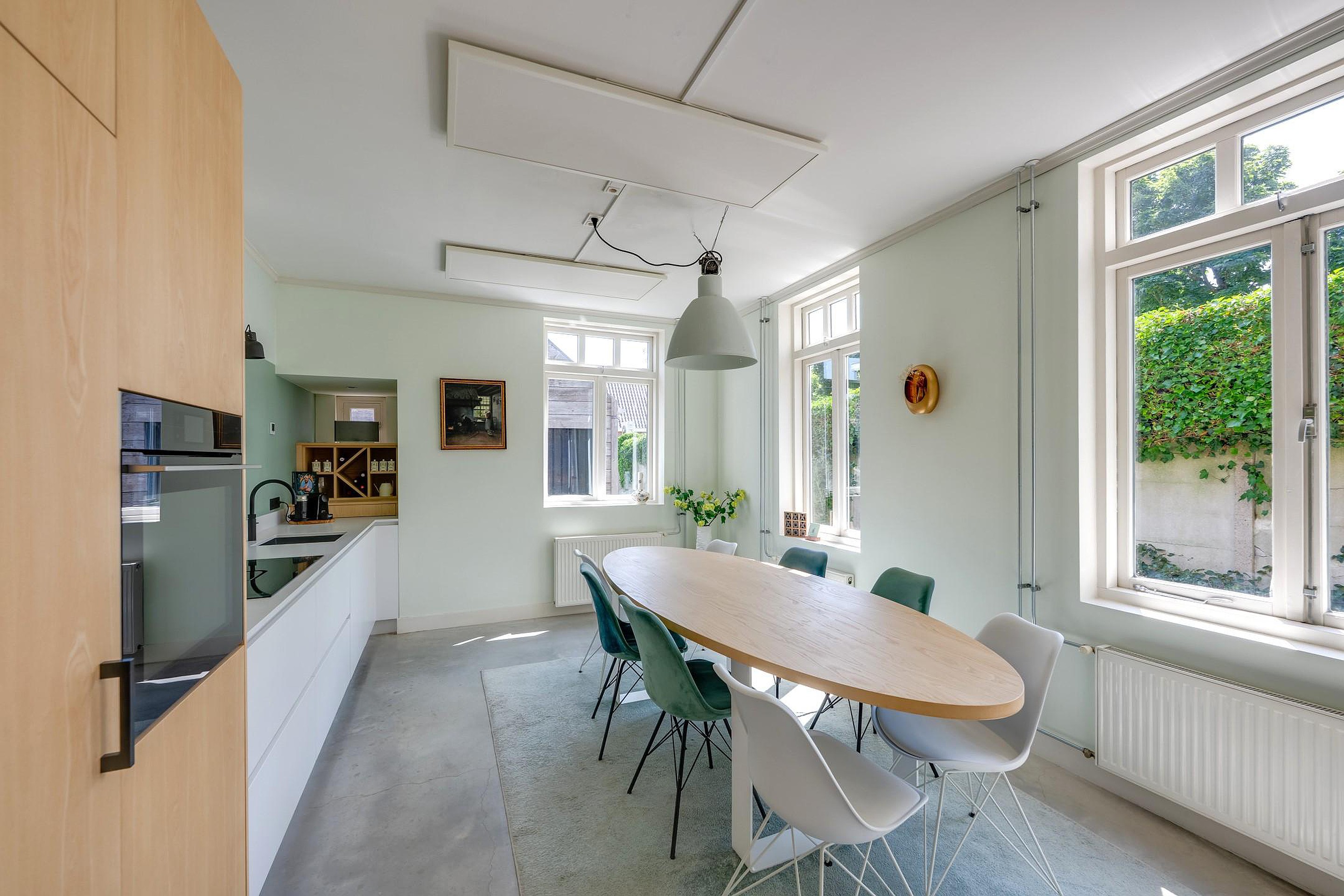 Deze prachtige woonkeuken (5,54 m. x 3,73 m.), vernieuwd in 2021, biedt een mooie combinatie van stijl en functionaliteit. De ruimte is voorzien van een strakke betonnen vloer en glad gestuukte wanden en plafonds, uitgerust met twee infraroodpanelen voor een aangename temperatuur. De originele houten kozijnen zijn opnieuw voorzien van HR++ glas, waarbij de charmante drie klepramen behouden zijn, ideaal om op een warme dag, mogelijk samen met één van de openslaande dubbele ramen, frisse lucht binnen te laten.