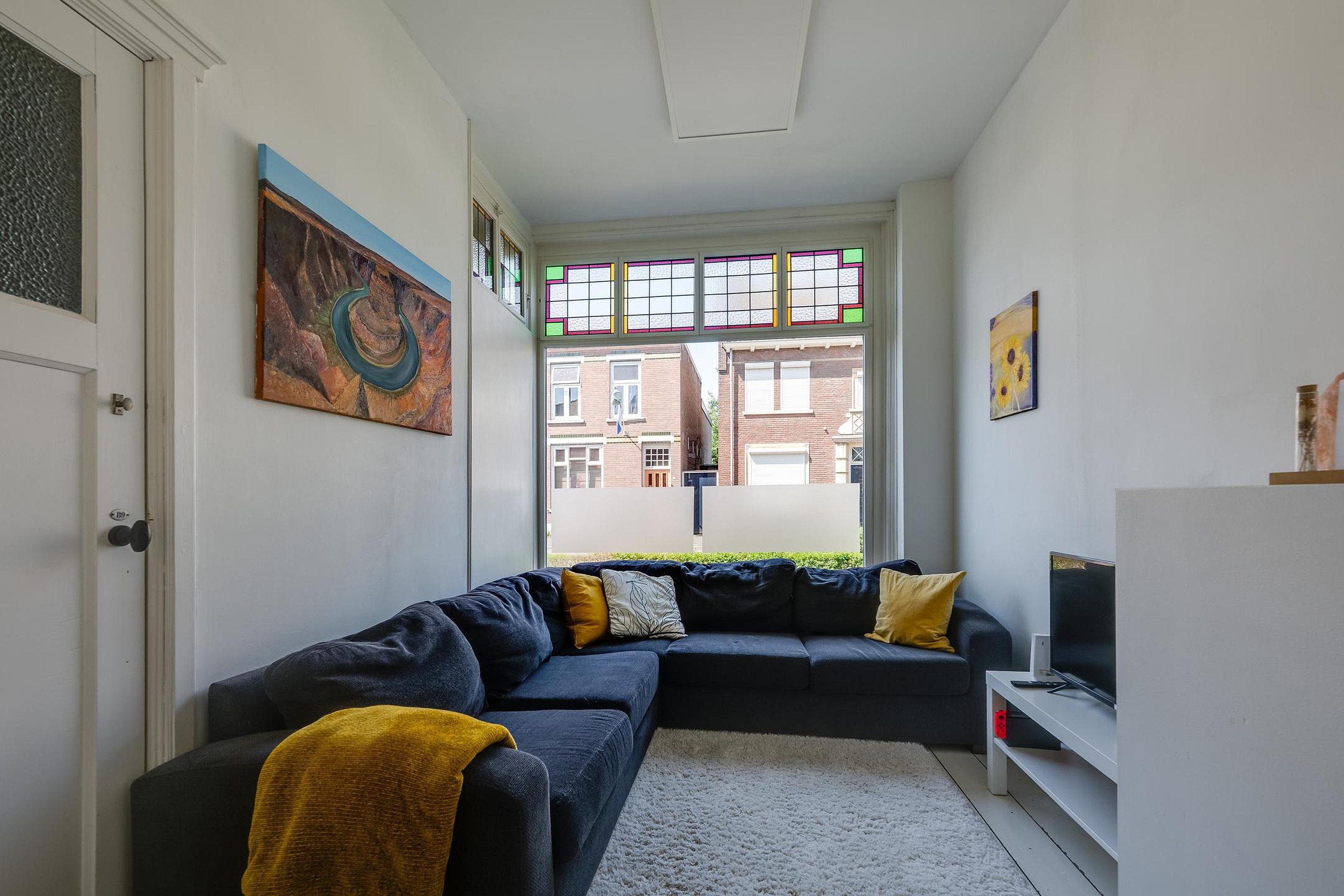 Aan de rechter voorzijde van de gang vindt u een tweede woonkamer (3,76 m. x 3,60 m.). In de voorkamer vindt u twee open kasten, een schouw en schuifdeuren met sierglas, welke toegang tot de achterkamer geven. Het fraaie ornamenten plafond is v.v. een infrarood paneel. De wanden zijn glad afgewerkt en er ligt een houten vloer. De fraaie kozijnen zijn ook v.v. glas in lood.