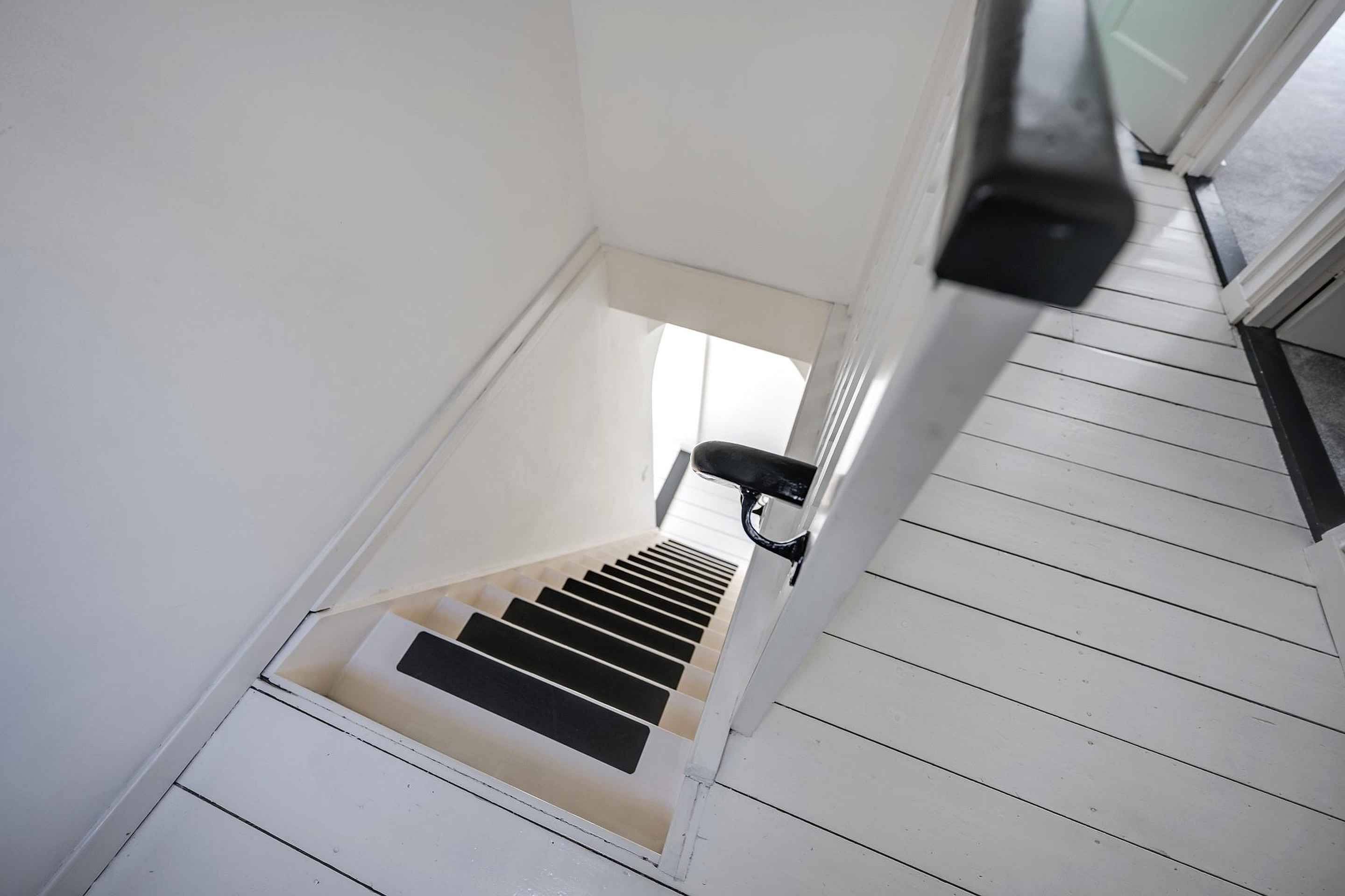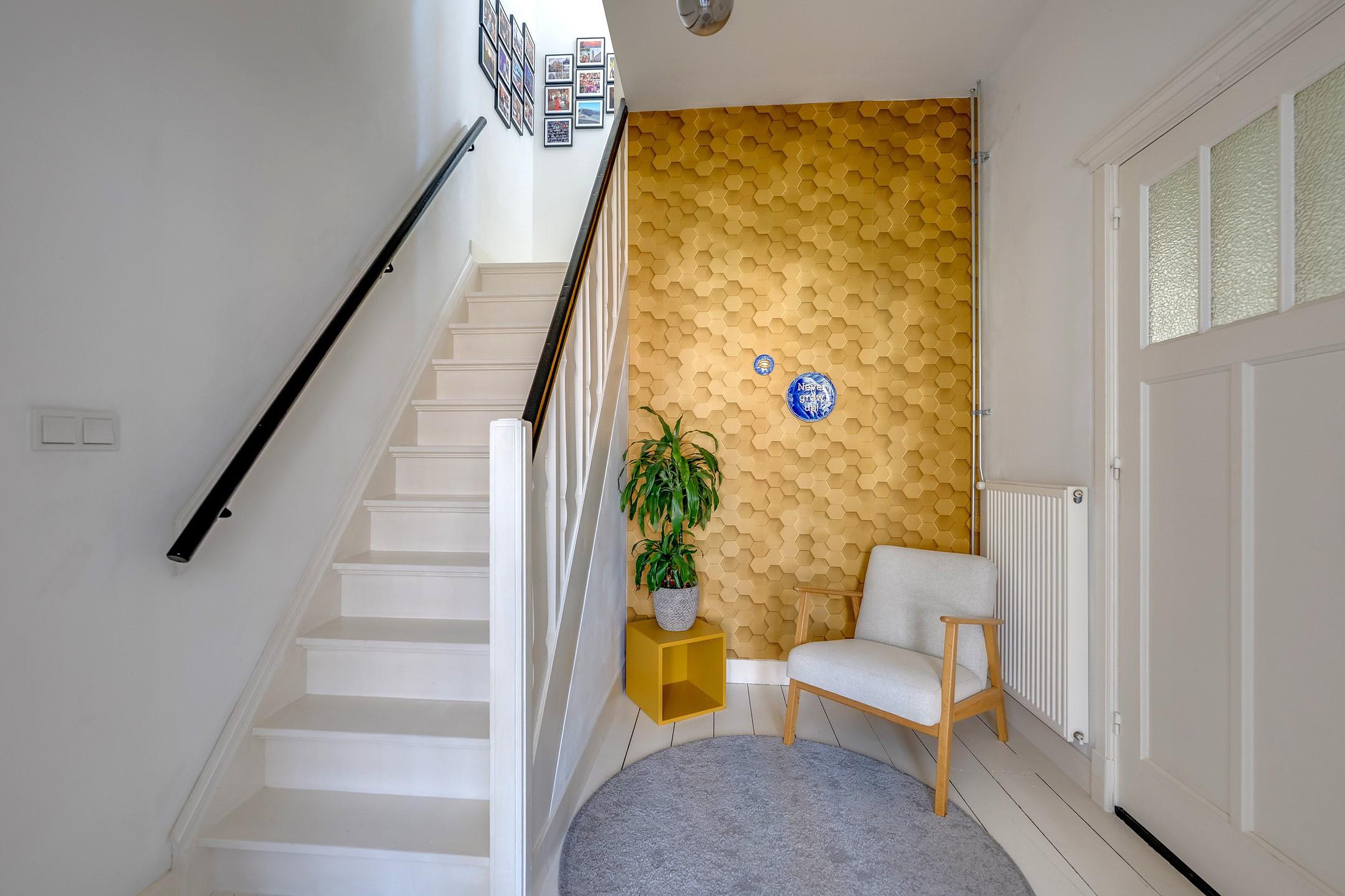 Deze tussenruimte (2,79 m. x 2,58 m.) is op meerdere manieren in te richten. Of u nu kiest voor een stijlvolle garderobe, een elegant dressoir of een mooie spiegel, deze ruimte kan volledig naar uw wens worden ingericht. Net als de rest van de begane grond is deze hal weer in stijl afgewerkt, wat bijdraagt aan de algehele uitstraling van de woning. Hier vindt u ook de bordestrap die naar de eerste verdieping leidt.