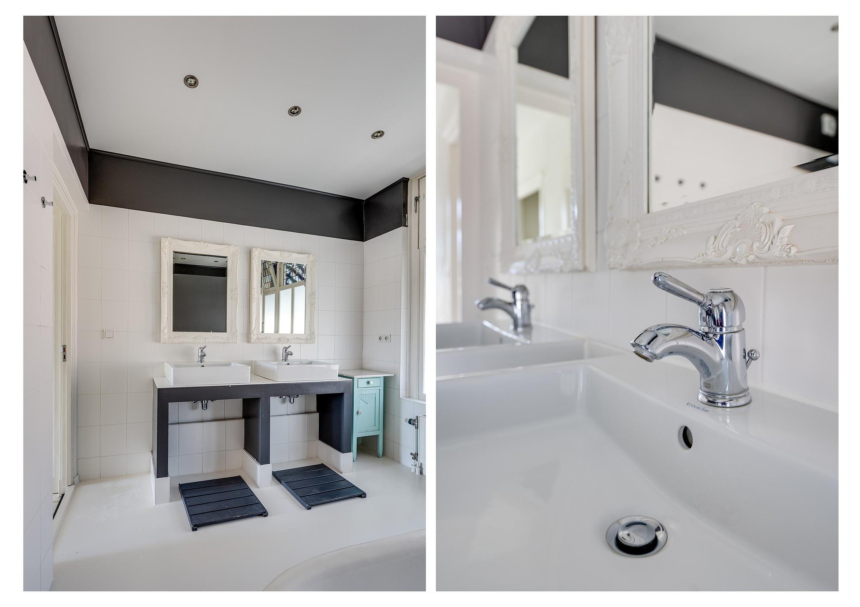 De badkamer (3,78 m. x 2,71 m.) ligt aan de voorzijde en heeft een witte betonvloer, de wanden zijn deels betegeld en v.v. glad stucwerk. De badkamer is v.v. een vrijstaand ligbad, een inloopdouche v.v. thermostaatkraan en een dubbel wastafelmeubel. Er zijn 2 elektrapunten en achter de douche heeft u extra opslagruimte. Verder is deze kamer weer in stijl afgewerkt, inclusief twee markiezen aan de voorzijde.