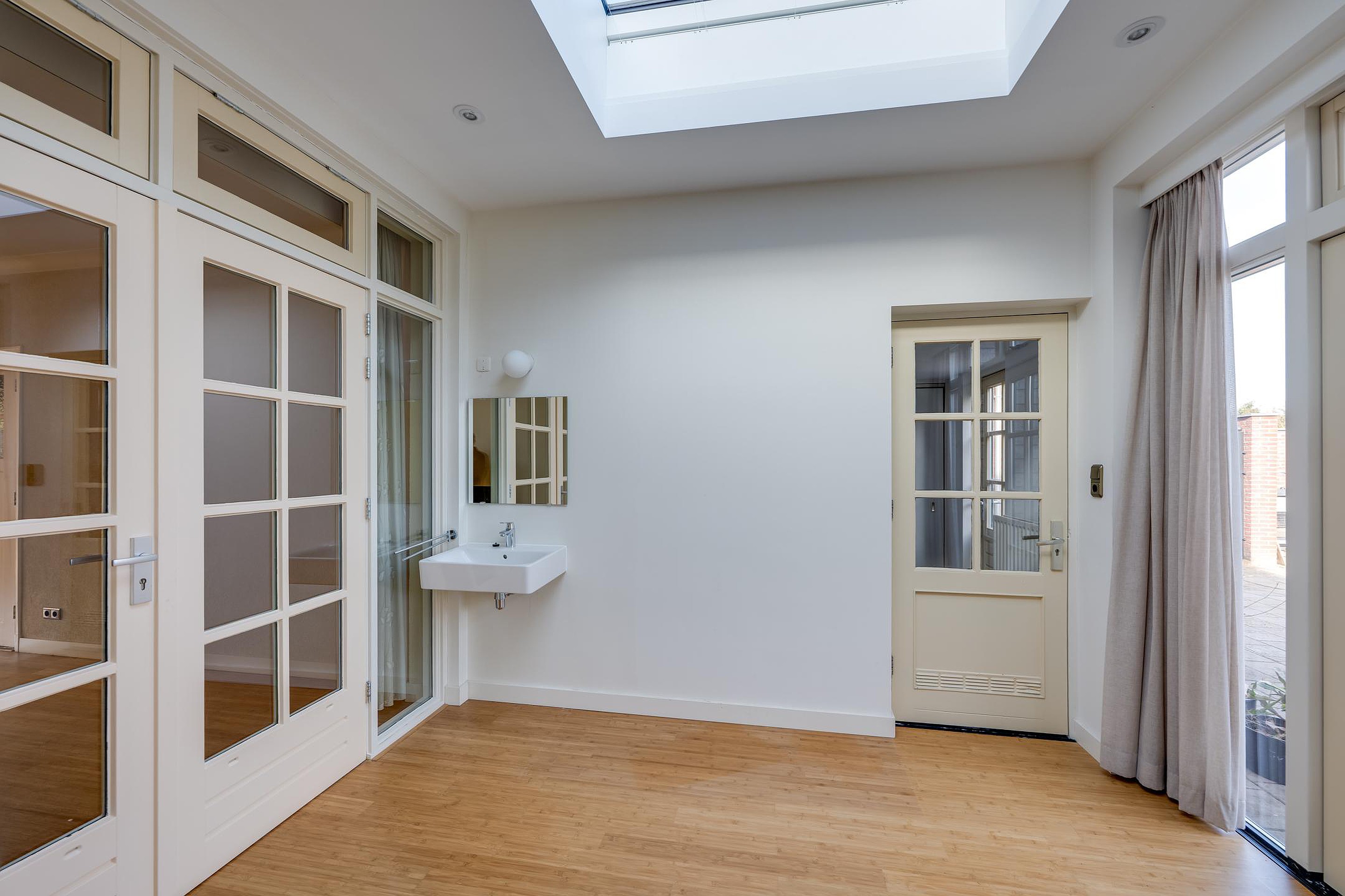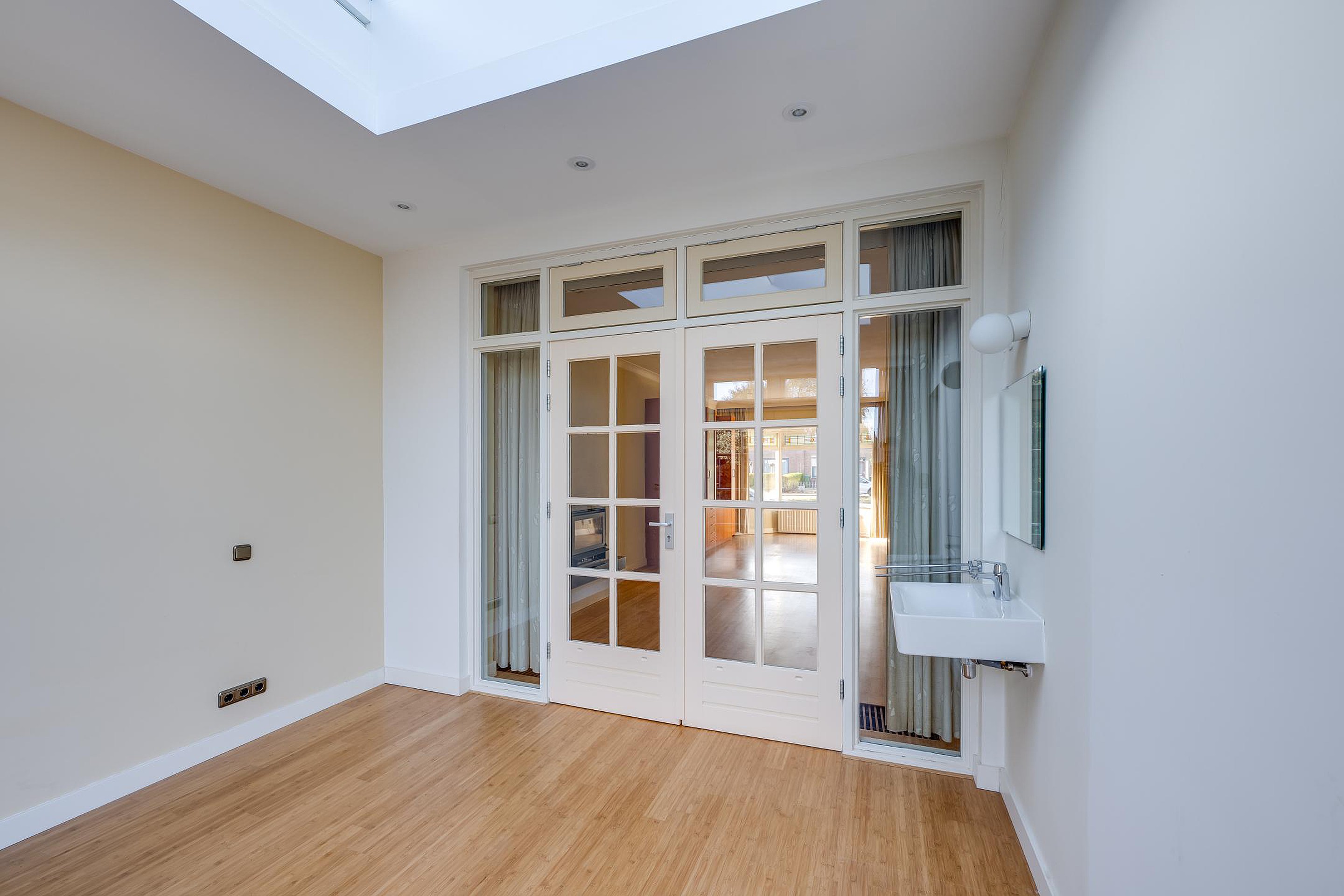 De achterkamer (3,57 m. x 3,24 m.) kan fungeren als eetkamer, speelkamer en heeft een wastafel omdat deze eerder ook als slaapkamer is gebruikt. Er ligt vloerverwarming en er is een lichtkoepel met een elektrisch bedienbaar plisségordijn. Aan de achterzijde vindt u twee openslaande deuren naar het terras. Vanuit deze kamer kunt u ook naar de bijkeuken.