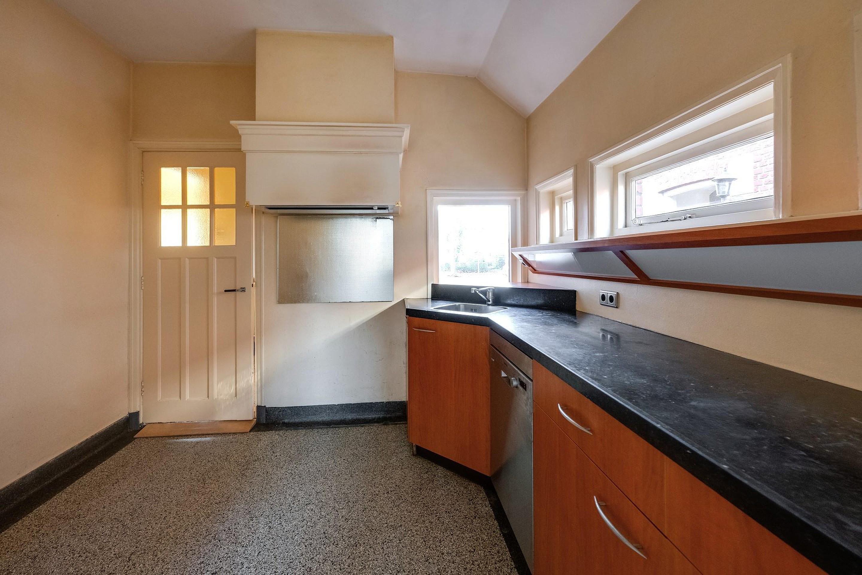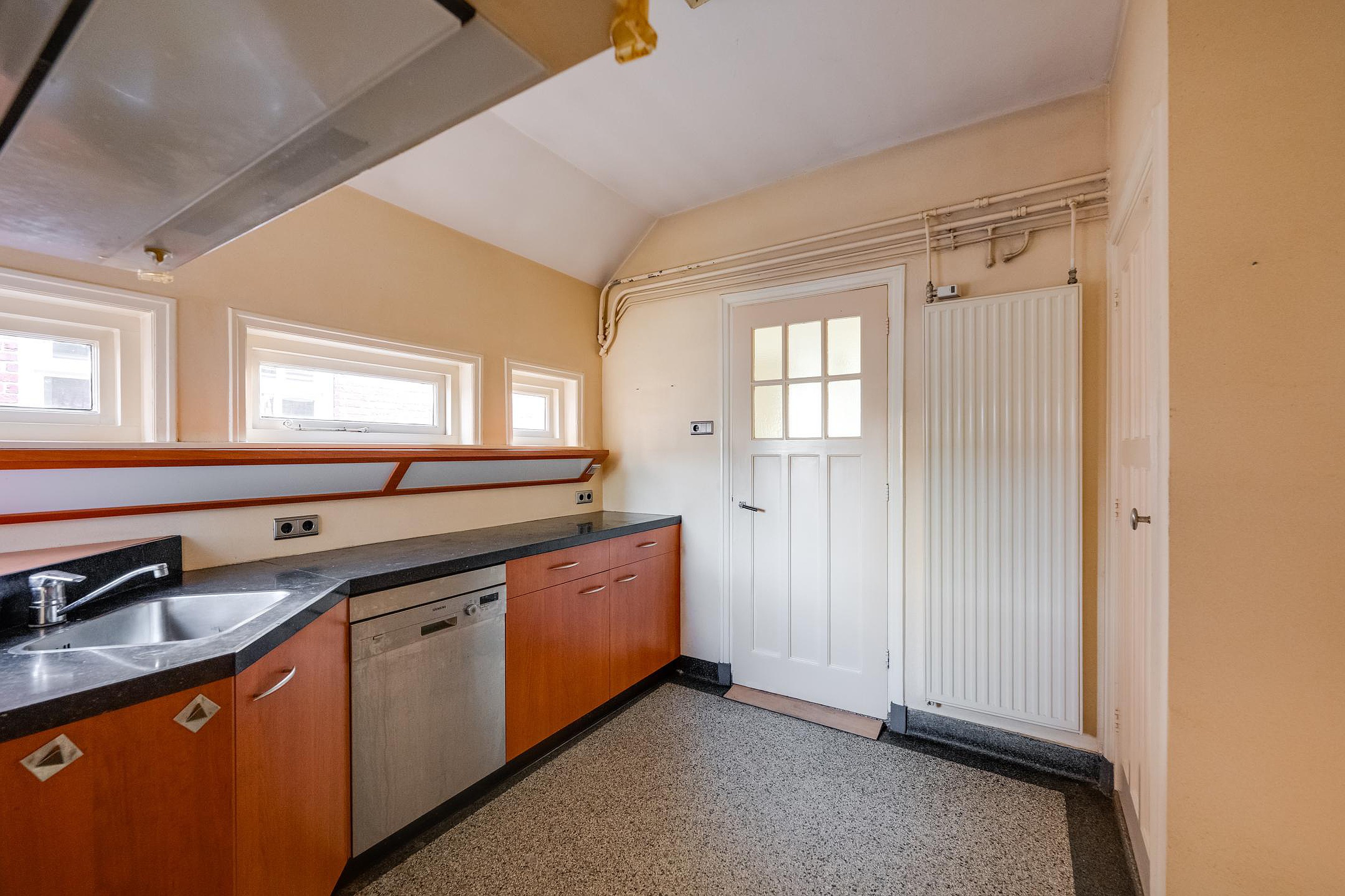 Deze keuken (3,20 m. x 2,98 m.) ligt aan de linkerzijde van de woning. Een raam (houten kozijn, dubbel glas) en 3 kleinere ramen (houten kozijnen, enkel glas) zorgen voor veel sfeer. De originele, granito vloer en originele paneeldeuren naar de vaste kast en bijkeuken worden afgewisseld met glad gestucte wanden en plafond. Het eenvoudige keukenblok is voorzien van een verhoogd natuurstenen werkblad.