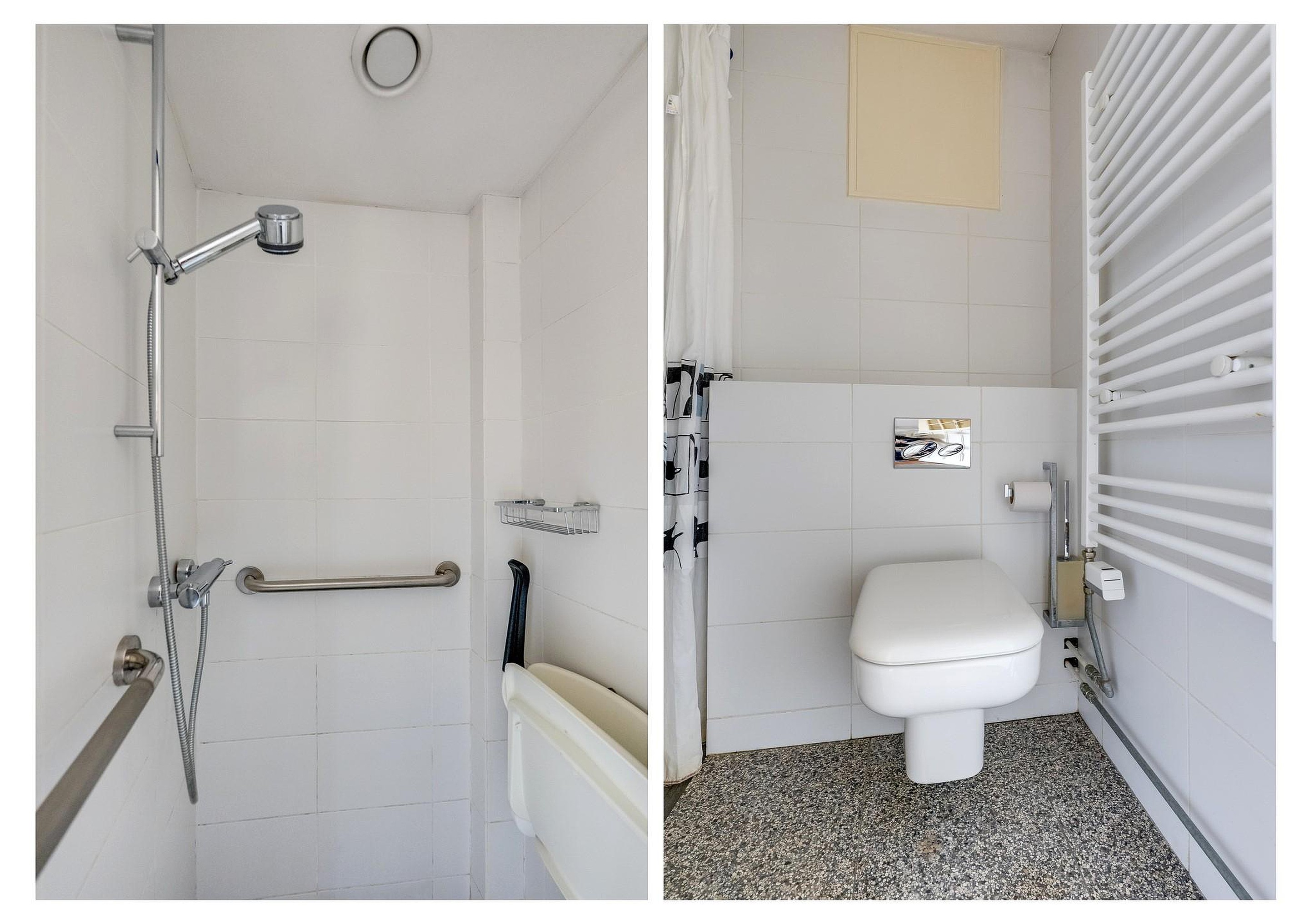 In deze geheel betegelde ruimte (1,76 m. x 1,10 m.) vindt u een zwevend closet en inloopdouche met thermostaatkraan.