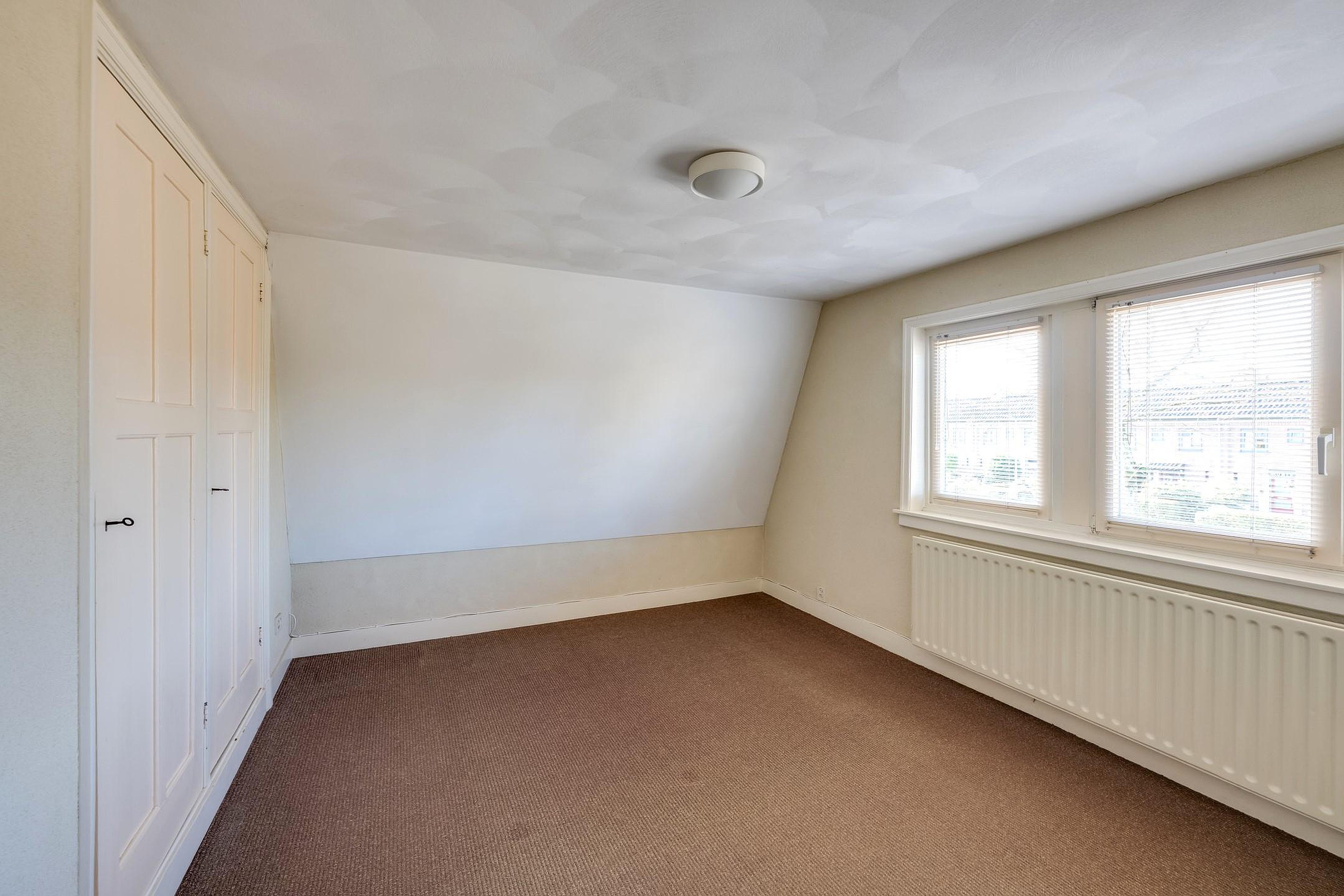 Deze slaapkamer (3,75 m. x 3,24 m.) ligt aan de voorzijde van de woning. De wanden zijn v.v. stucwerk en het plafond van schuurwerk. Het hardhouten kozijn is v.v. dubbel glas. Er zijn 2 inbouwkasten aanwezig.