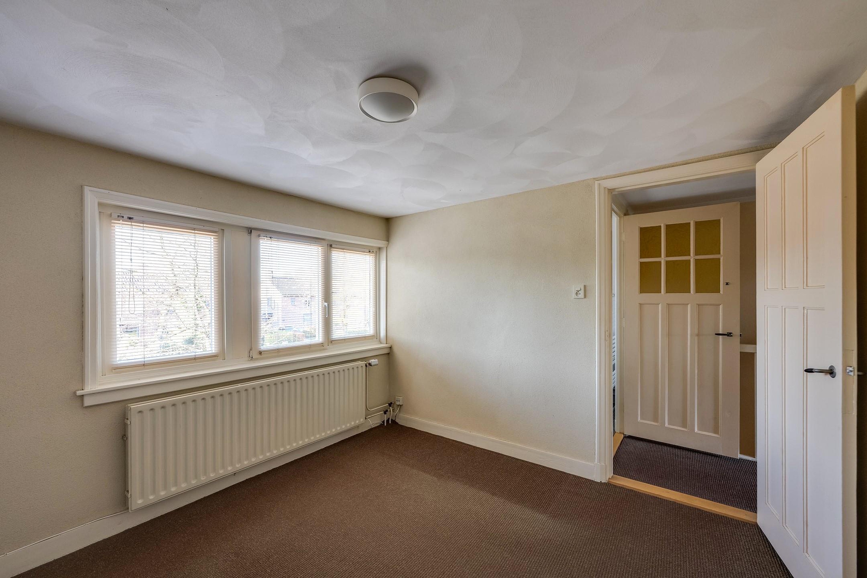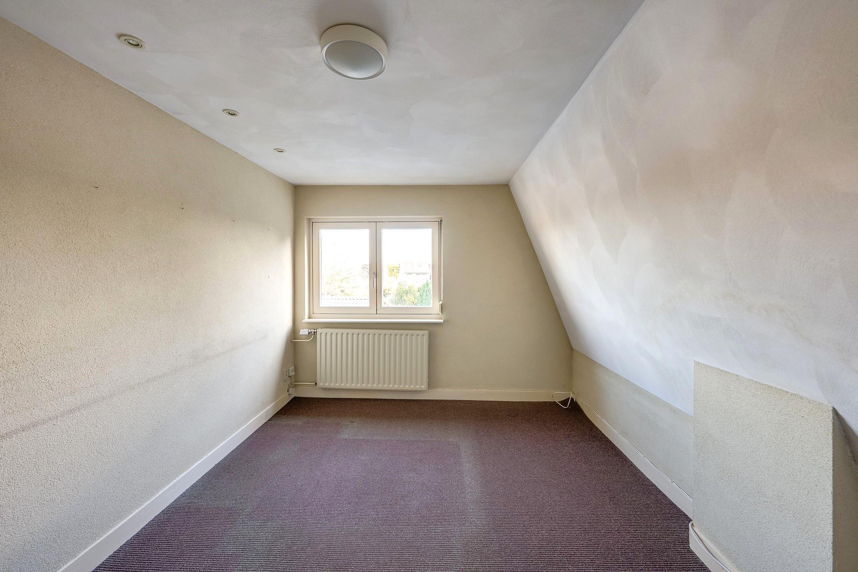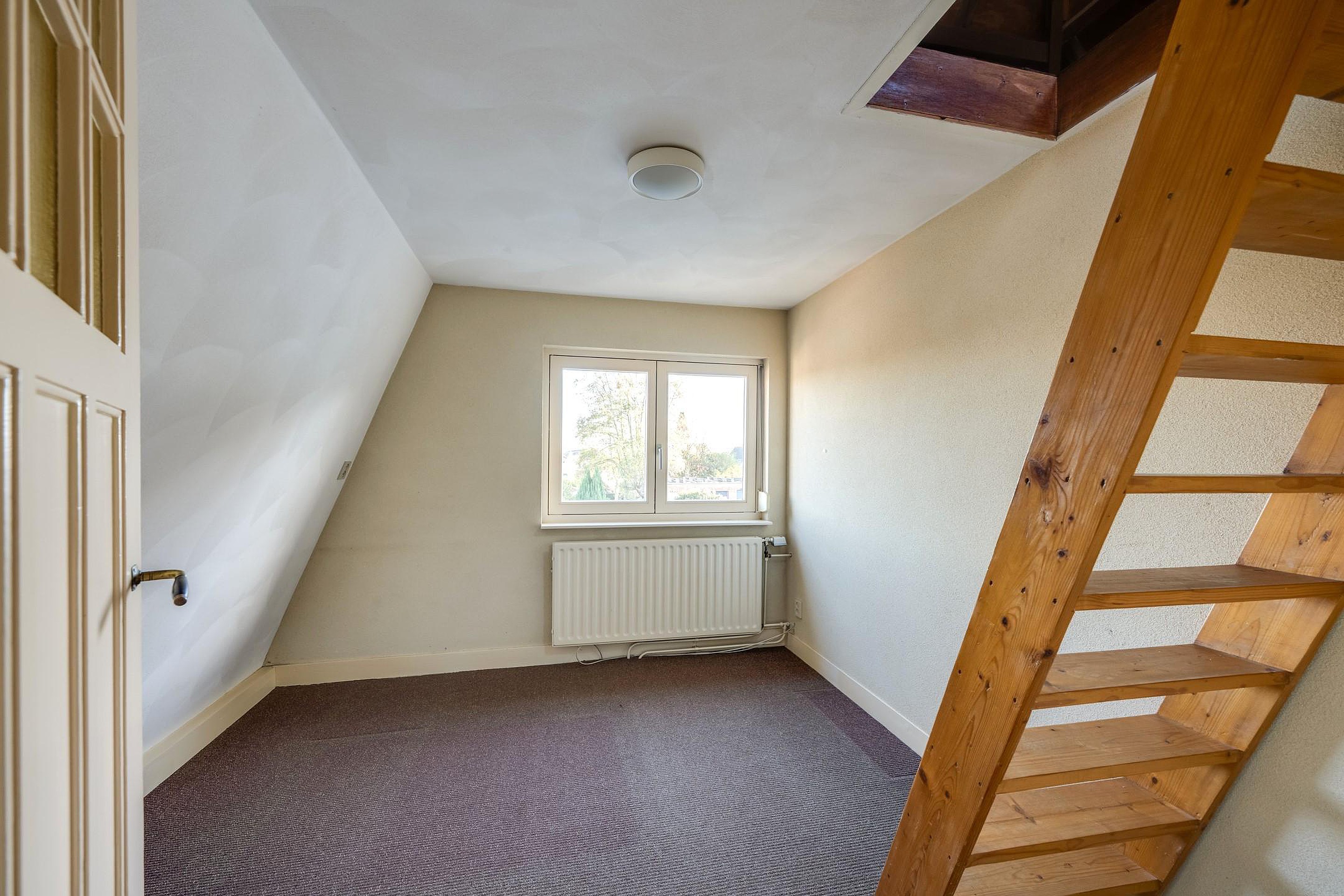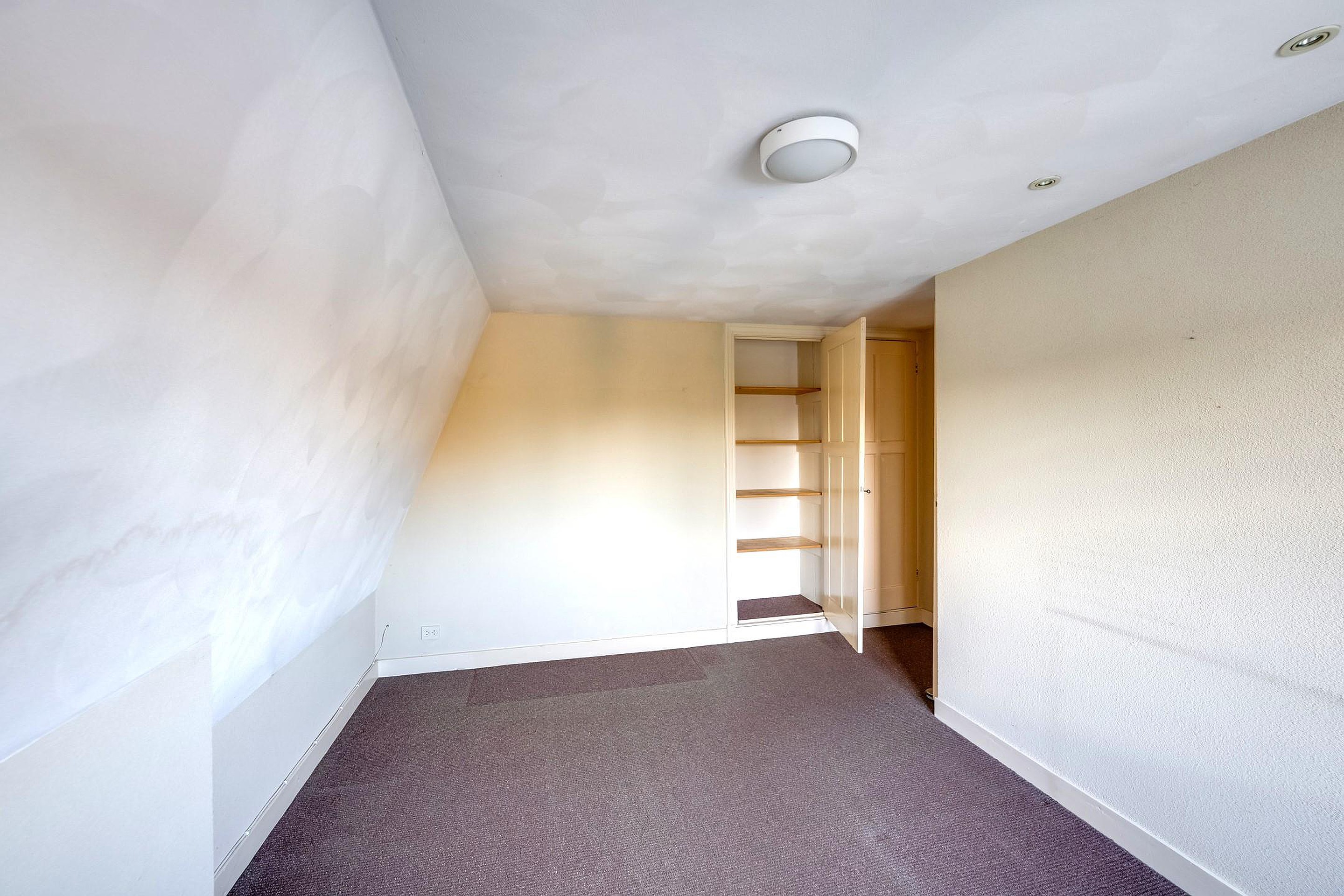 Deze slaapkamer (3,04 m. x 2,94 m.) ligt aan de achterzijde van de woning. De kamer is afgewerkt met stucwerk op de wanden en schuurwerk op het plafond. Het hardhouten kozijn is v.v. dubbel glas en een rolluik. Ook vindt u hier een trap naar de zolder. Deze is eenvoudig om te zetten naar een vlizotrap. De zolder is via een luik af te sluiten.