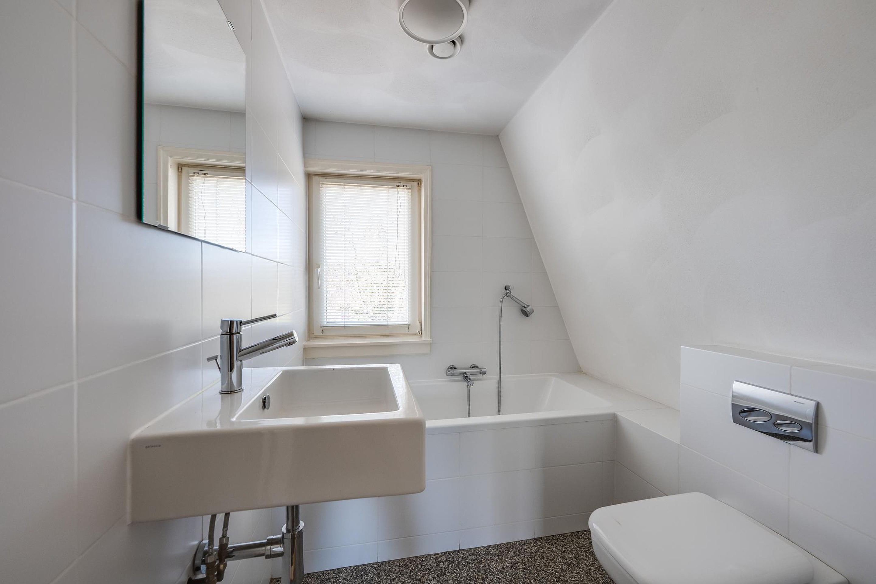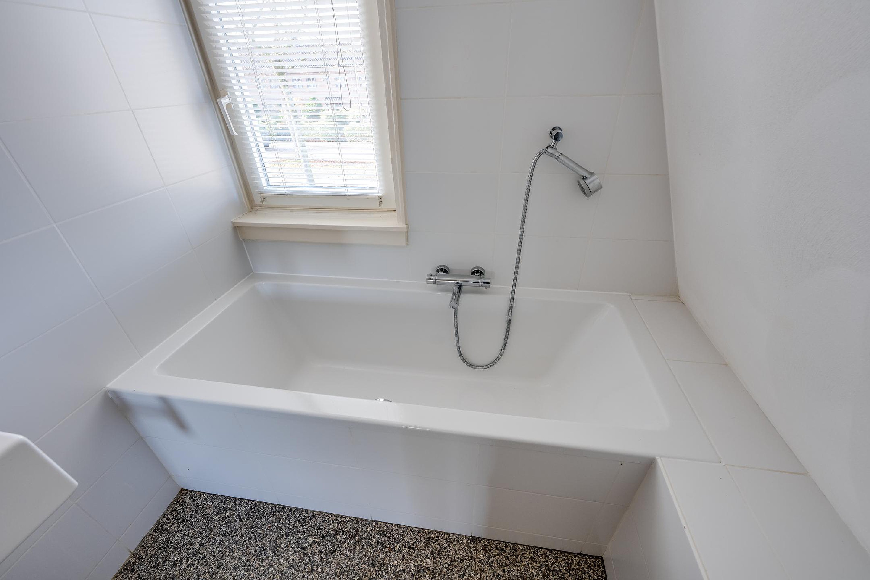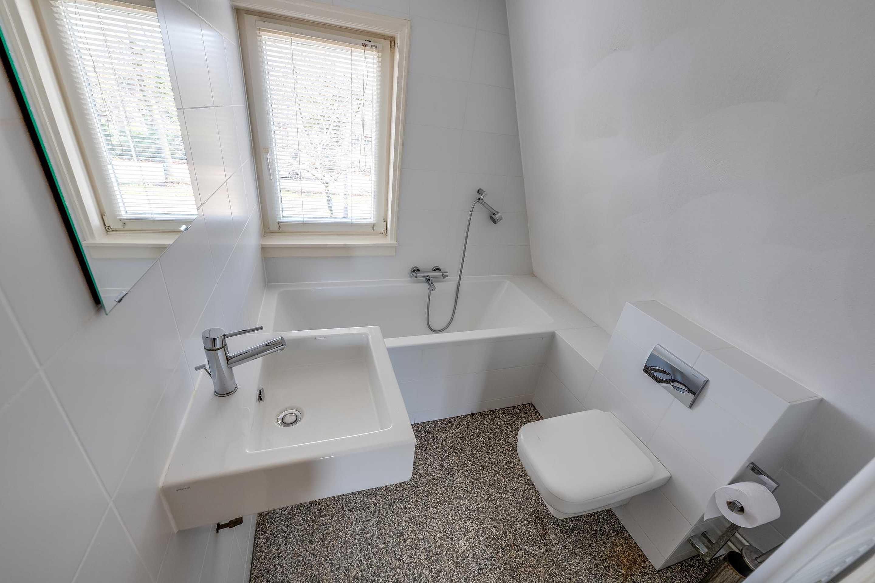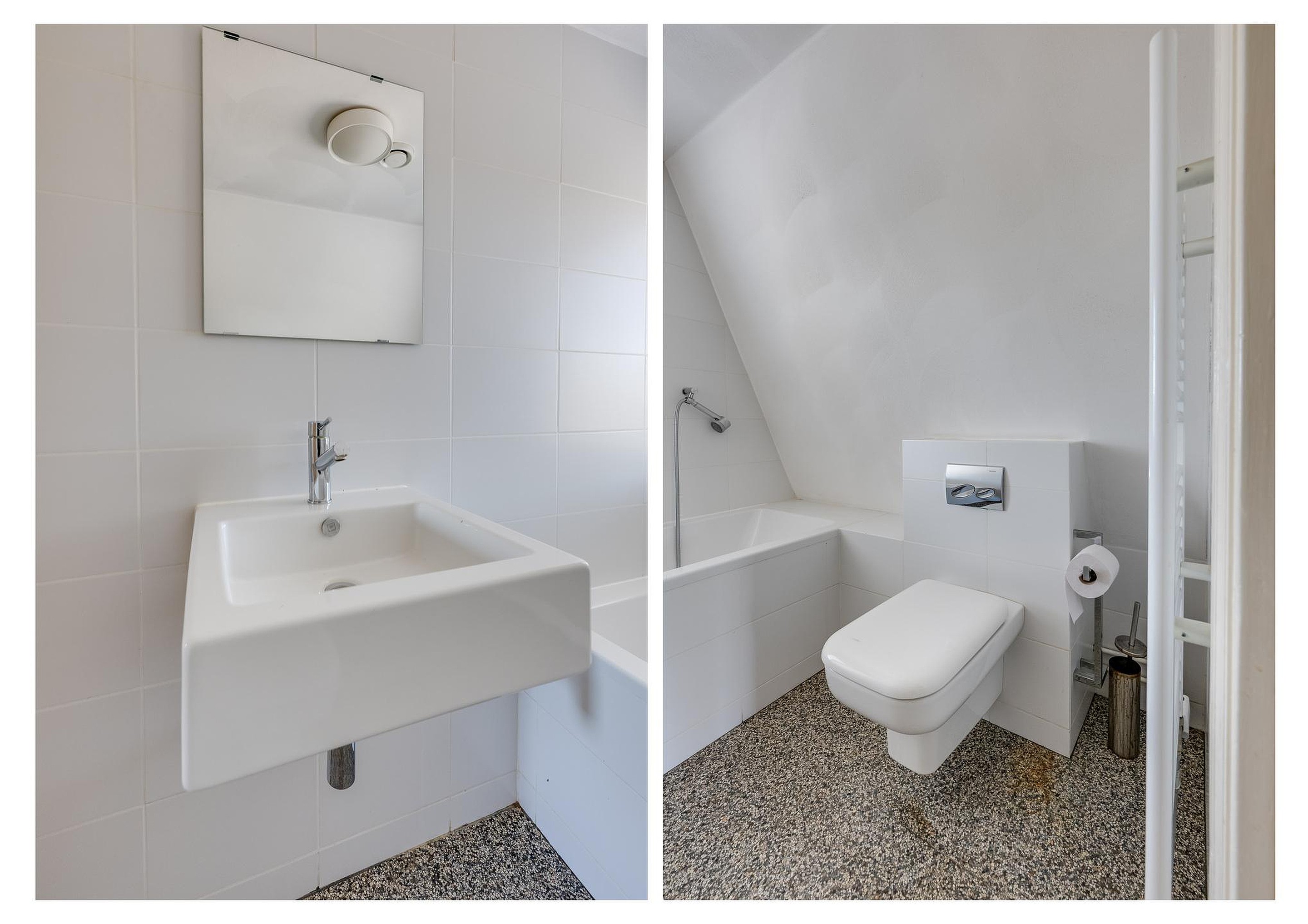 De badkamer (2,06 m. x 1,86 m.) ligt aan de voorzijde van de woning. De ruimte is geheel betegeld. Het hardhouten kozijn is v.v. dubbel glas. Er is een ligbad v.v. thermostaatkraan, een zwevend toilet en een wastafel. Verder vindt u hier een designradiator en natuurlijke ventilatie.