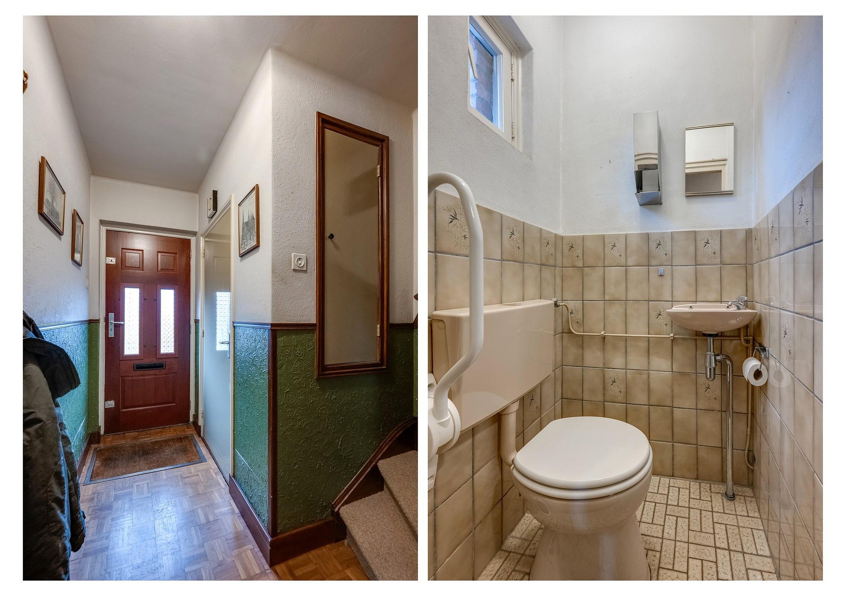 Begane grond U komt binnen in de hal met de garderobe, het staand toilet met fonteintje, de trapkast, de trap naar de eerste etage en de deur naar de woonkamer. Hier bevindt zich ook de meterkast (7 groepen / 2 aardlekschakelaars).
