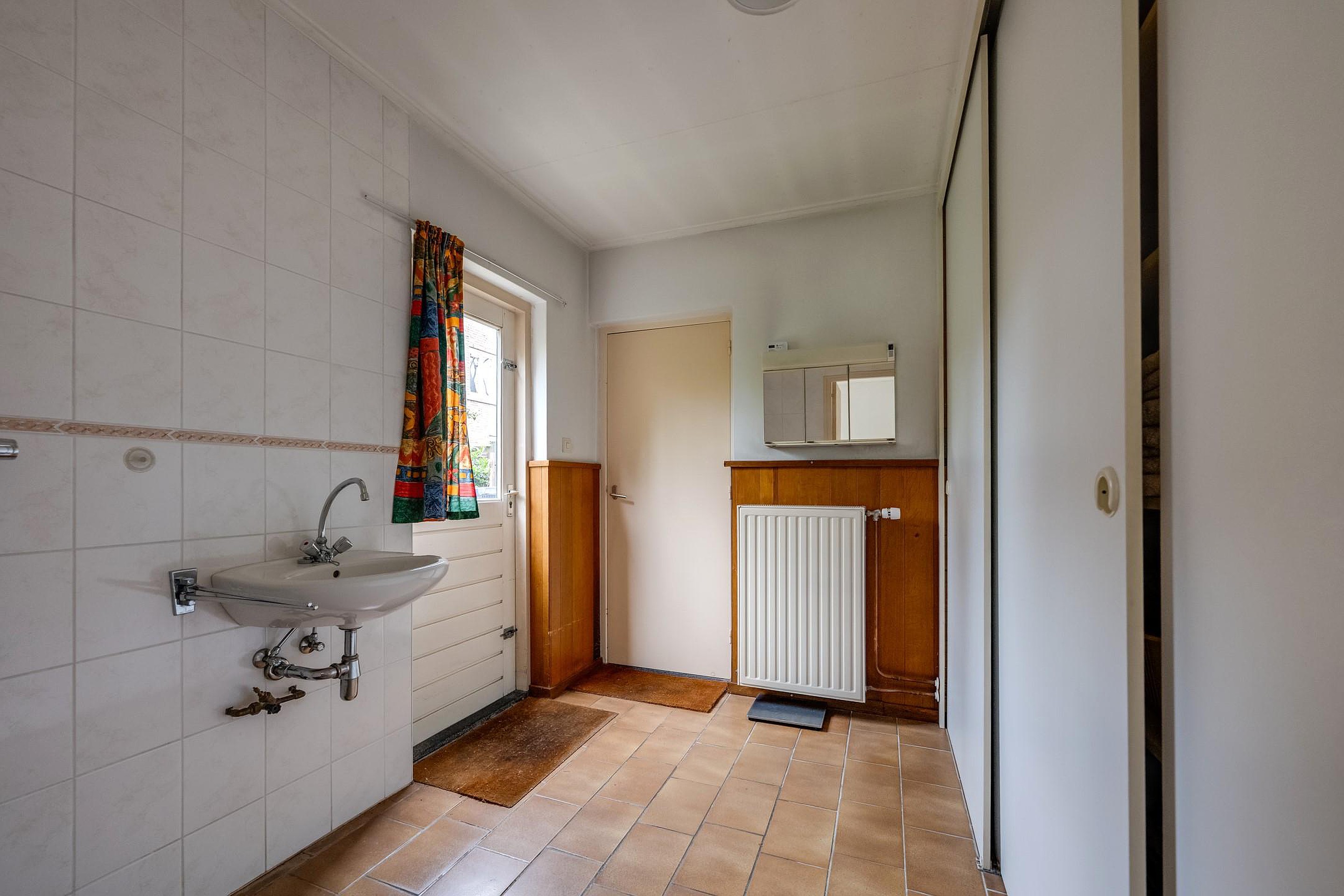 In de geheel betegelde bijkeuken (3,07 m. x 2,70 m.) vindt u een vaste kastenwand v.v. cv-ketel (Remeha 2015) en een wc (sanibroyeur). U kunt hier ook de wasmachine plaatsen. Er is een douchehoek aanwezig. Er is een houten achterdeur (met enkel glas) naar de tuin en een tussendeur naar de extra kamer.