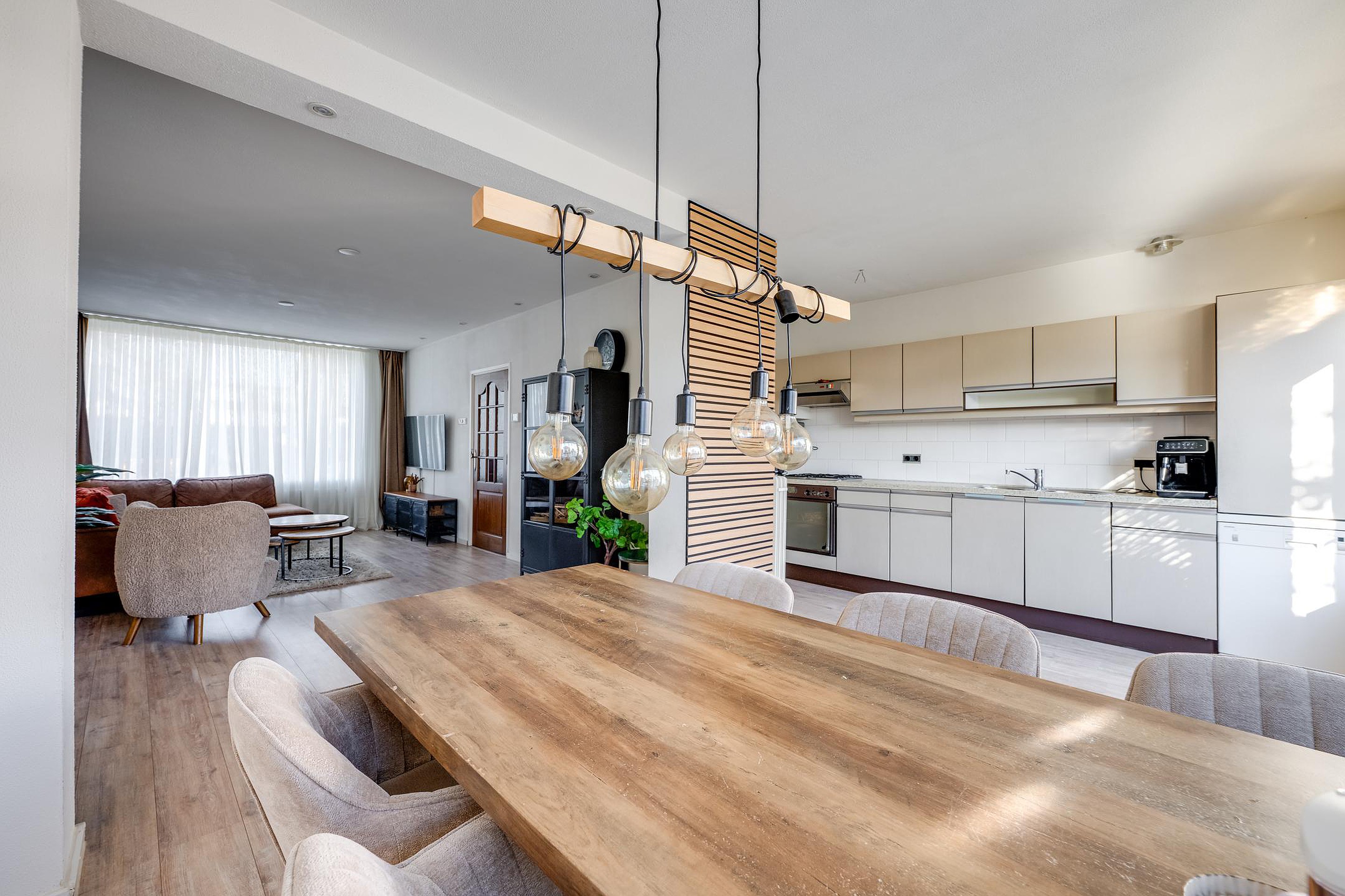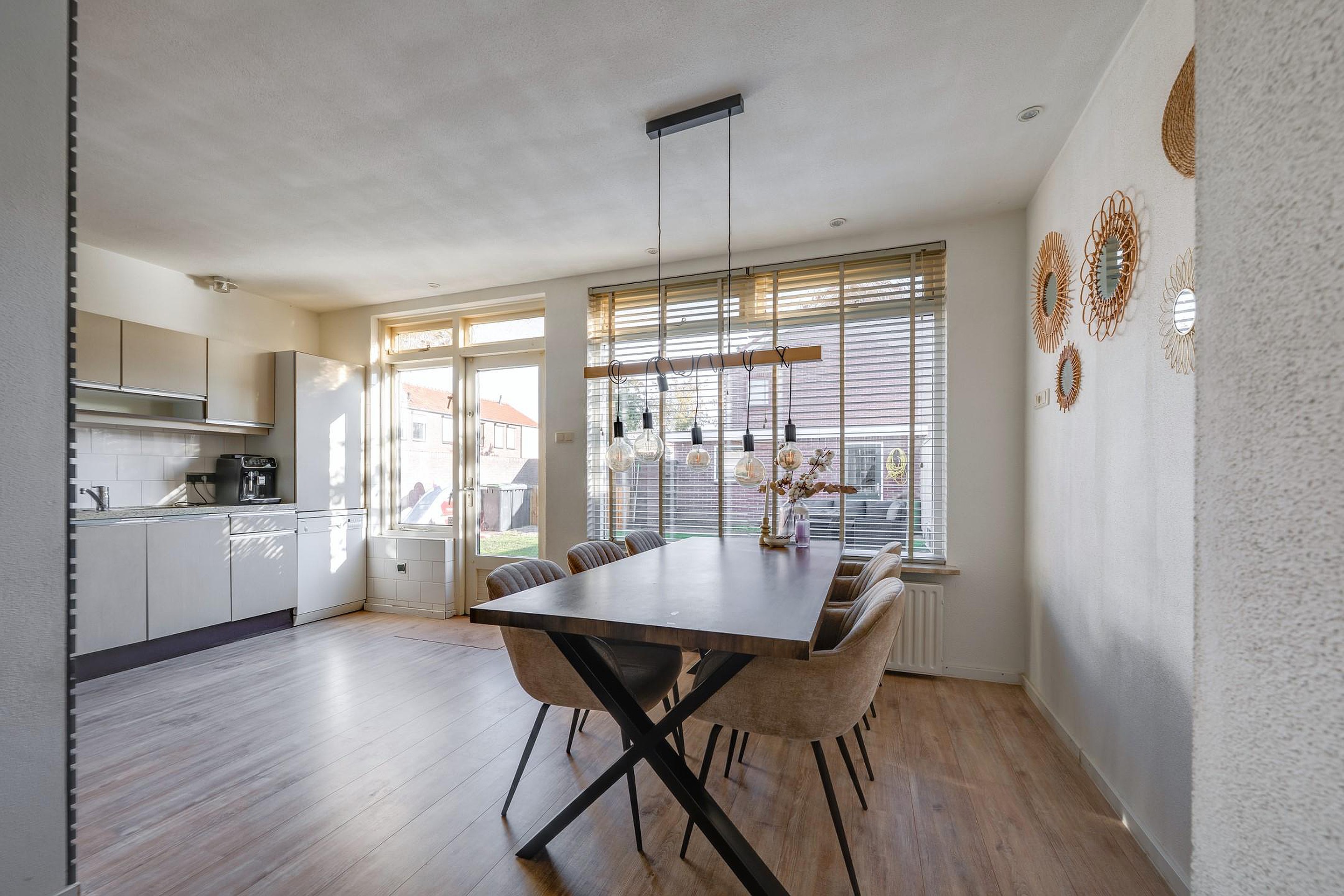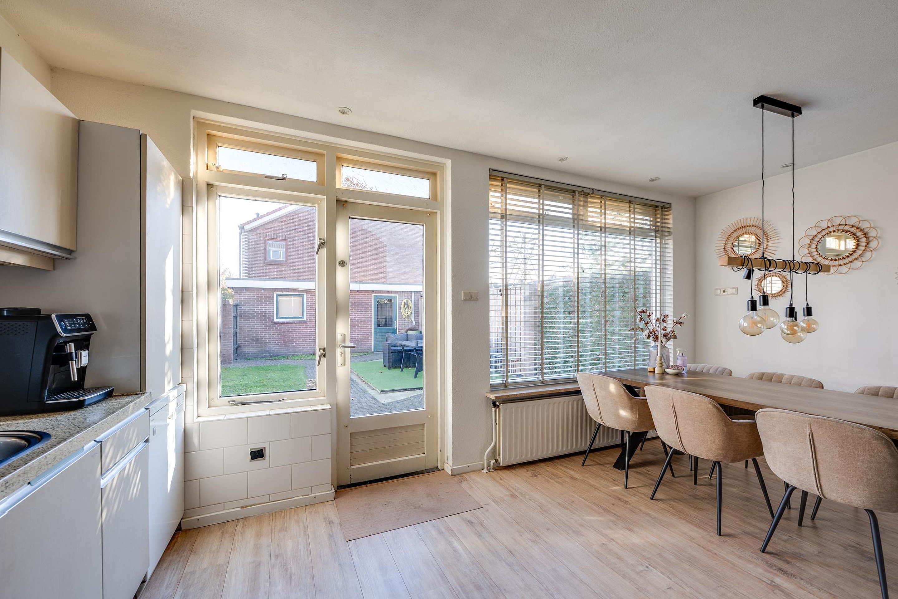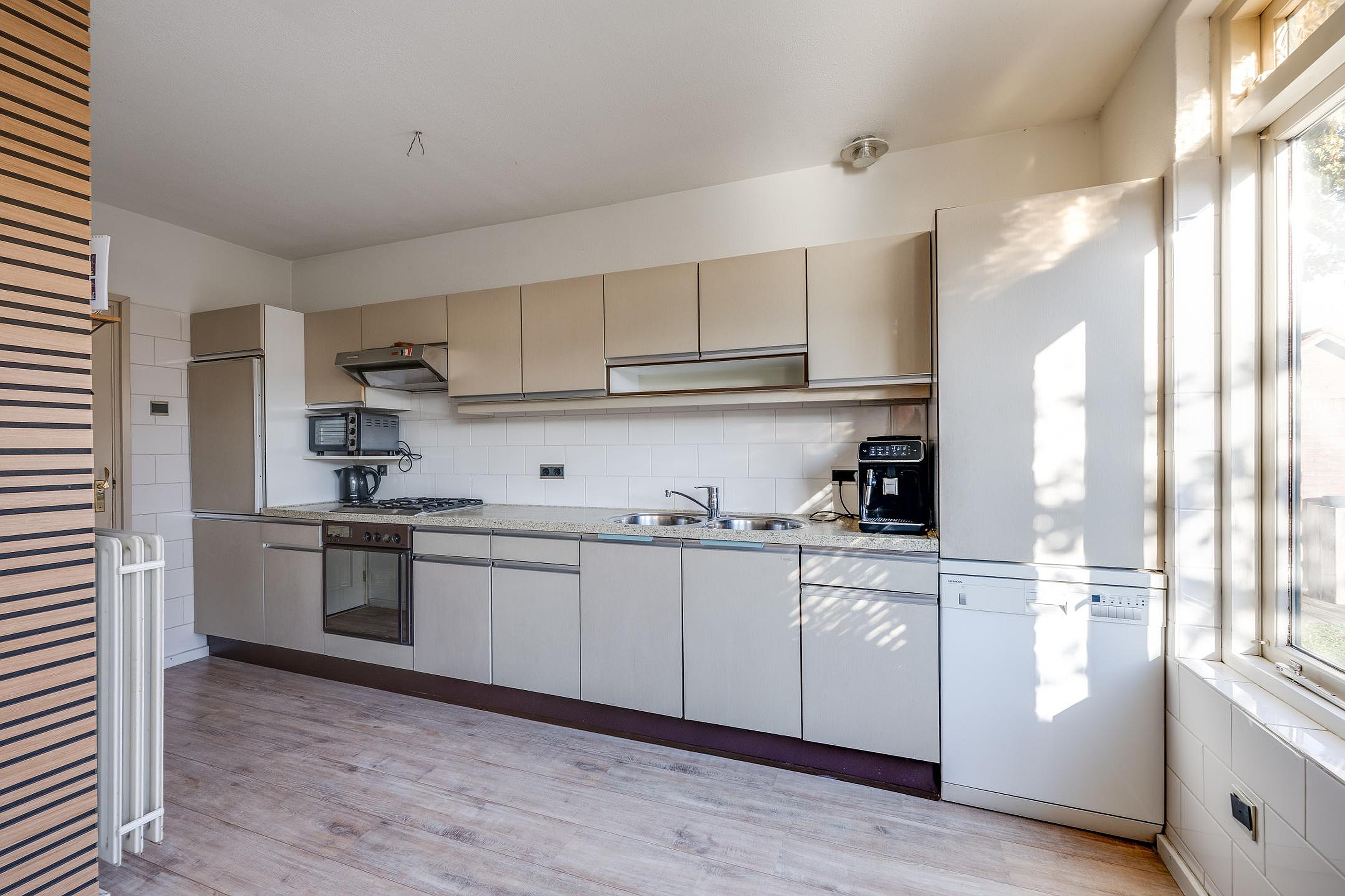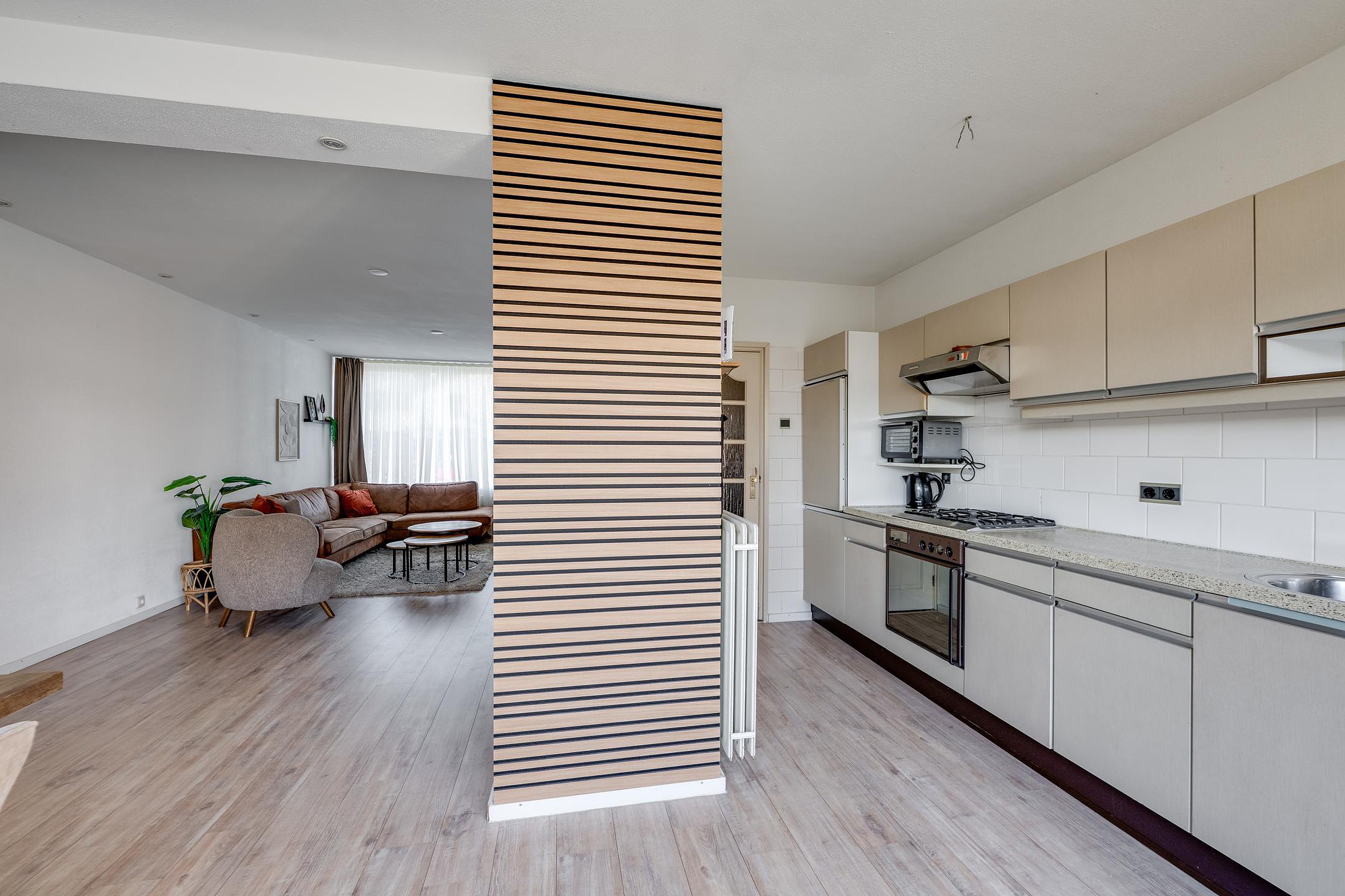 De half open keuken (4,50 m. x 1,96 m.) is deels betegeld en verder v.v. stucwerk. De laminaatvloer is doorgetrokken vanuit de woonkamer. Het hardhouten kozijn is weer v.v. dubbel glas. De keuken is v.v. een koelkast, een 4 pits gaskookplaat, een afzuigkap, een vaatwasser en een dubbele wasbak. Er zijn zowel onder- als bovenkasten voor voldoende bergruimte. Vanuit de keuken kunt u naar de entree en de achtertuin.