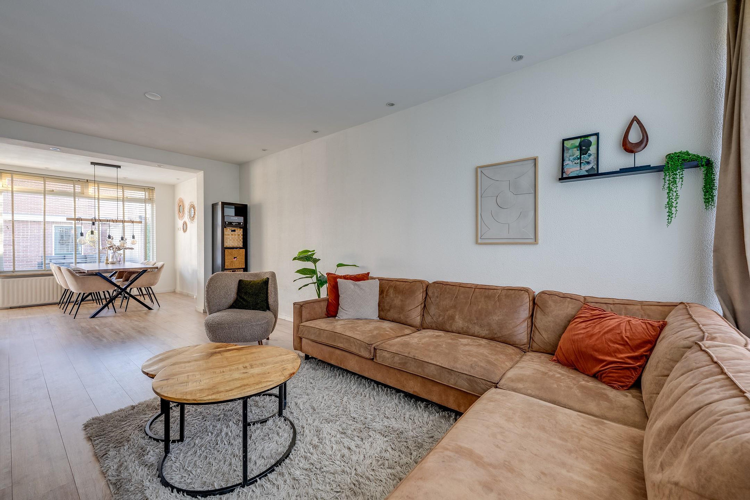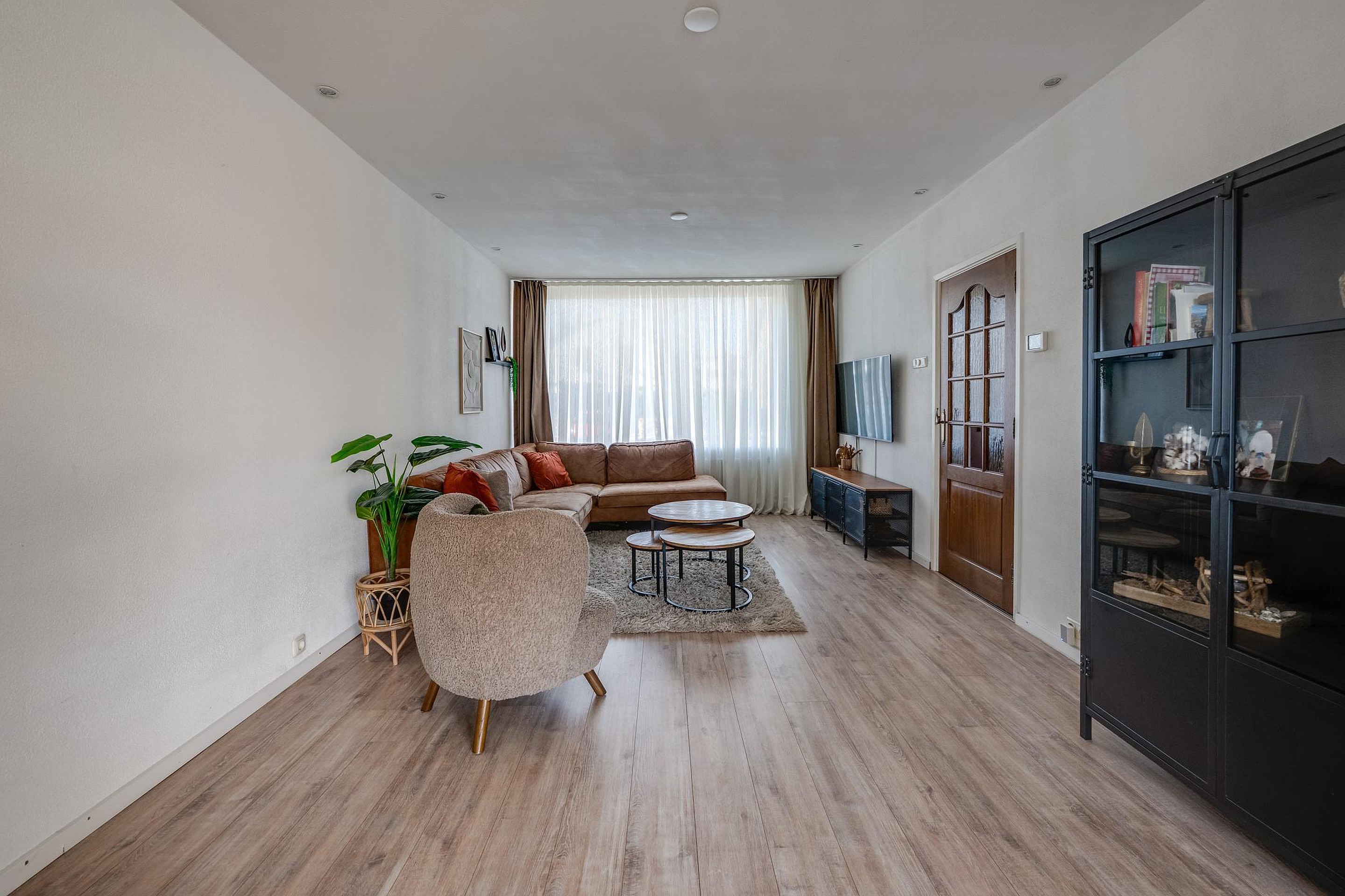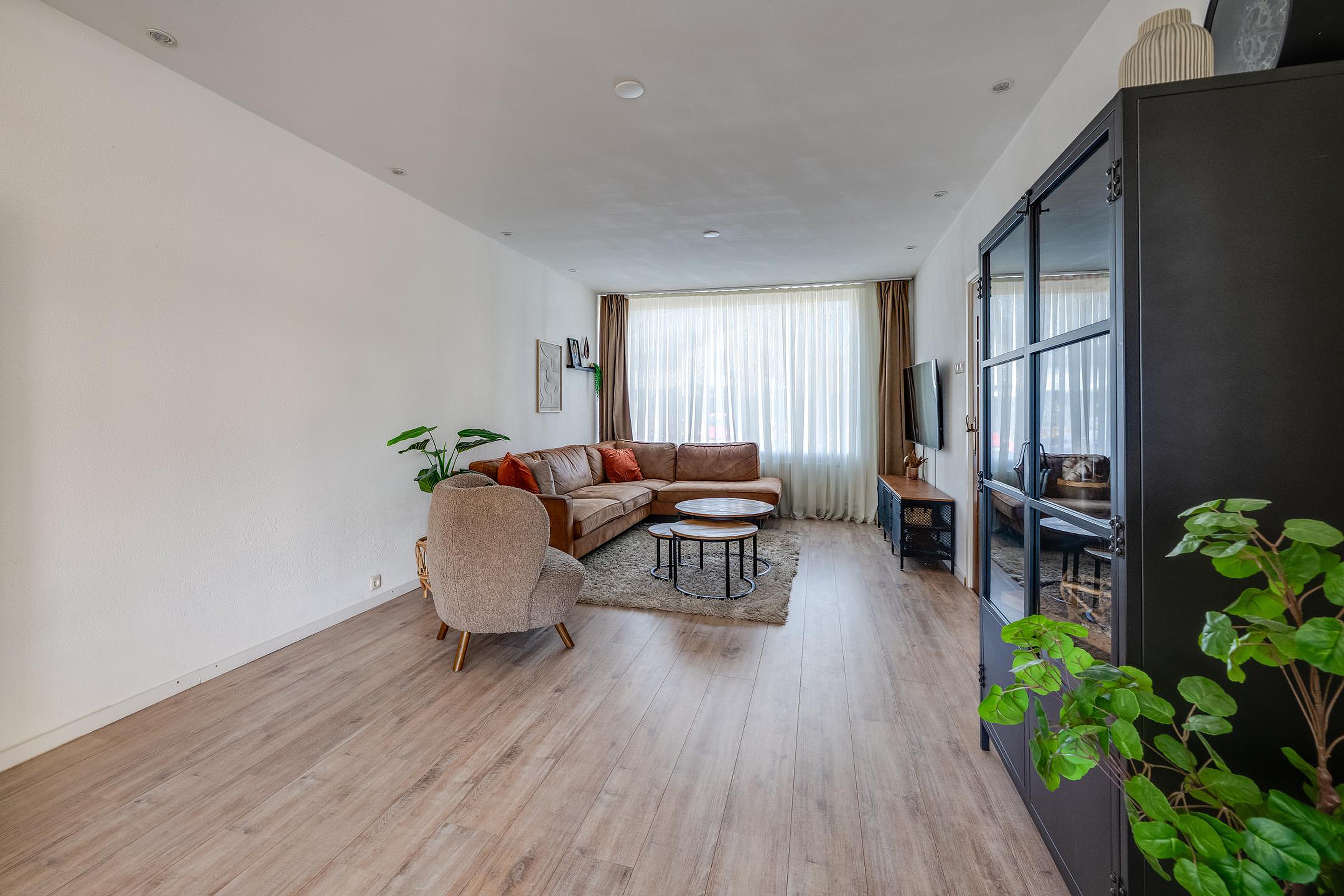 De woonkamer (9,27 m. x 3,56 m.) is uitgebouwd aan de achterzijde. De hardhouten kozijnen zijn allen v.v. dubbel glas. Er ligt een laminaatvloer en de wanden zijn v.v. stucwerk. Ook het plafond is v.v. glad stucwerk en enkele inbouwspots.