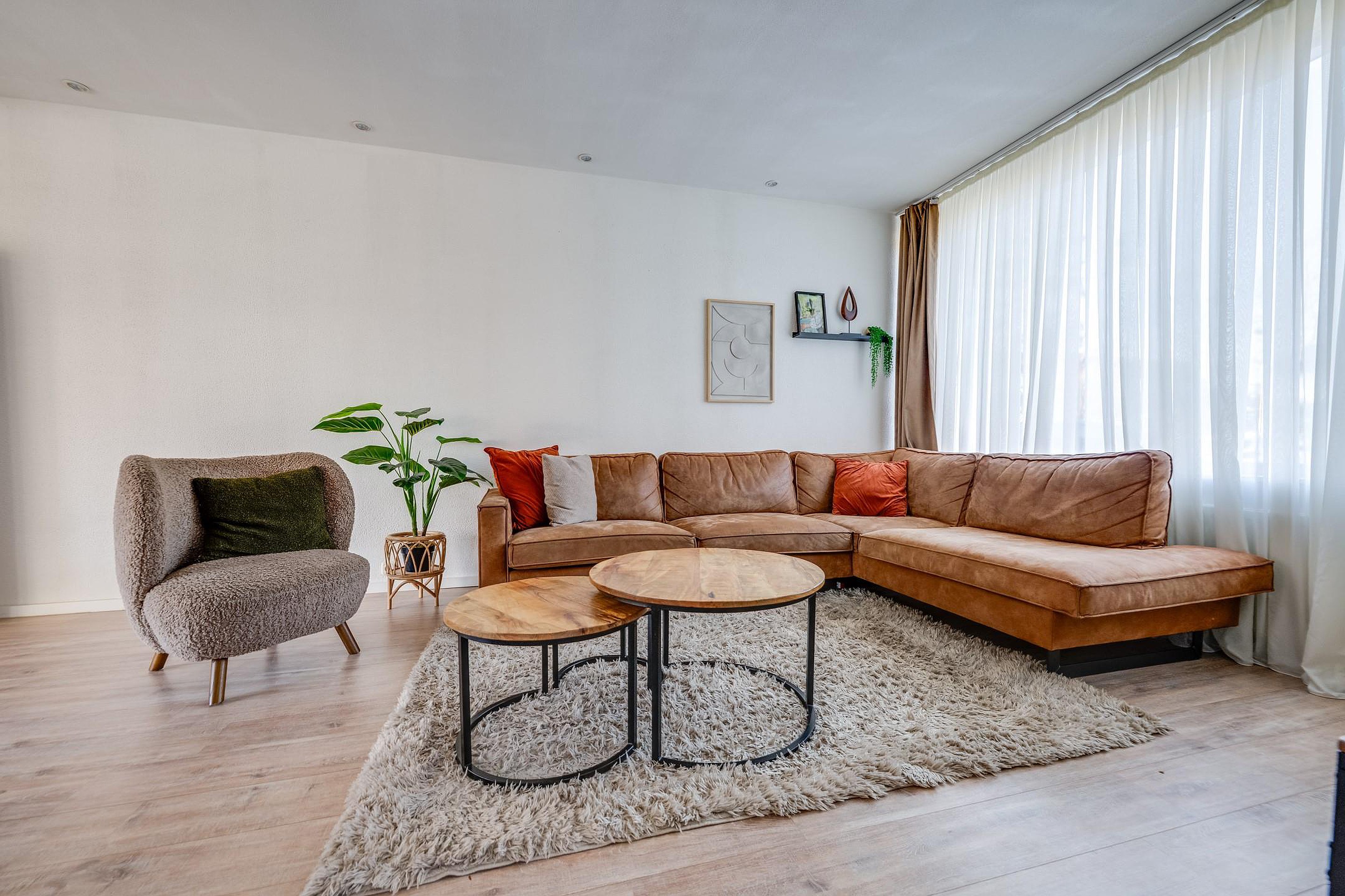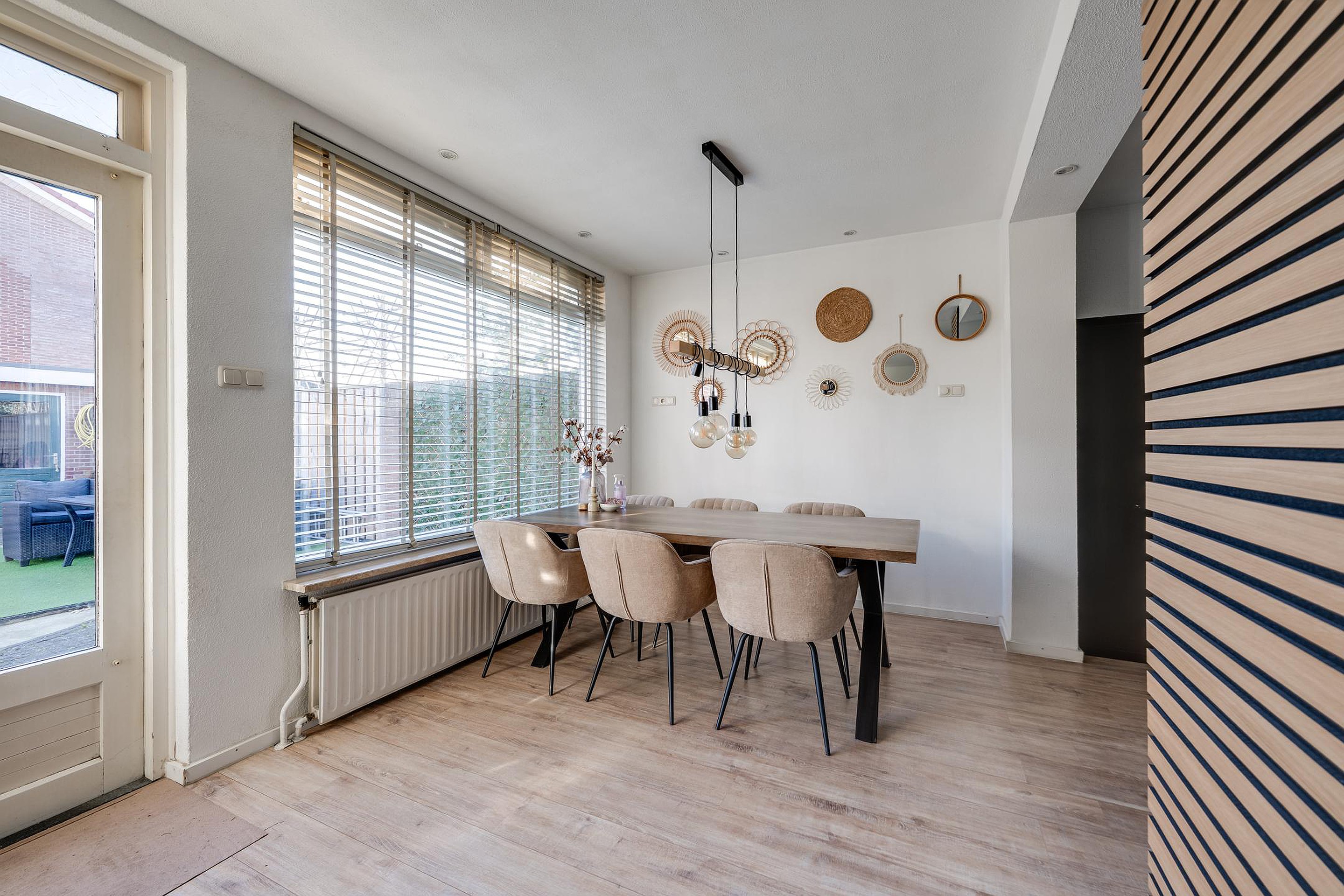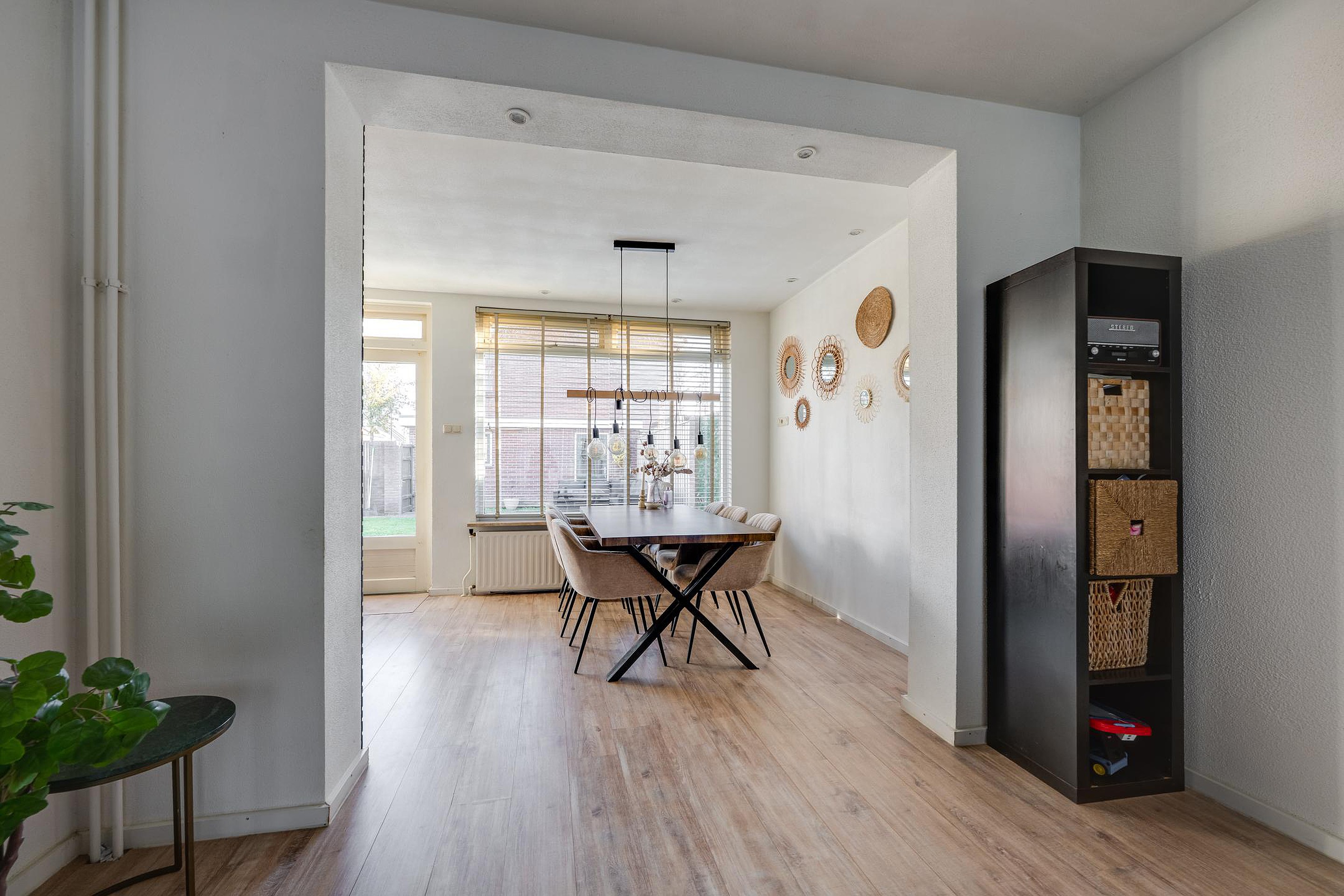 De woonkamer (9,27 m. x 3,56 m.) is uitgebouwd aan de achterzijde. De hardhouten kozijnen zijn allen v.v. dubbel glas. Er ligt een laminaatvloer en de wanden zijn v.v. stucwerk. Ook het plafond is v.v. glad stucwerk en enkele inbouwspots.