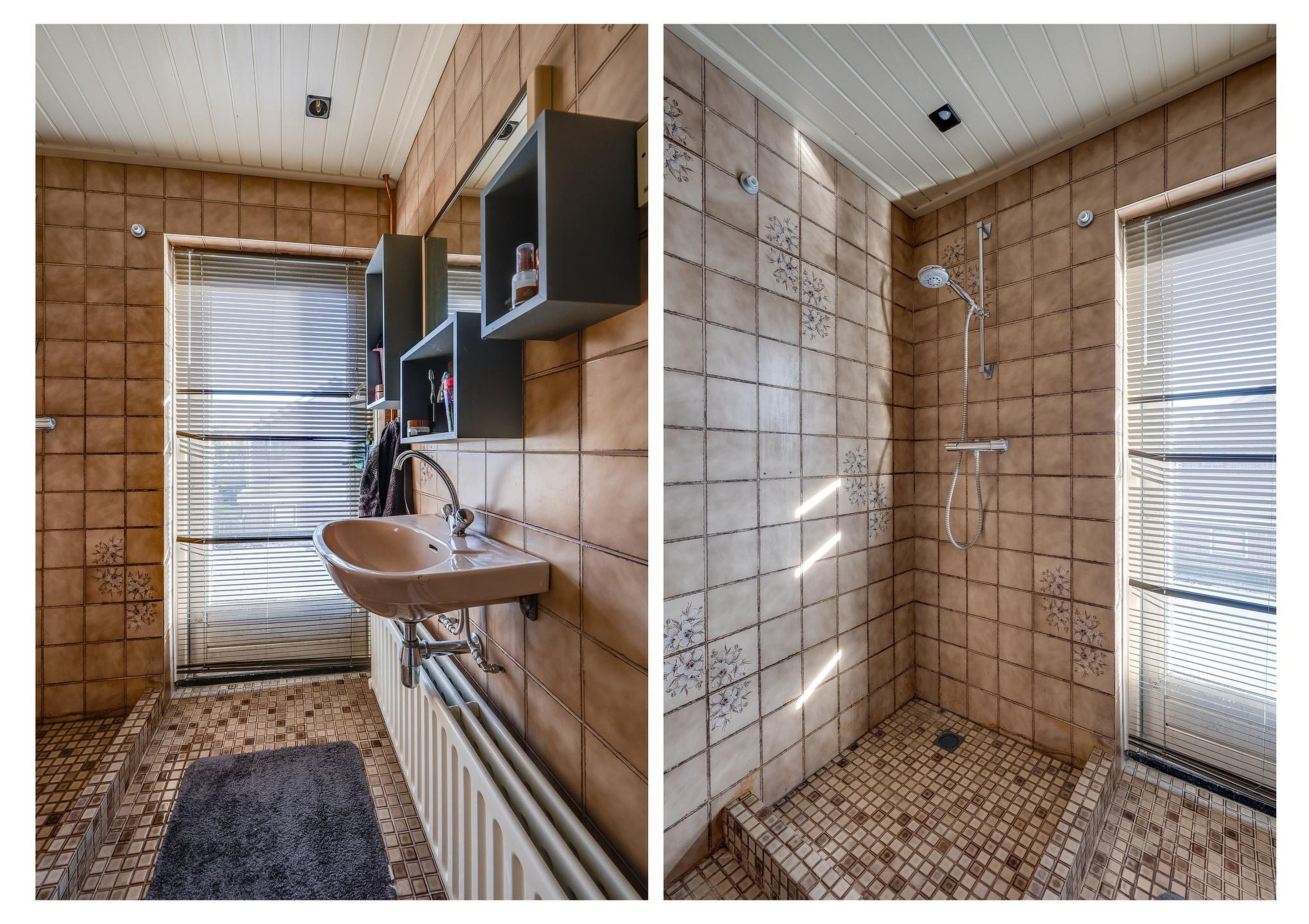 De badkamer (2 m. x 1,54 m.) ligt aan de achterzijde van de woning. De badkamer is v.v. een douche met thermostaatkraan en wastafel. De ruimte is geheel betegeld. Er is een loopdeur naar het dak van de aanbouw.