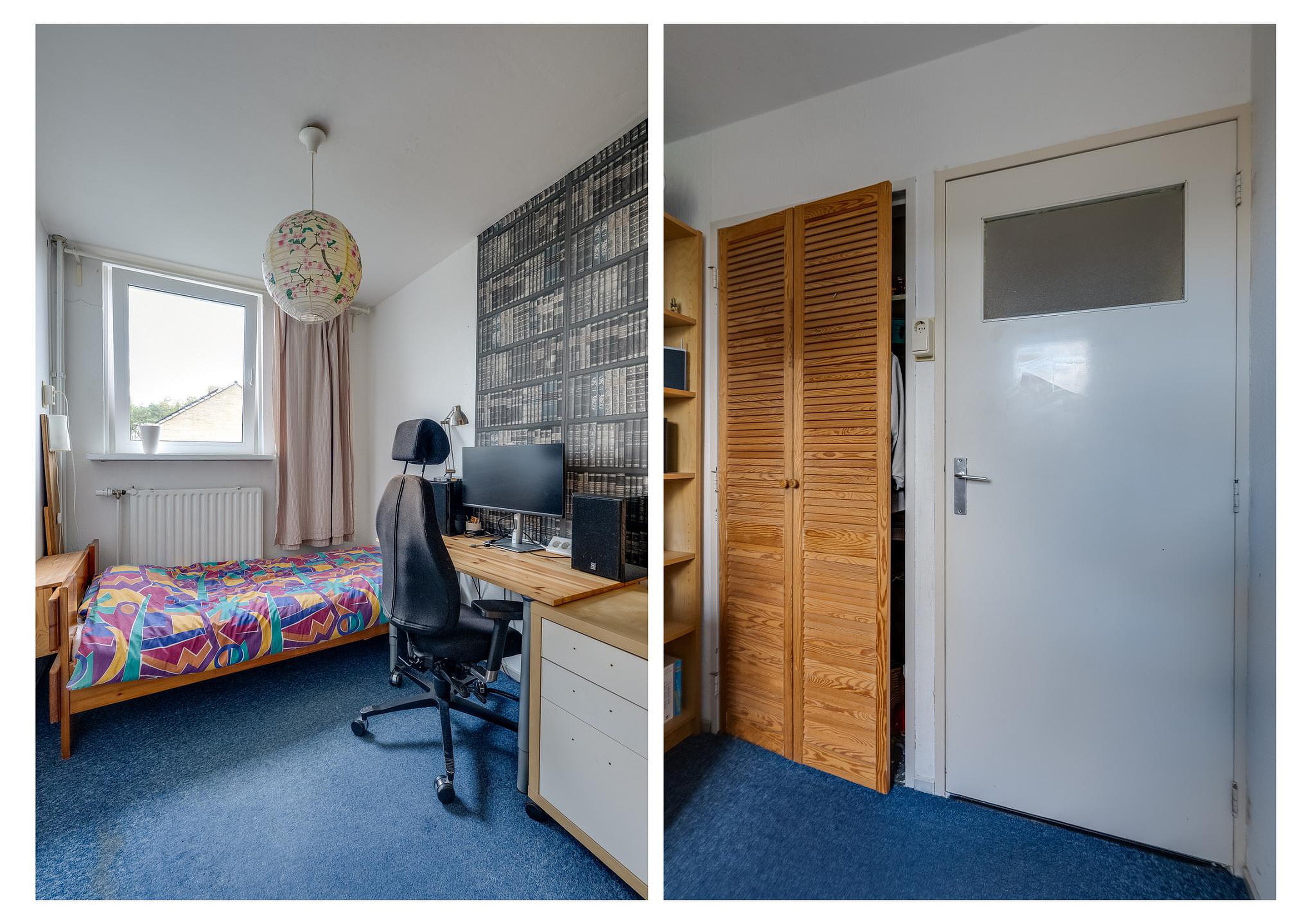Deze slaapkamer (4,07 m. x 3,67 m) ligt aan de achterzijde van de woning. Er ligt vloerbedekking. Het kunststof kozijn is v.v. HR++ glas en een hor.