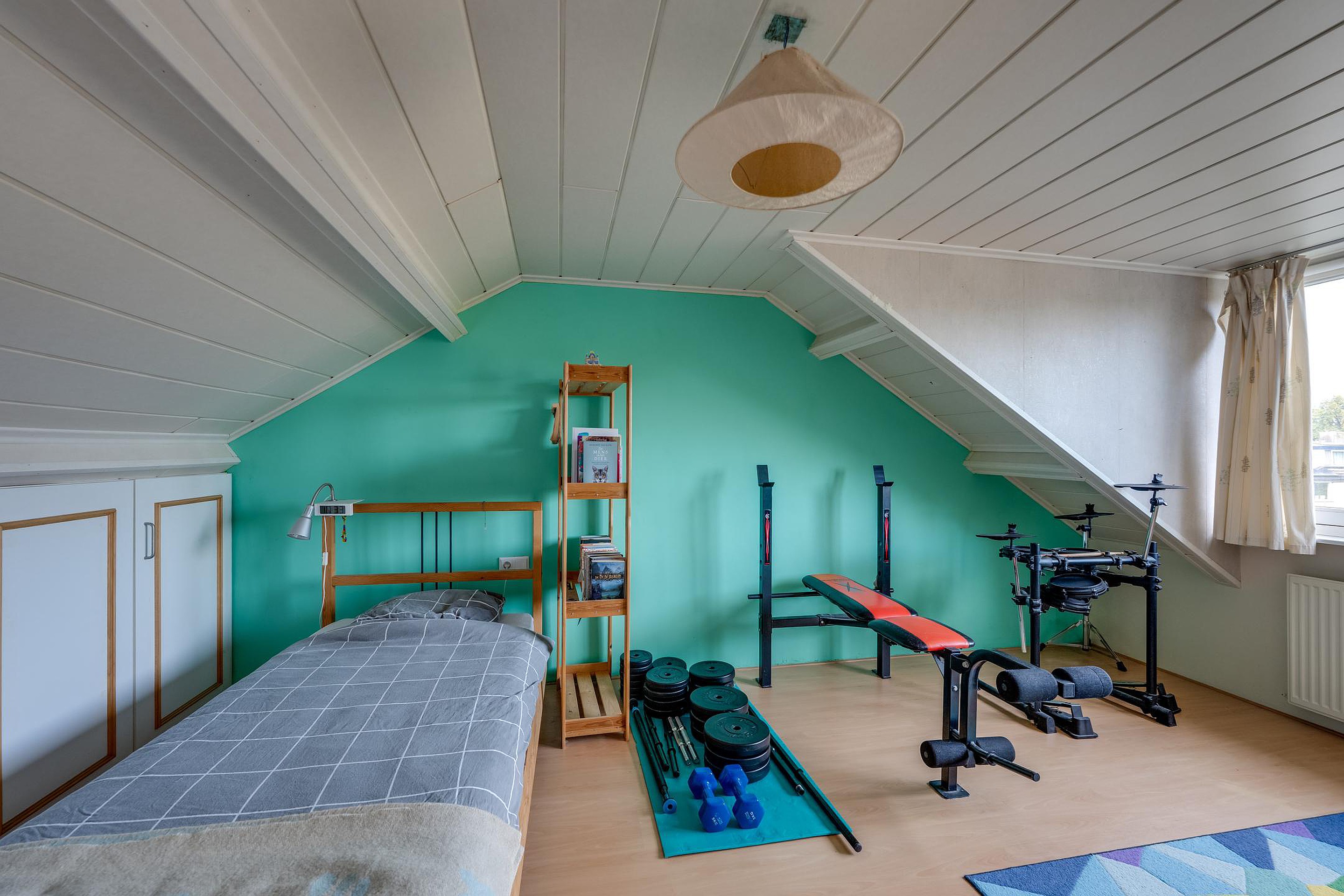 Deze kamer (4,90 m. x 3,66 m.) heeft een dakkapel aan de achterzijde v.v. een houten kozijn met dubbel glas. Achter de knieschotten vindt u extra bergruimte.