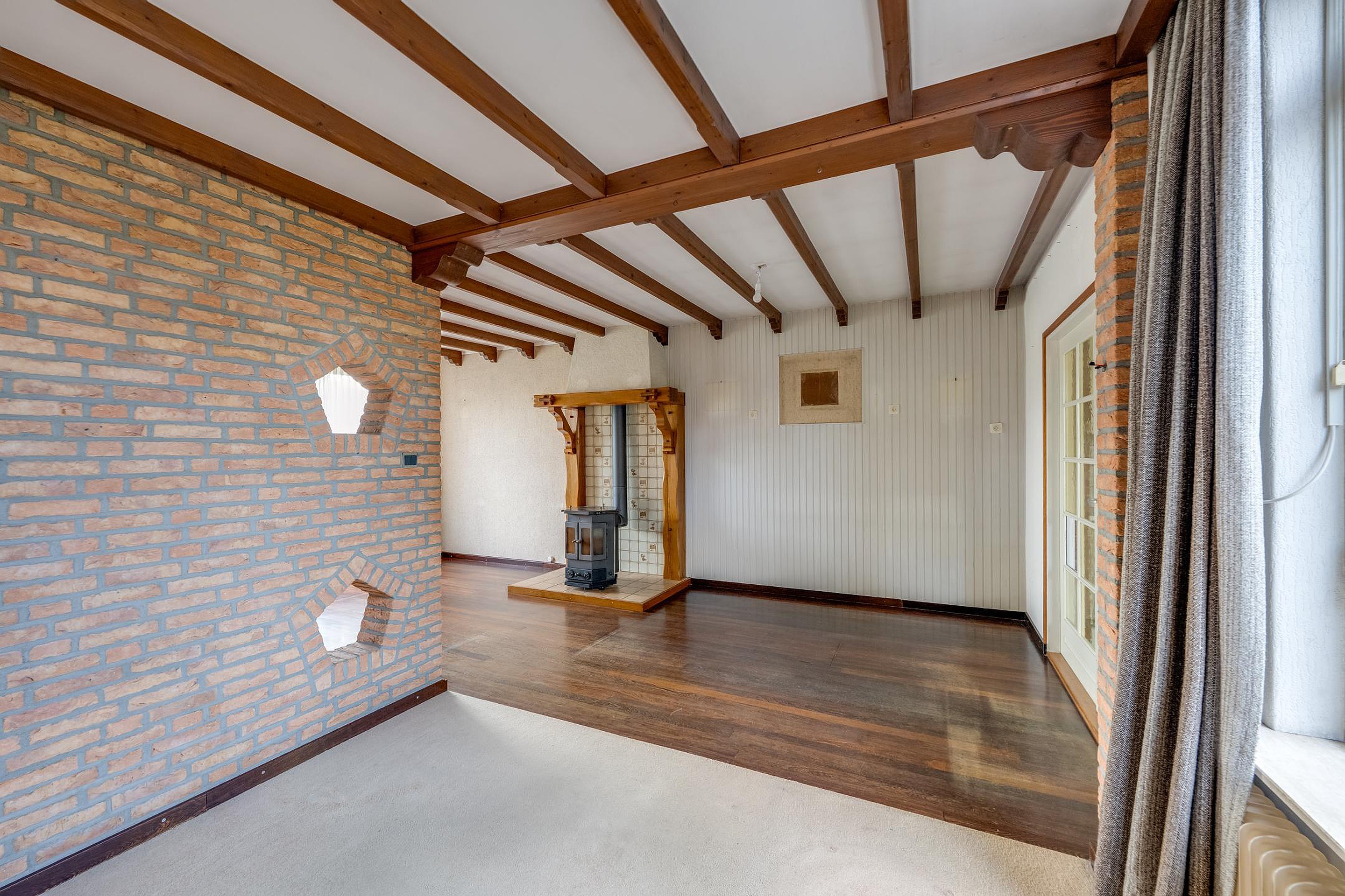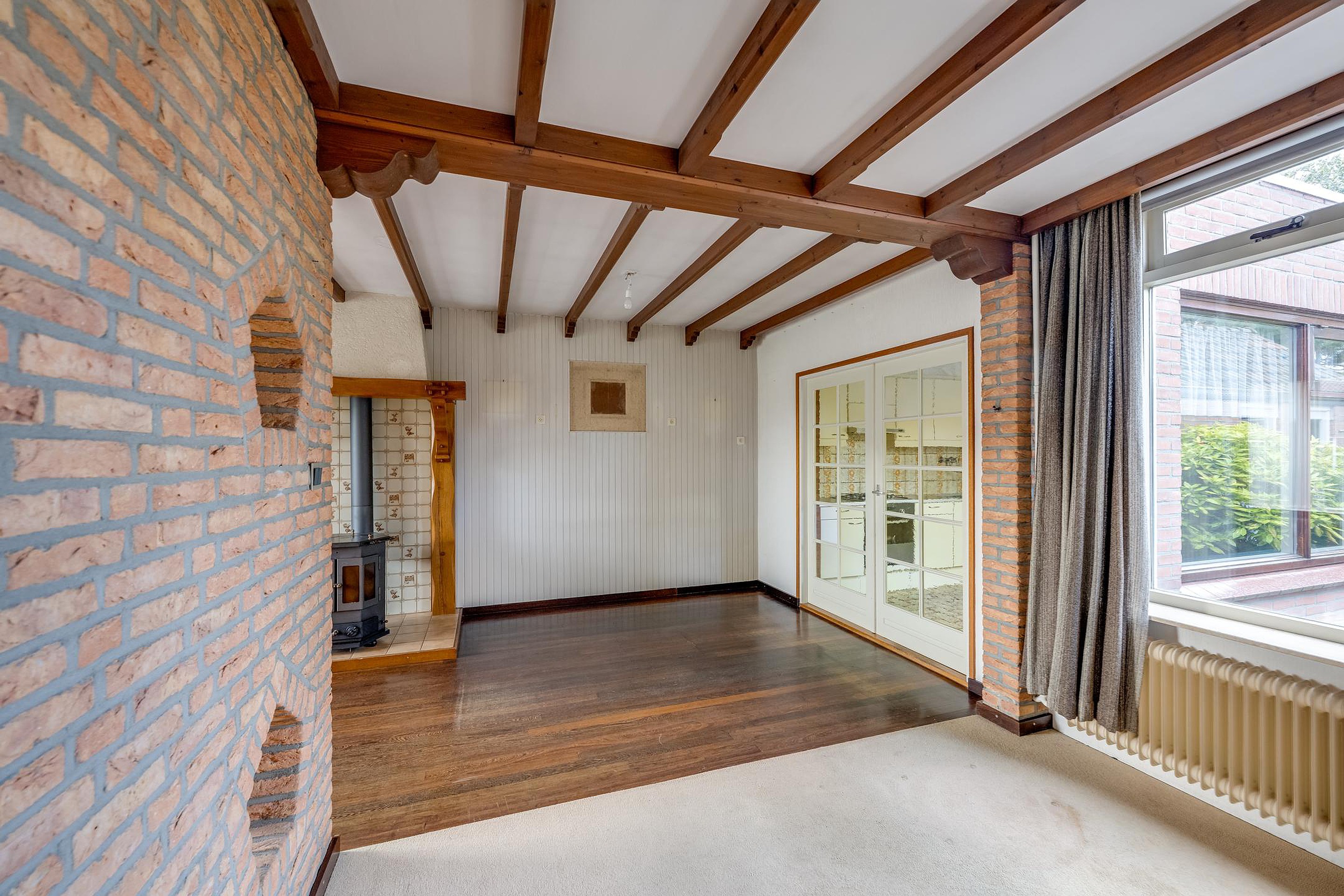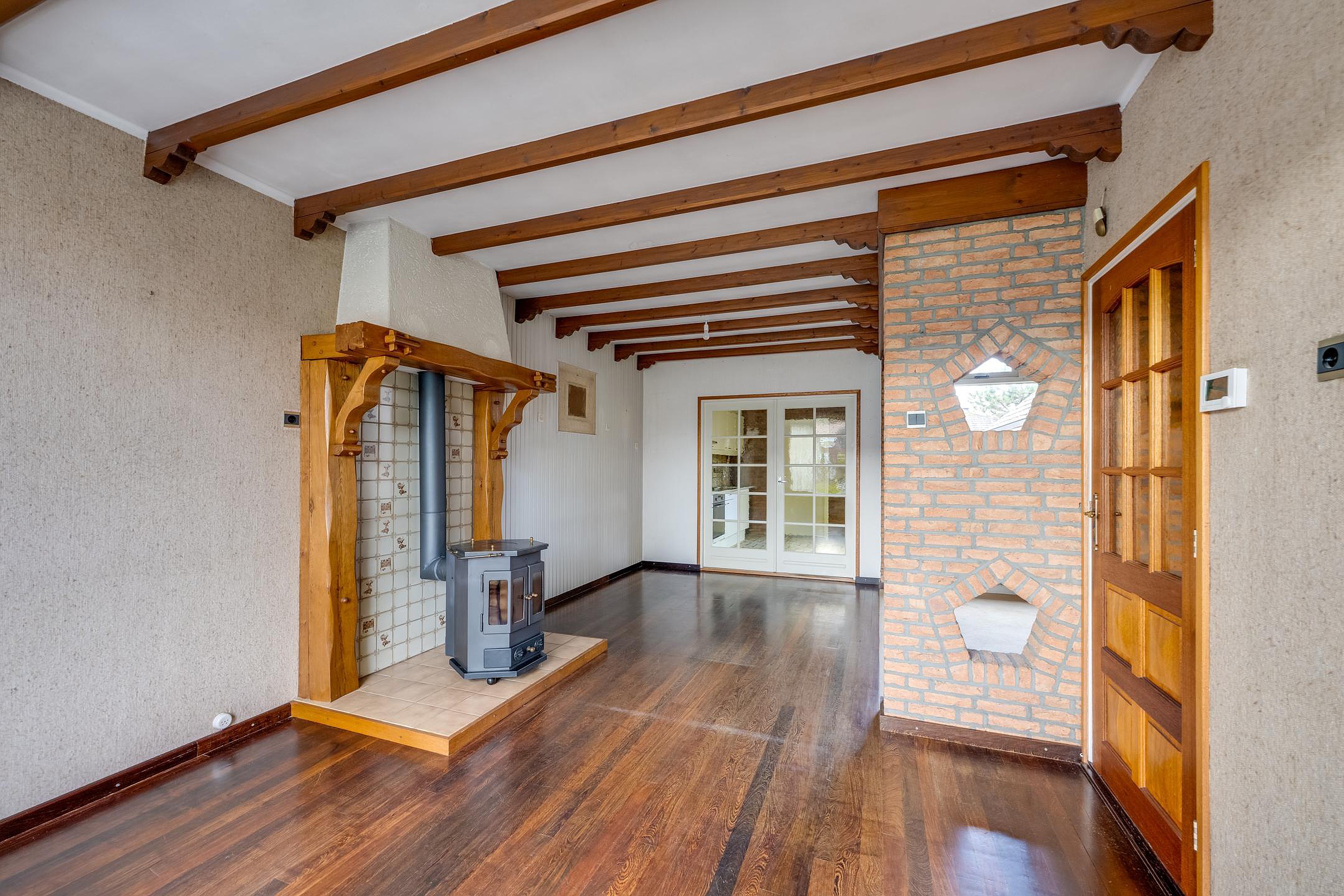 De woonkamer (6,90 m. x 5,68/3,63 m.) heeft een houtkachel met rookkanaal. De schouw is grotendeels van gipsplaat. Er ligt deels een houten vloer en deels vloerbedekking. Het plafond is afgewerkt met sierbalken. De houten kozijnen zijn v.v. dubbel glas.