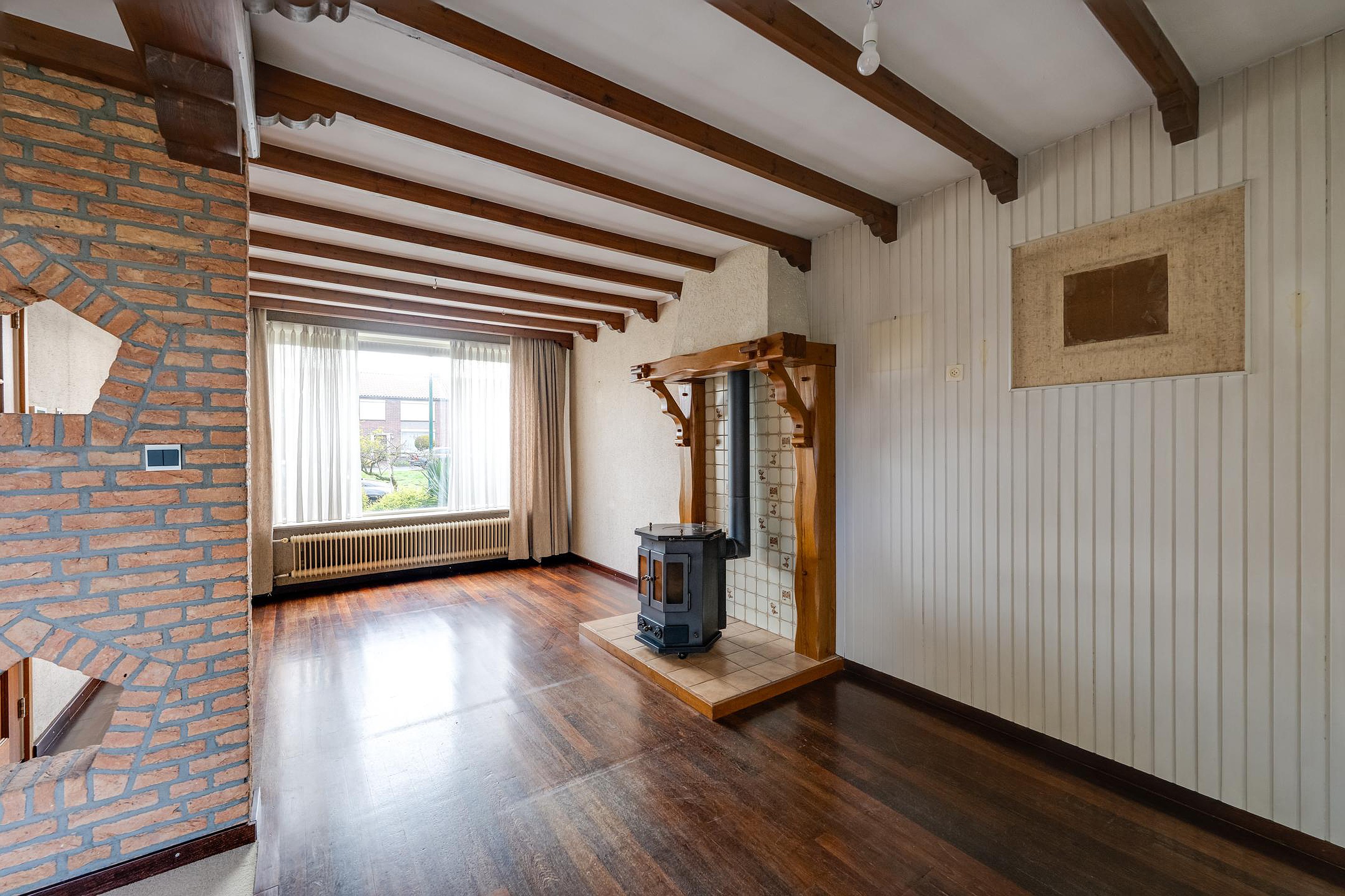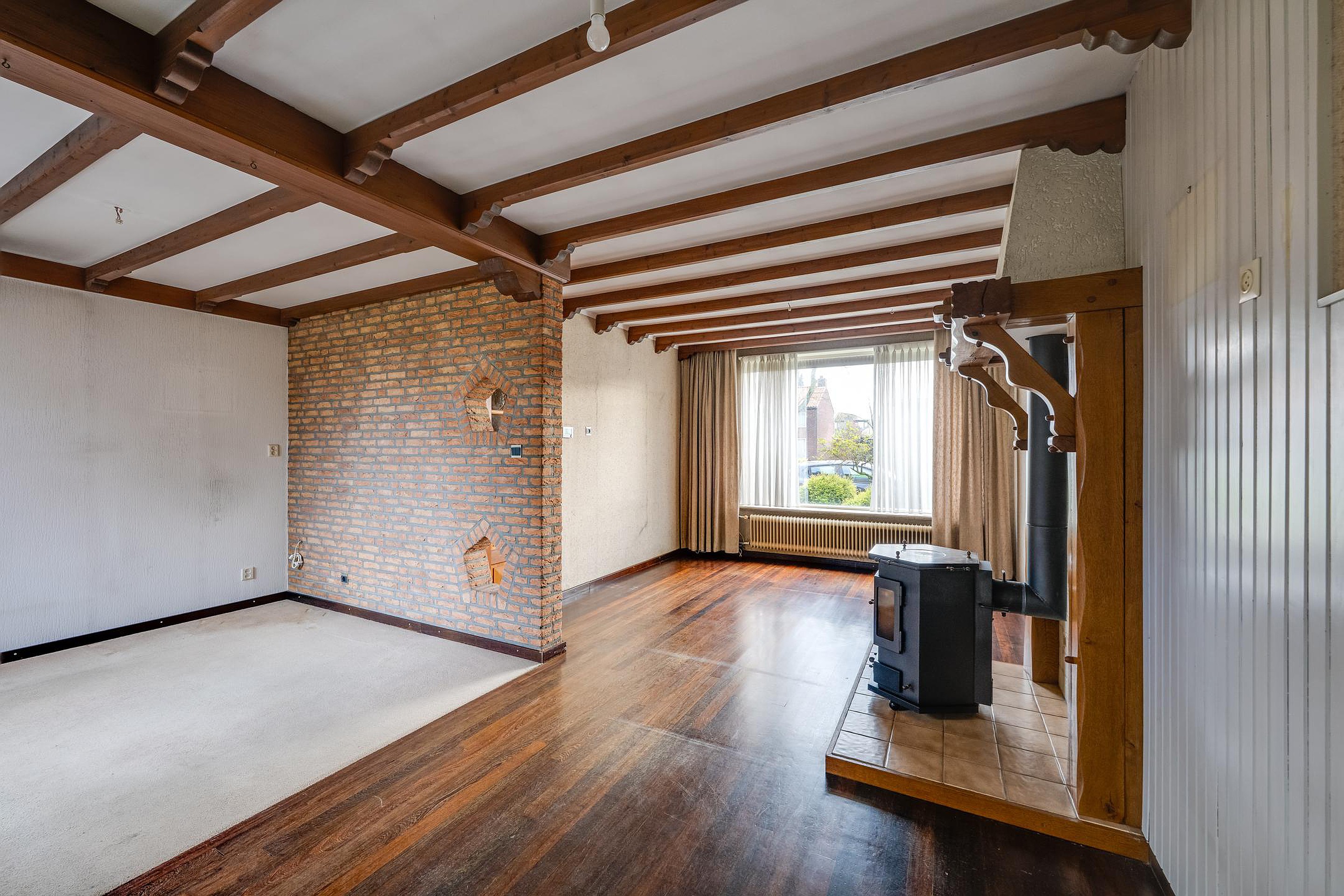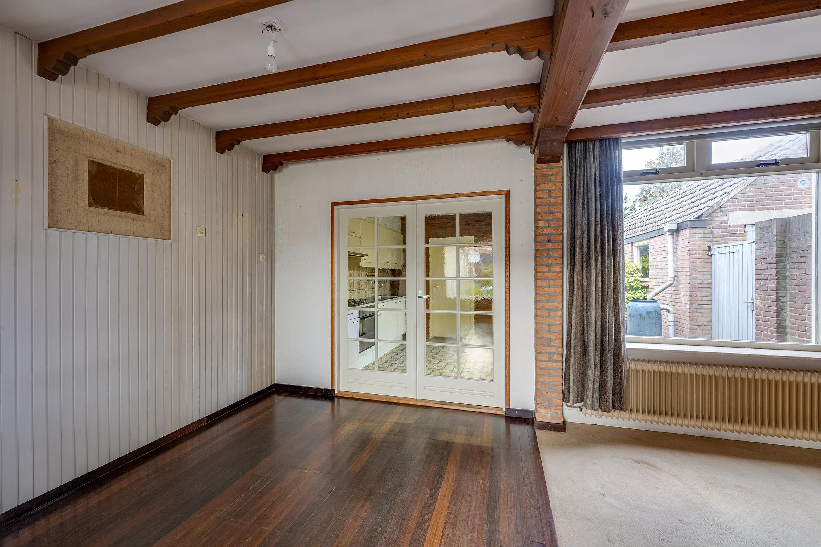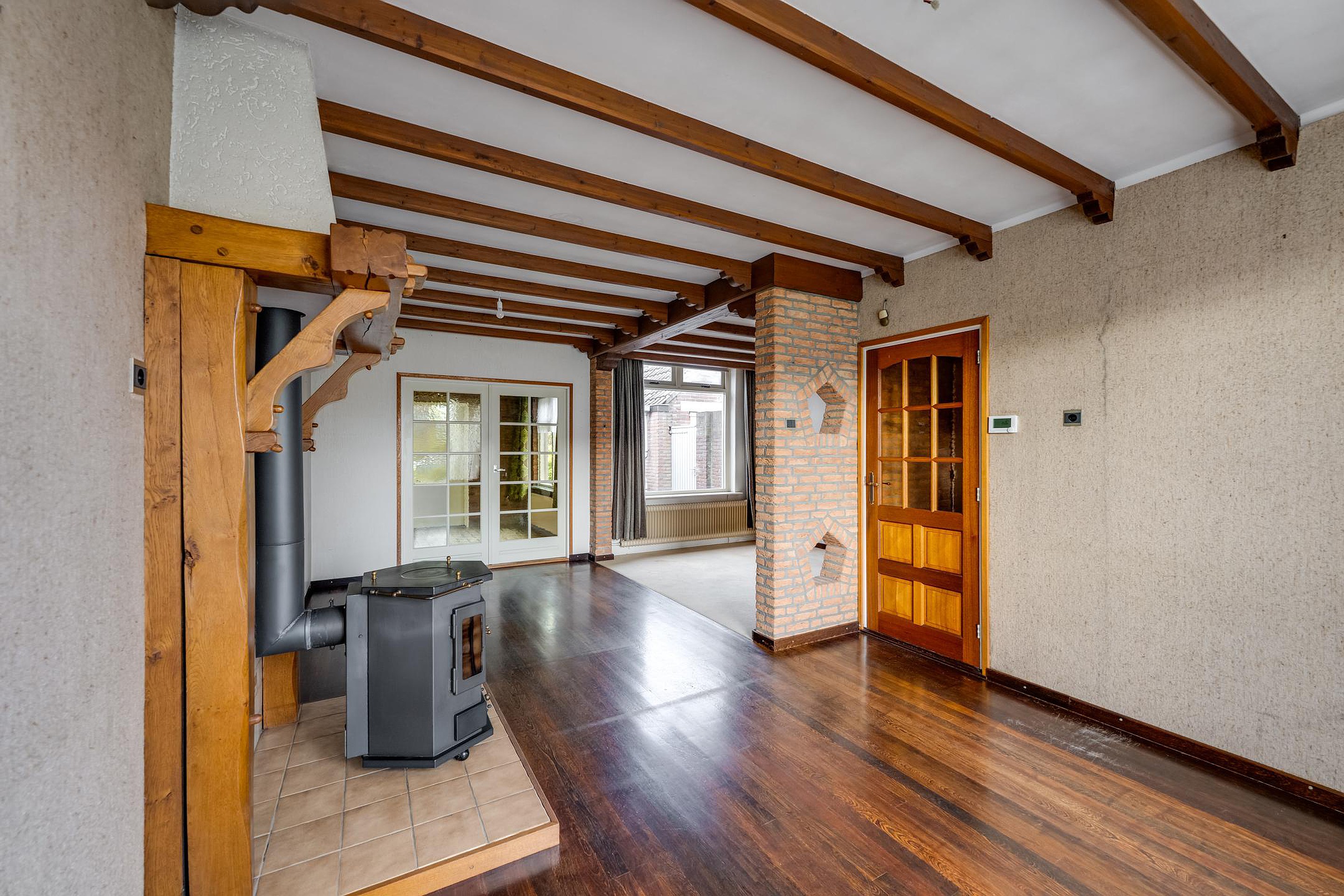 De woonkamer (6,90 m. x 5,68/3,63 m.) heeft een houtkachel met rookkanaal. De schouw is grotendeels van gipsplaat. Er ligt deels een houten vloer en deels vloerbedekking. Het plafond is afgewerkt met sierbalken. De houten kozijnen zijn v.v. dubbel glas.