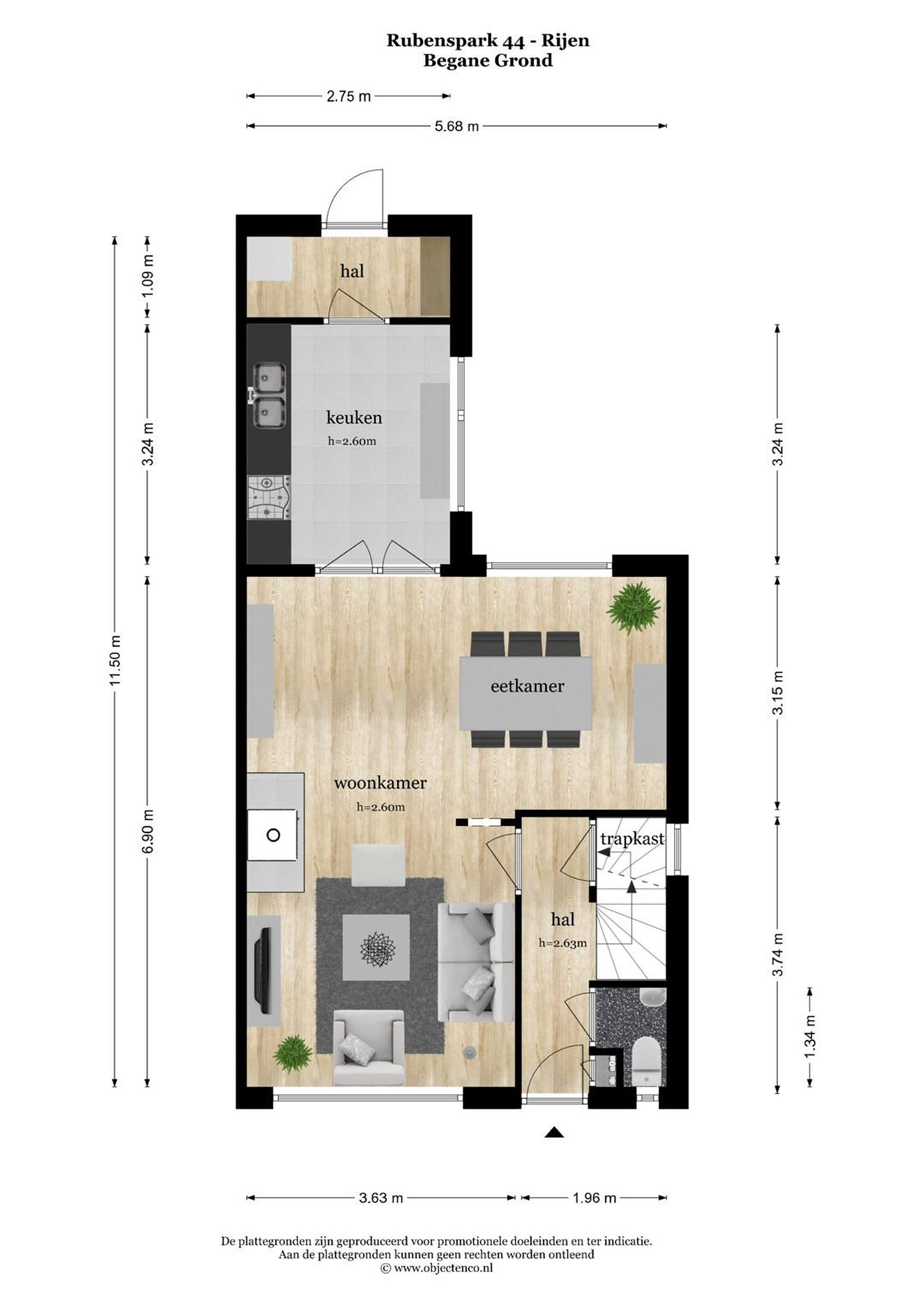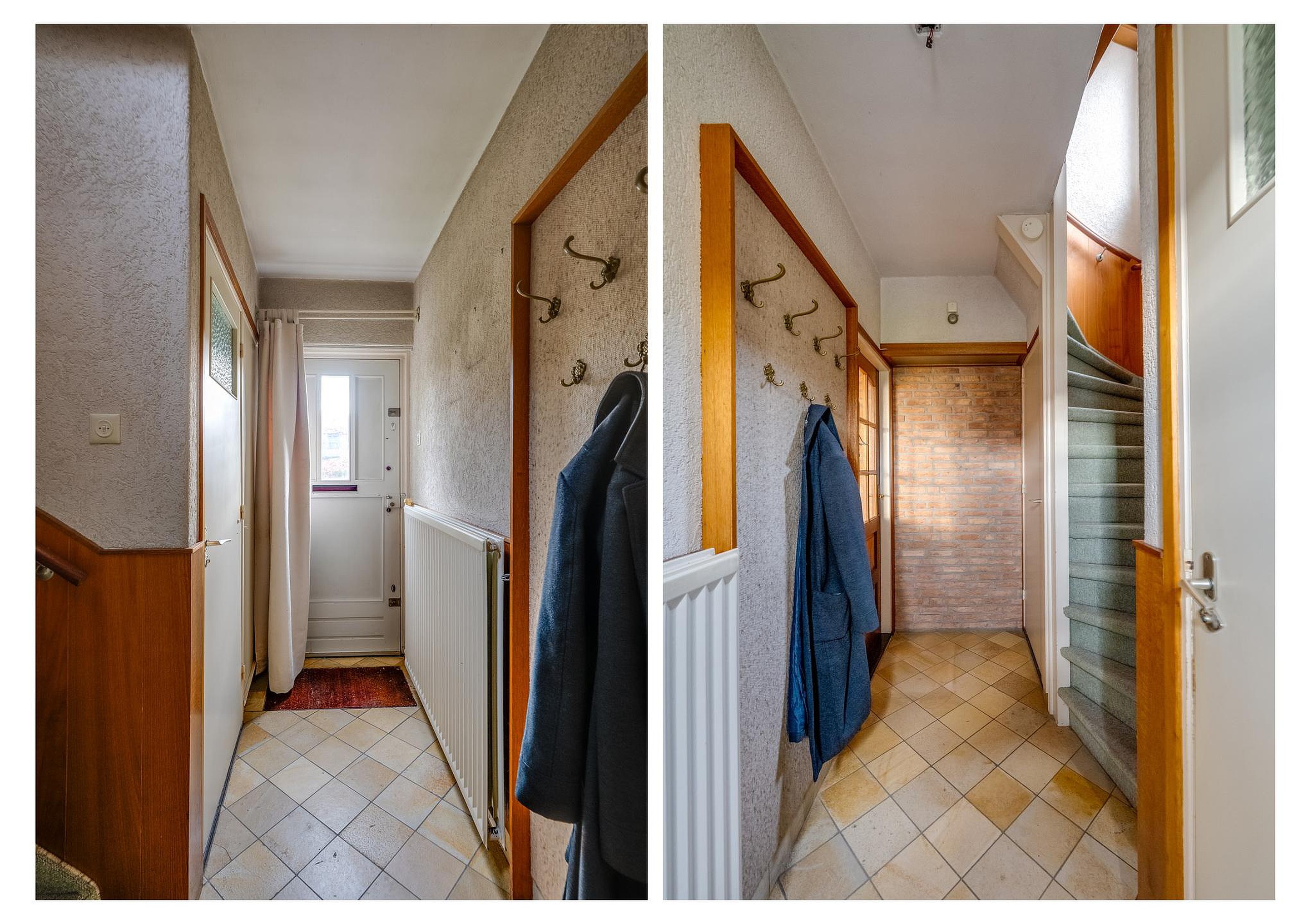 Bij het betreden van de woning komt u in de hal, welke toegang geeft tot het geheel betegeld toilet met fonteintje, de trapkast, de meterkast (7 groepen), de deur naar de woonkamer en de trapopgang naar de eerste verdieping.