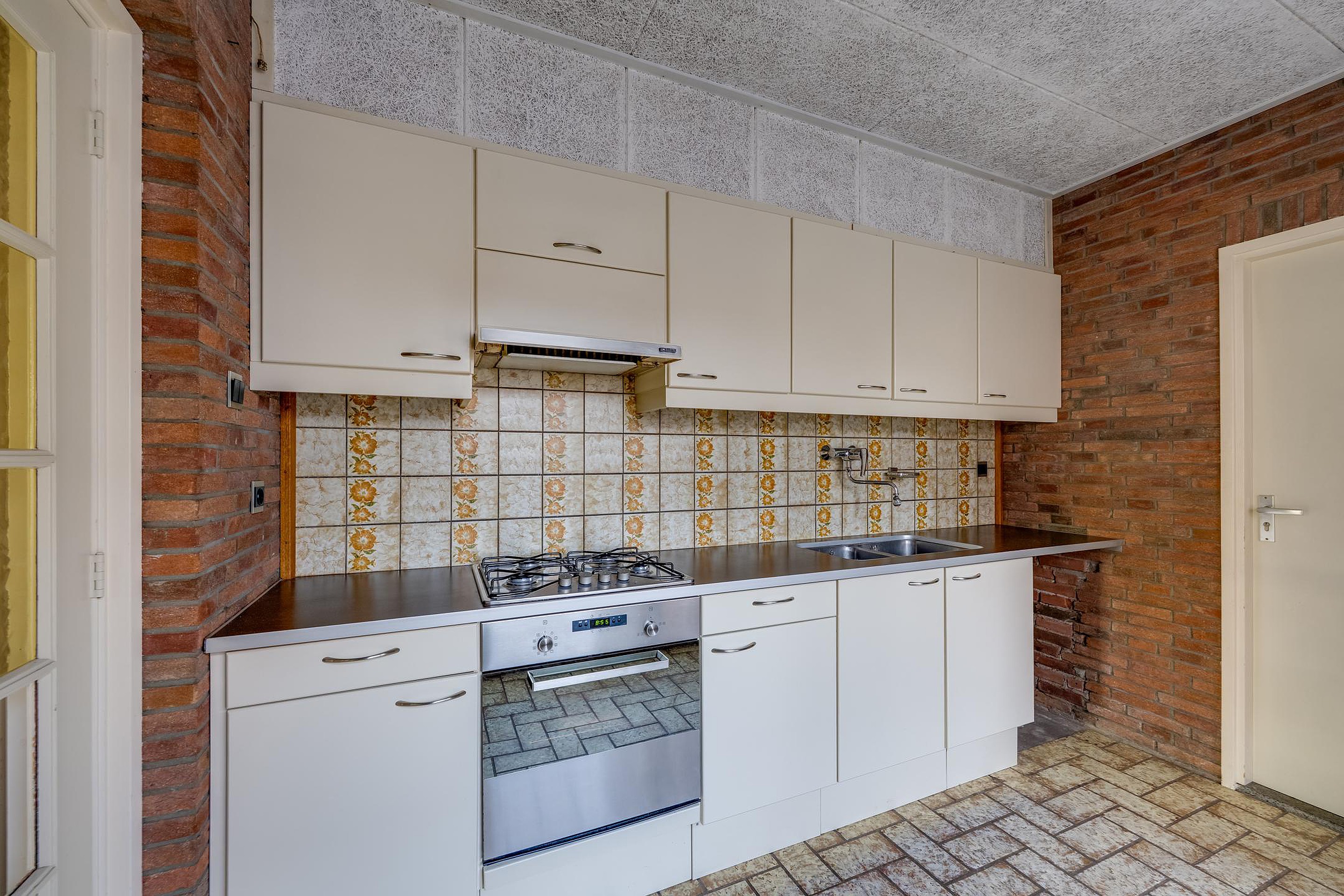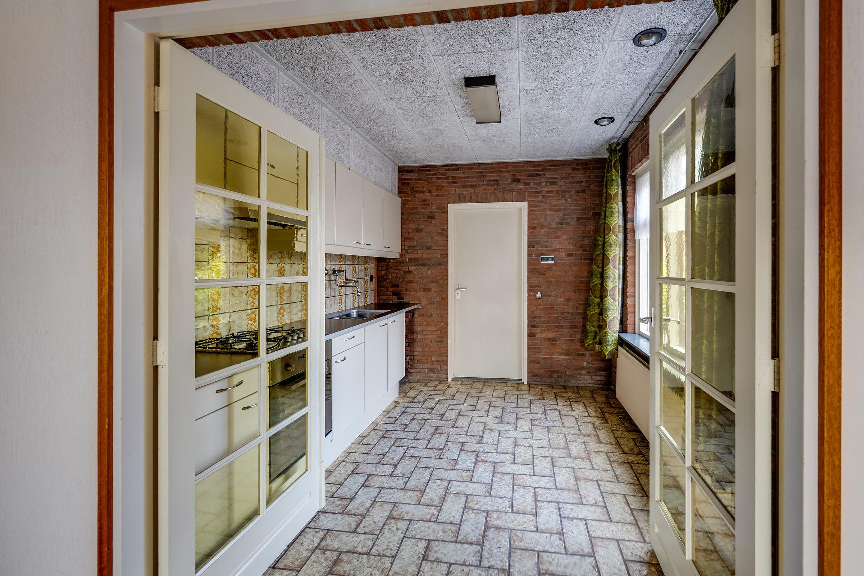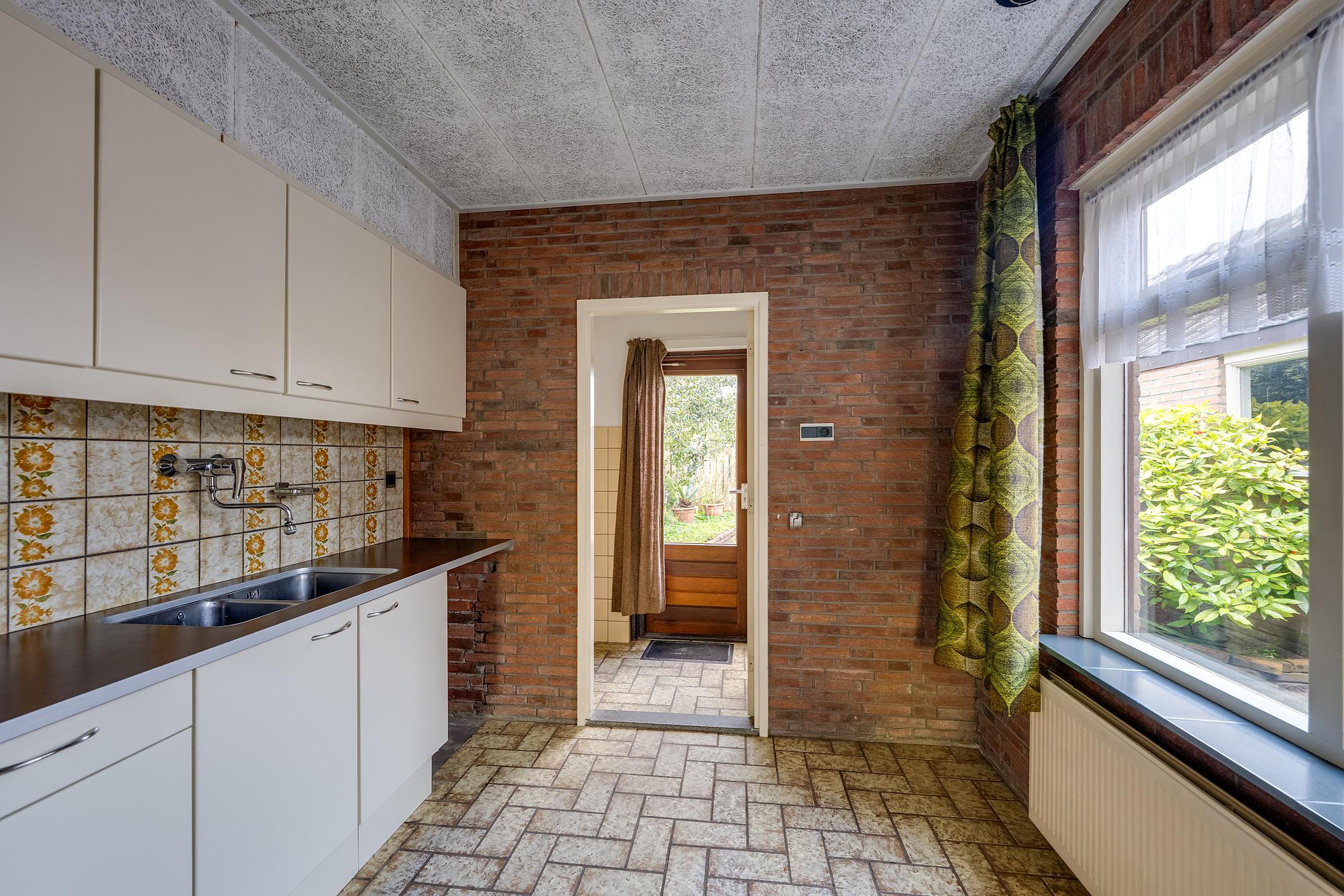 De gesloten keuken (3,24 m. x 2,72 m.) heeft een eenvoudig, eenzijdig opgesteld keukenblok met onder- en bovenkasten. De keuken is voorzien van een 4-pits gaskookplaat, een oven en een afzuigkap. Er ligt een tegelvloer. Het hardhouten kozijn is v.v. dubbel glas. Via de keuken komt u in de achterhal (2,75 m. x 1,09 m.) met een loopdeur naar de tuin.