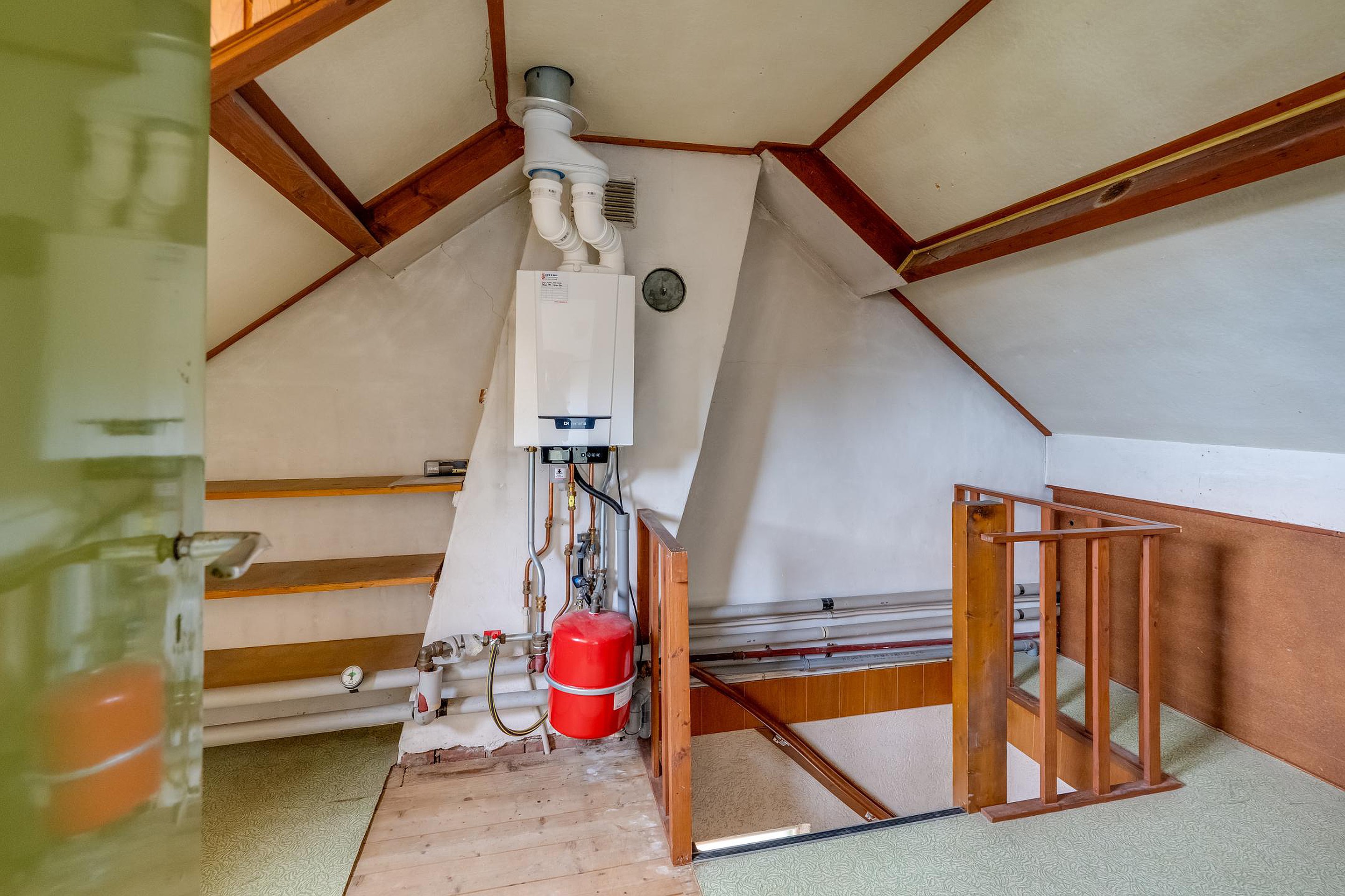 Tweede verdieping Op de voorzolder (3,96 m. x 2,50 m.) vindt u de cv-ketel (Remeha Tzerra Ace 28C, 2019) en mogelijkheden voor het plaatsen van een wasmachine. De dakkapel heeft een houten kozijn met enkel glas.