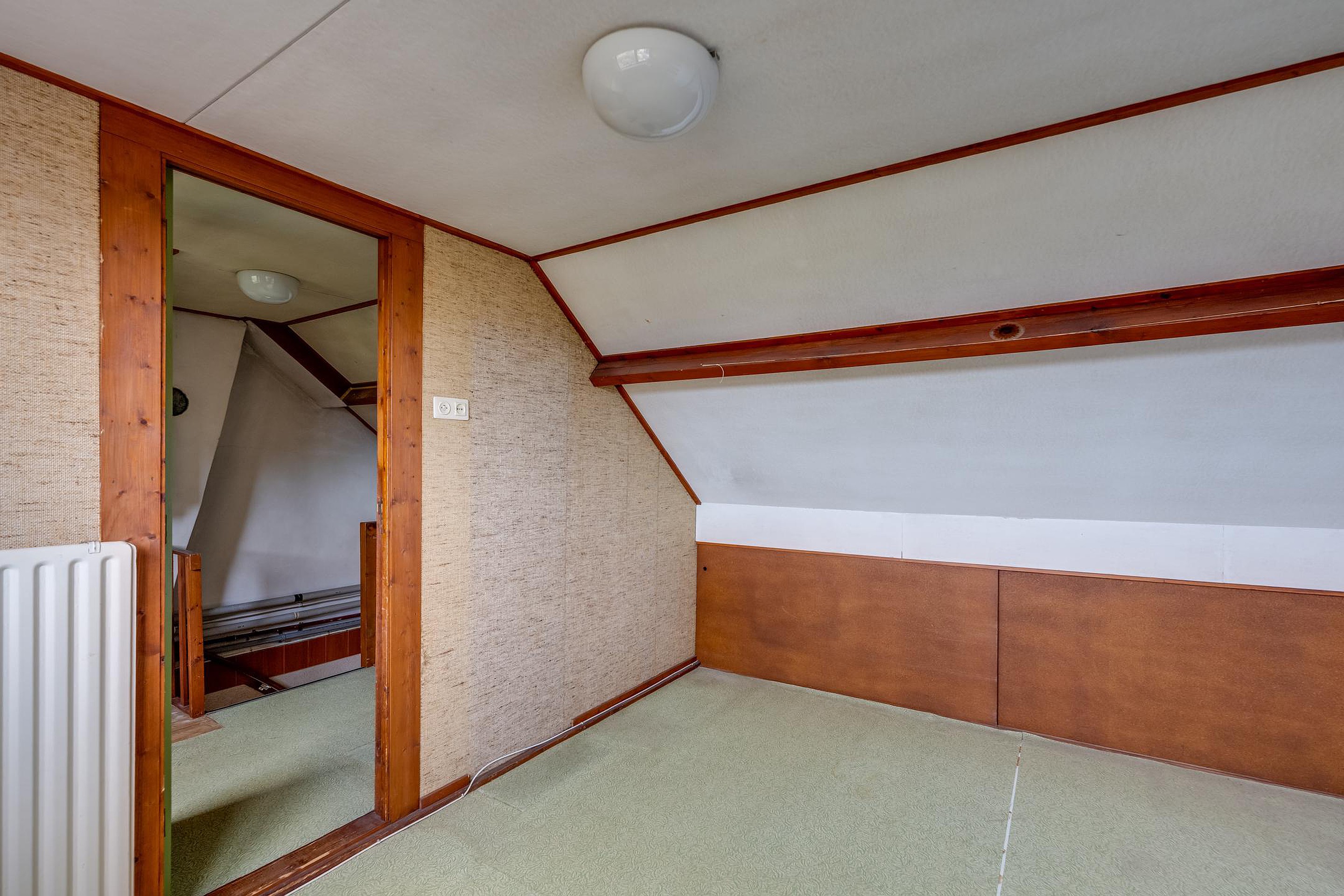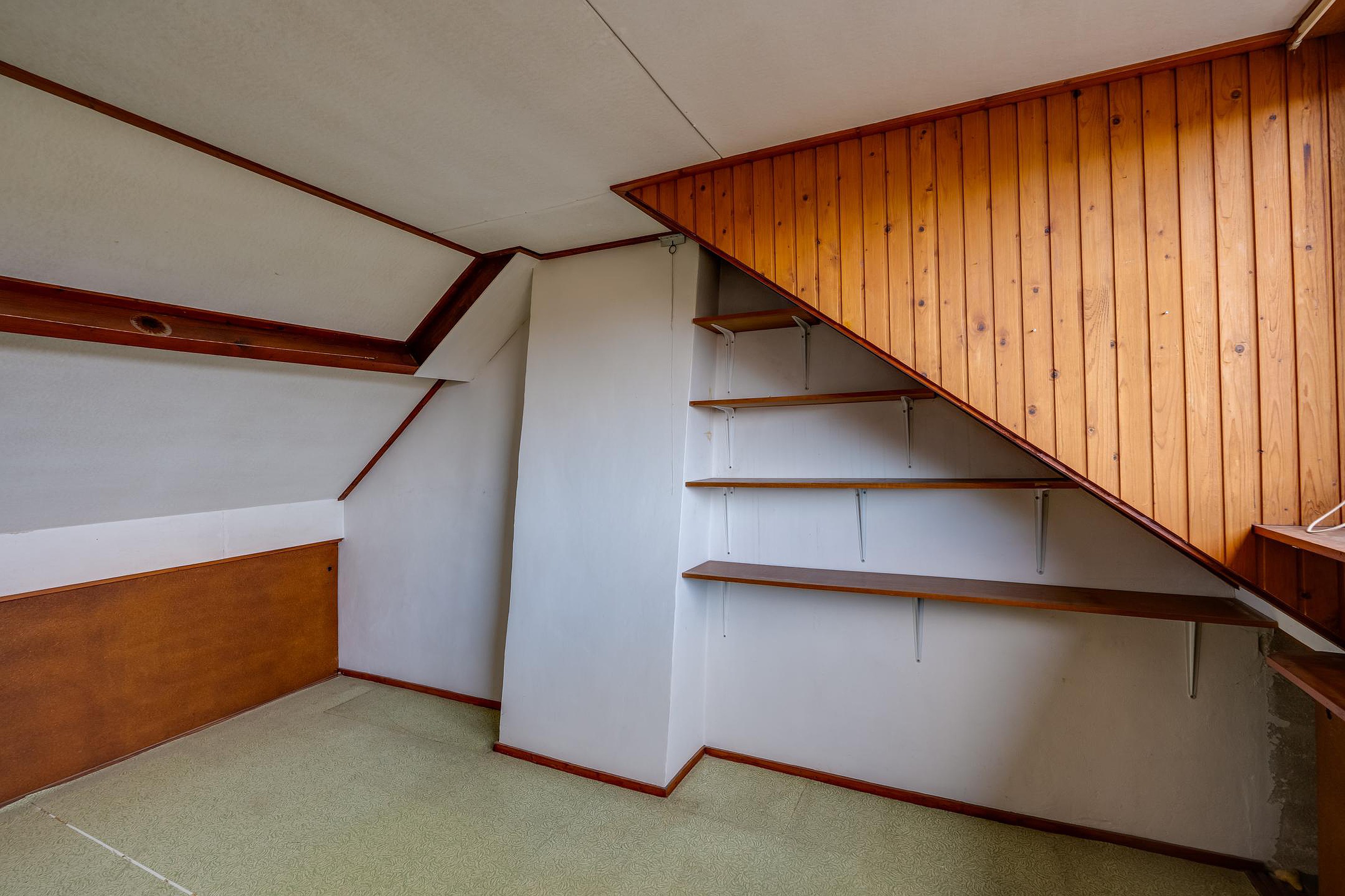 Deze slaapkamer (3,96 m. x 3,13 m.) heeft een dakkapel aan de achterzijde met houten kozijnen v.v. enkel glas. Aan 2 zijden vindt u extra bergruimte achter de knieschotten.