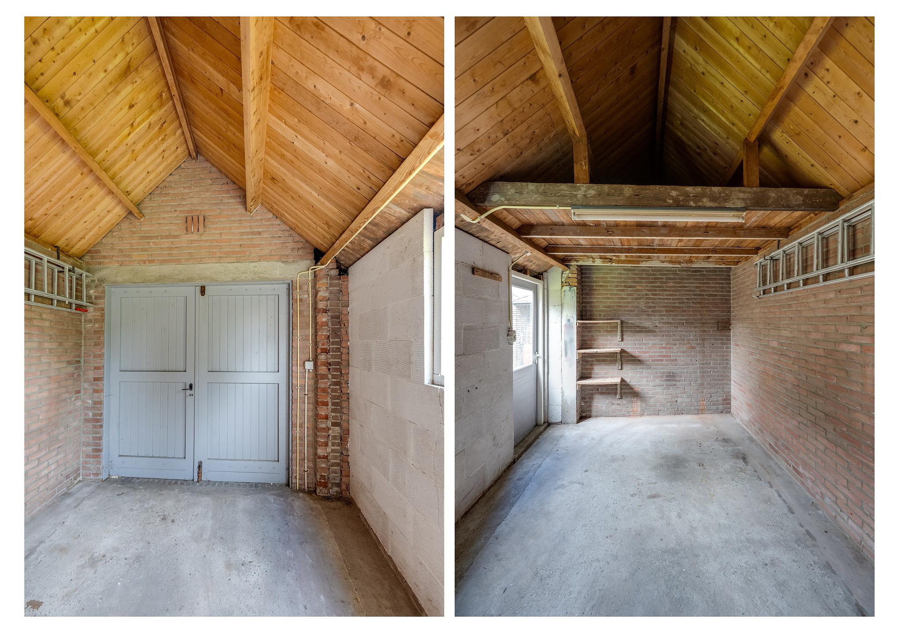 Direct achter de garage, via de tuin te bereiken, staat een berging (2,84 m. x 2,81 m.) v.v. elektra. Ook hier is een kleine vliering voor extra bergruimte.