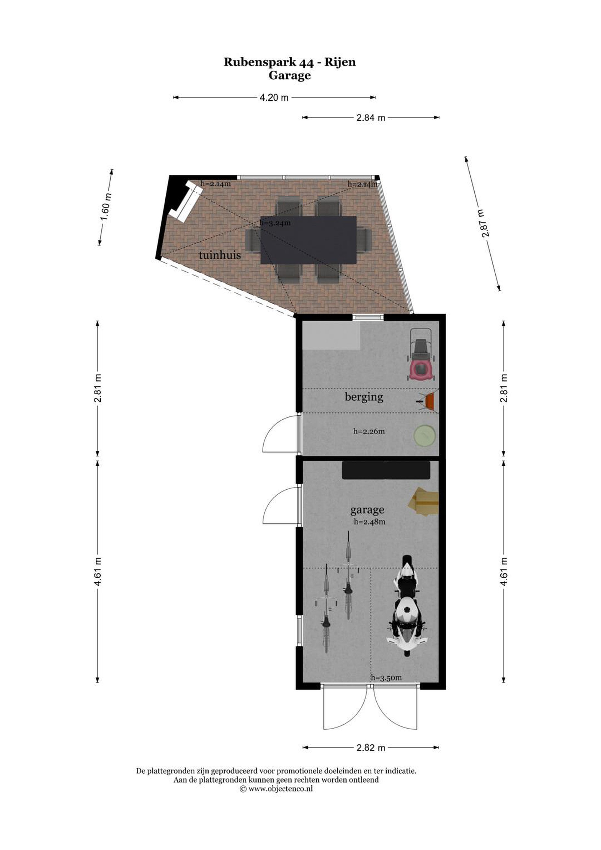 De garage (4,61 m. x 2,82 m.) heeft aan de opritzijde twee houten, openslaande deuren en aan de tuinzijde een houten loopdeur. De garage is v.v. elektra en een kleine vliering.