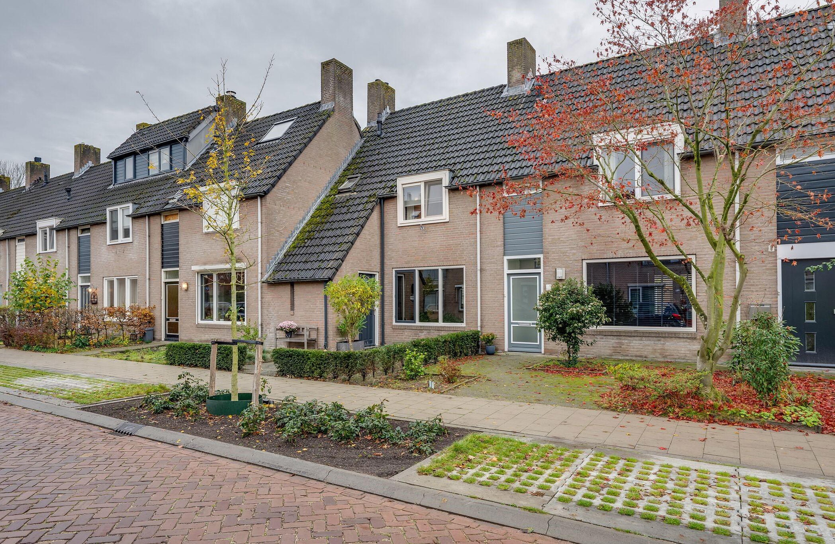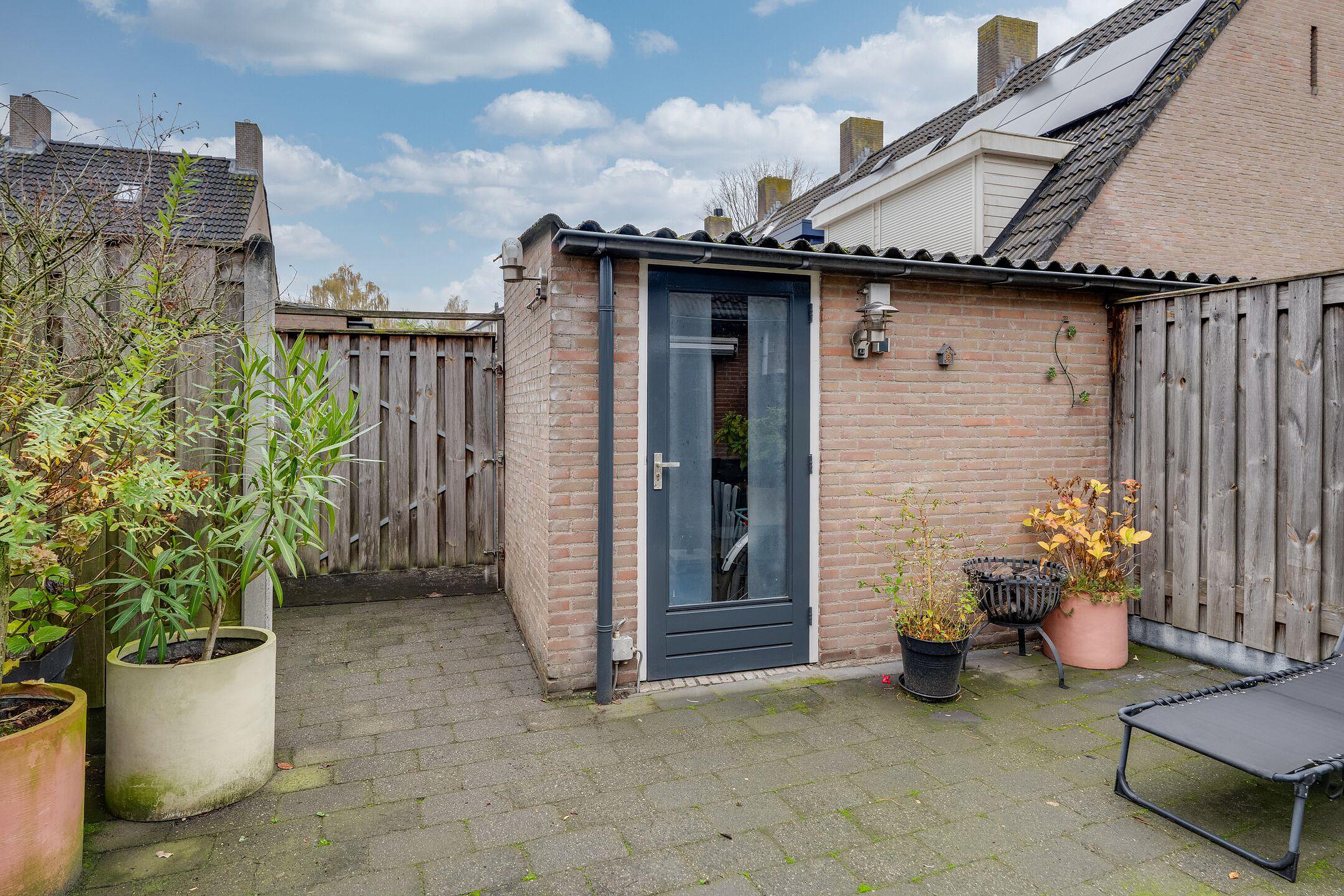 Tuin De achtertuin (ca. 8 m. x 5,40 m.) ligt op het zuidwesten en is voorzien van sierbestrating. Direct achter de woning hangt een elektrisch zonnescherm. Er is een buitenkraan. De houten schuttingen hebben betonnen randen en betonnen palen. Achter in de tuin staat een stenen berging (2,93 m. x 1,98 m.) v.v. elektra. Via een poort kunt u achterom.