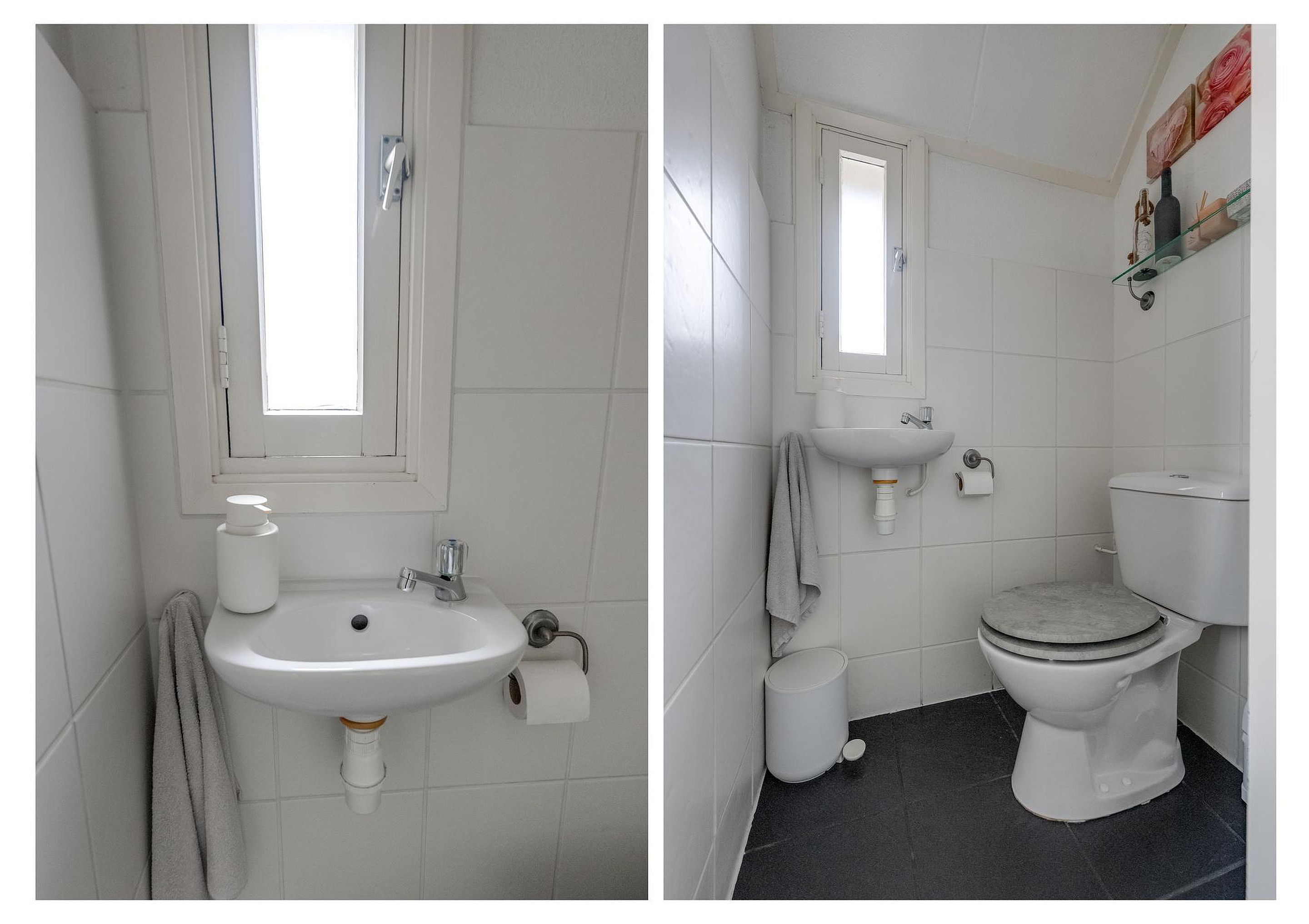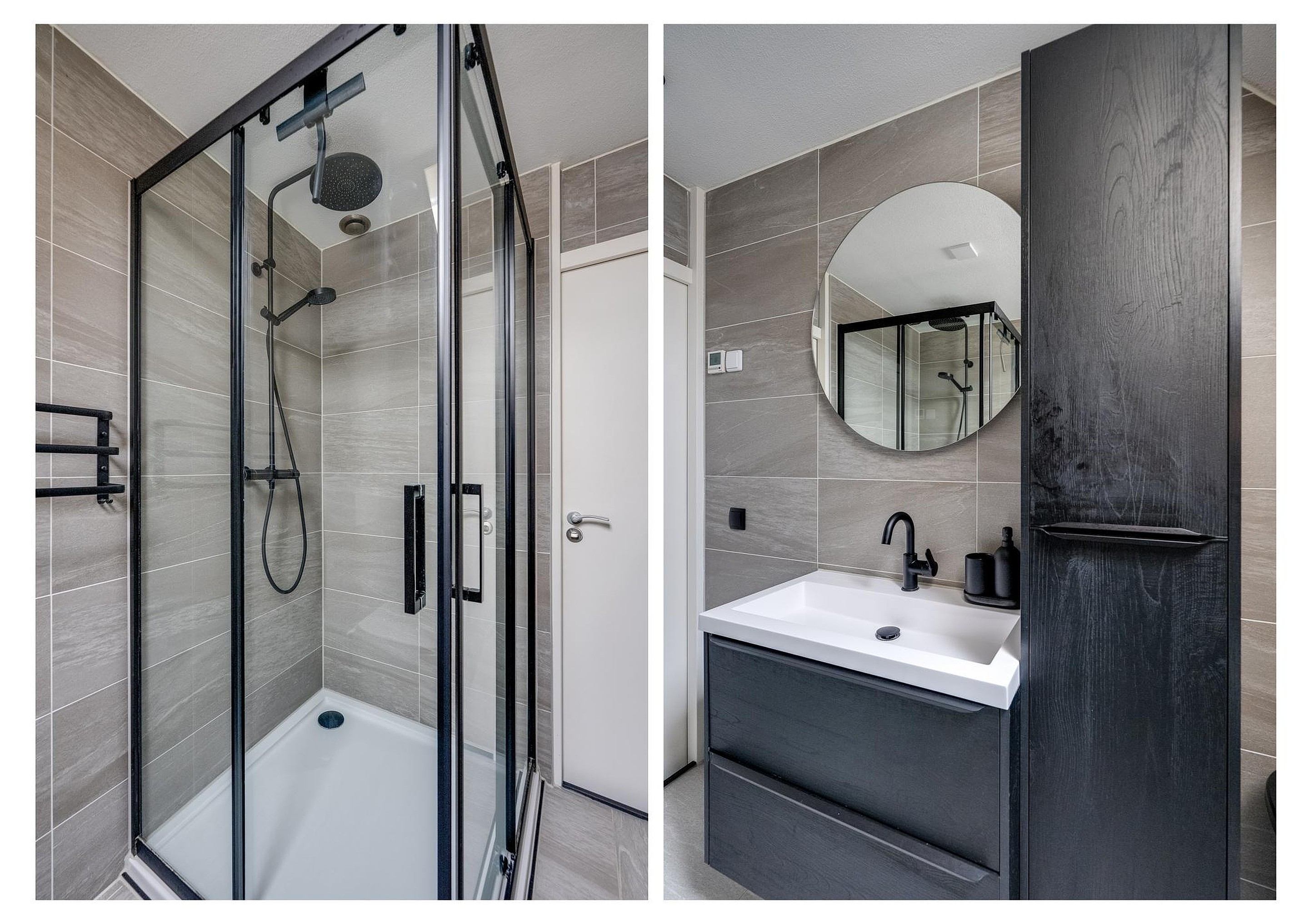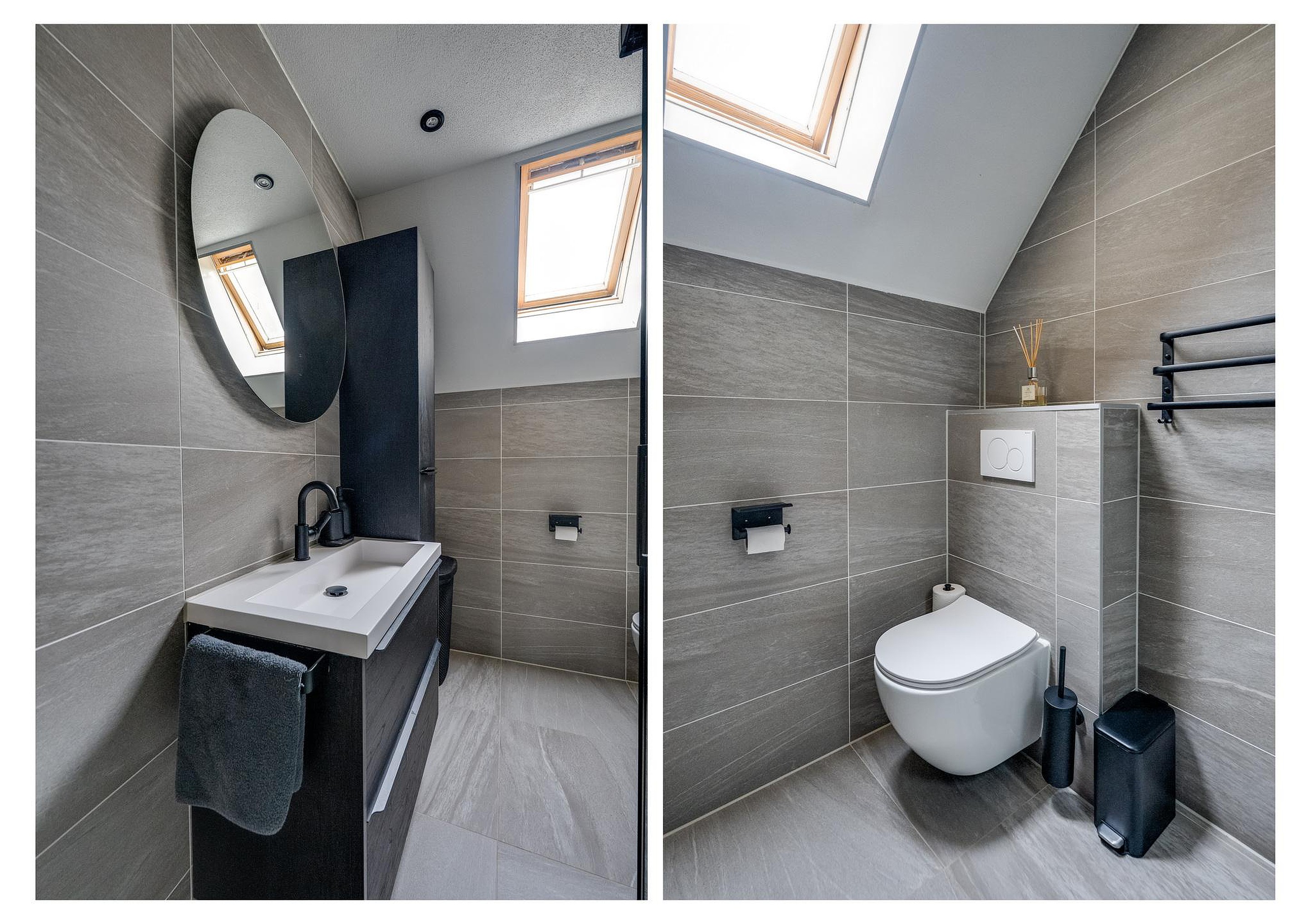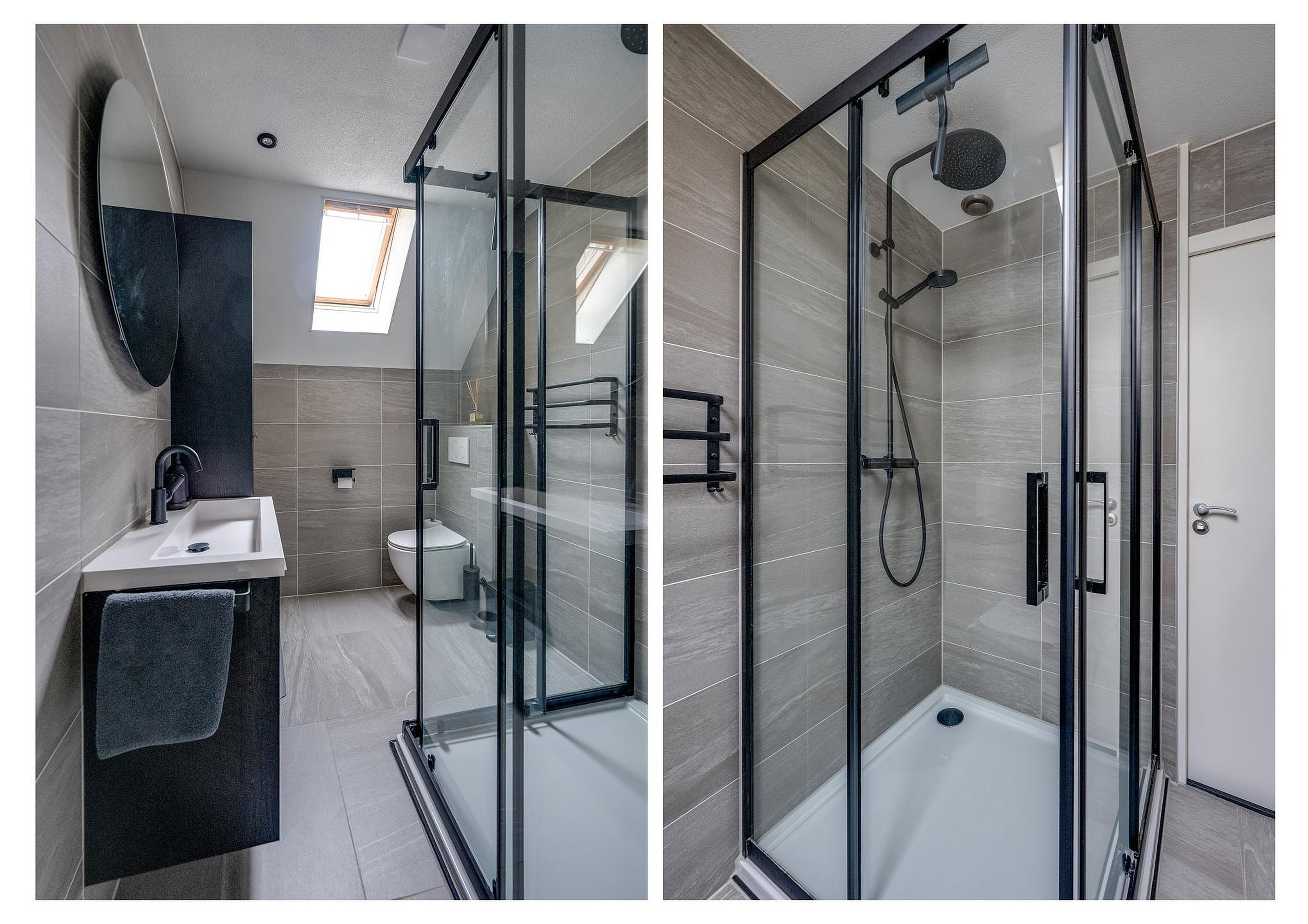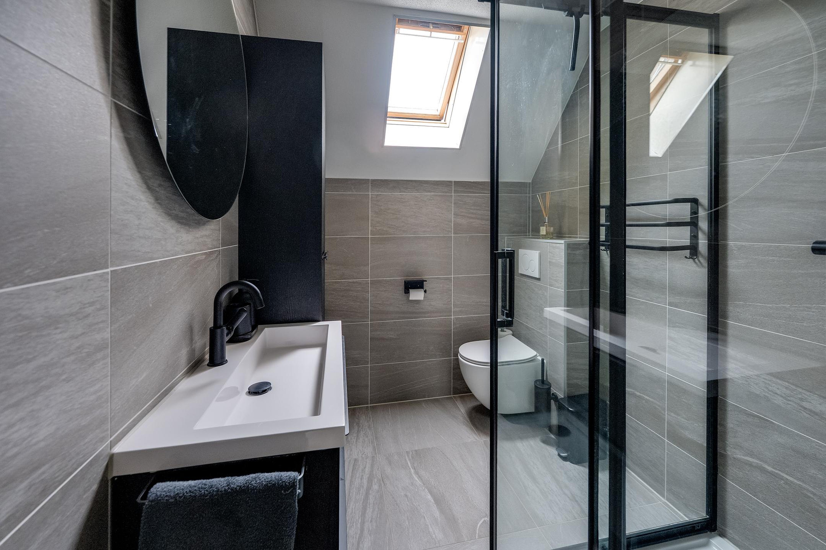 De badkamer (2,32 m. x 1,82 m.) heeft een douchecabine met zwarte thermostaatkraan, een zwevend toilet en een zwart wastafelmeubel met zwarte kraan en een zwevende kast. Er is een houten Velux dakraam v.v. dubbel glas.