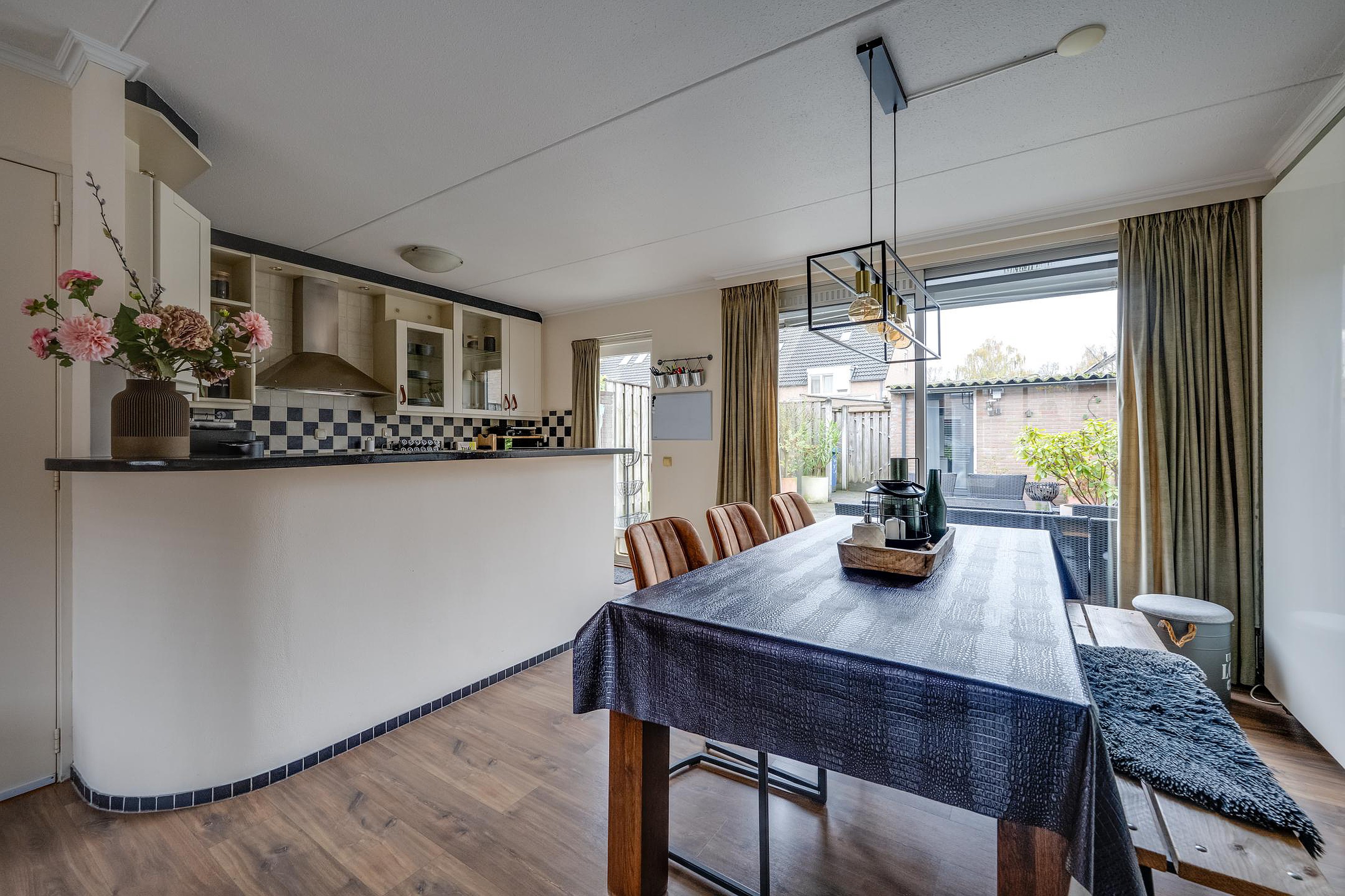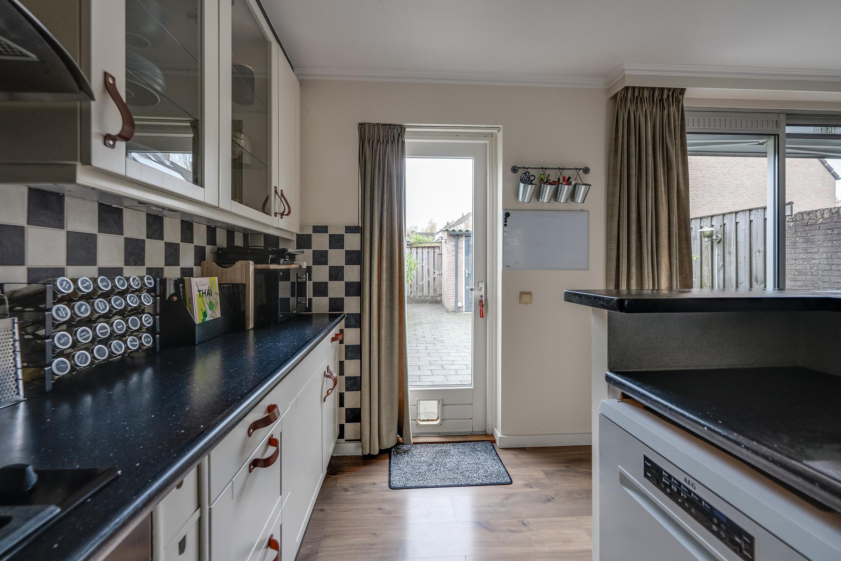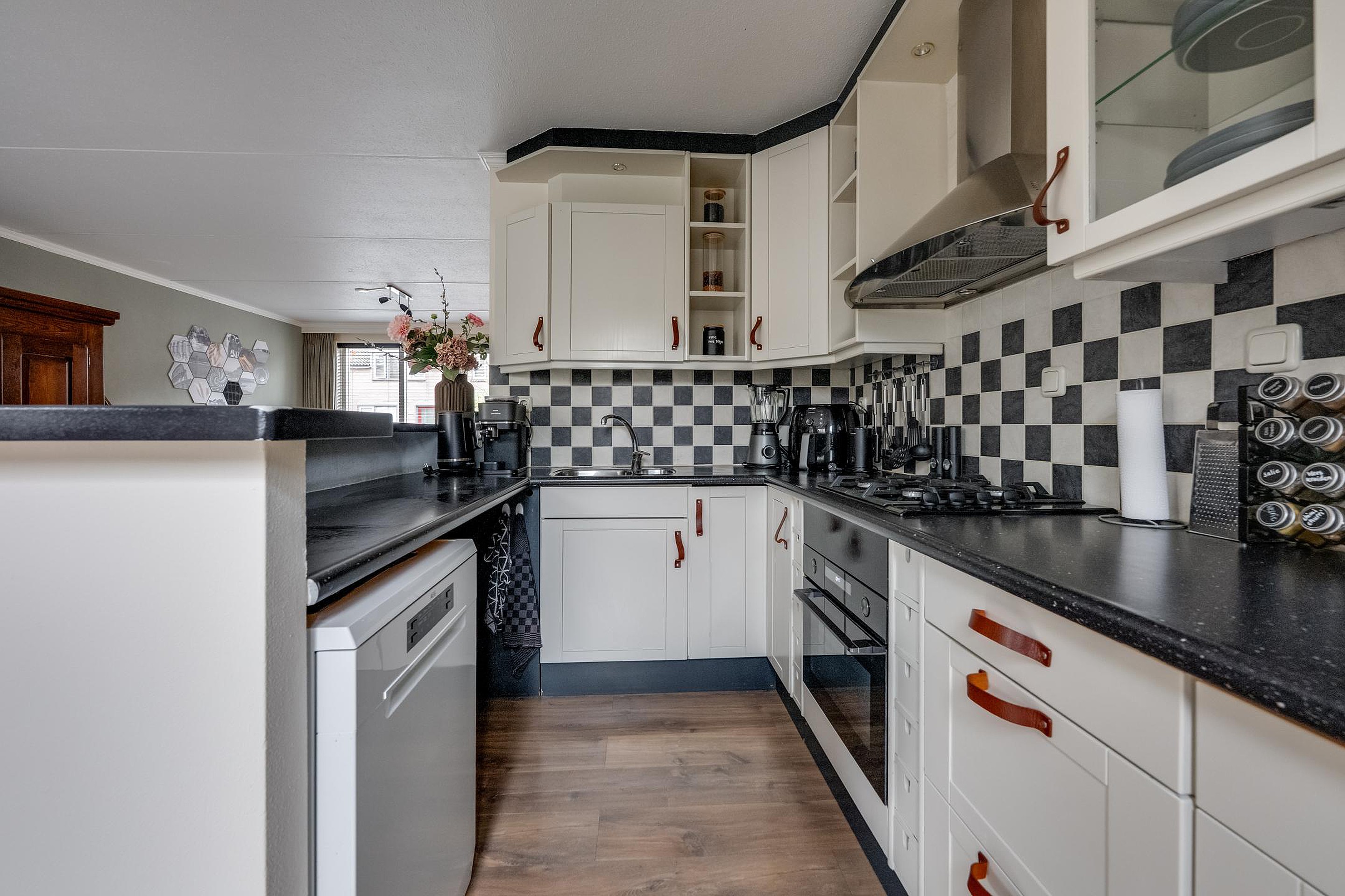 De keuken (3,37 m. x 2,12 m.) is voorzien van een 4-pits gaskookplaat met rvs afzuigkap, een tafelkoelkast, een vaatwasser en een combi-oven. De keuken is deels betegeld. Vanuit de keuken kunt u naar de achtertuin. De hardhouten loopdeur is v.v. dubbel glas en geeft toegang tot de achtertuin.