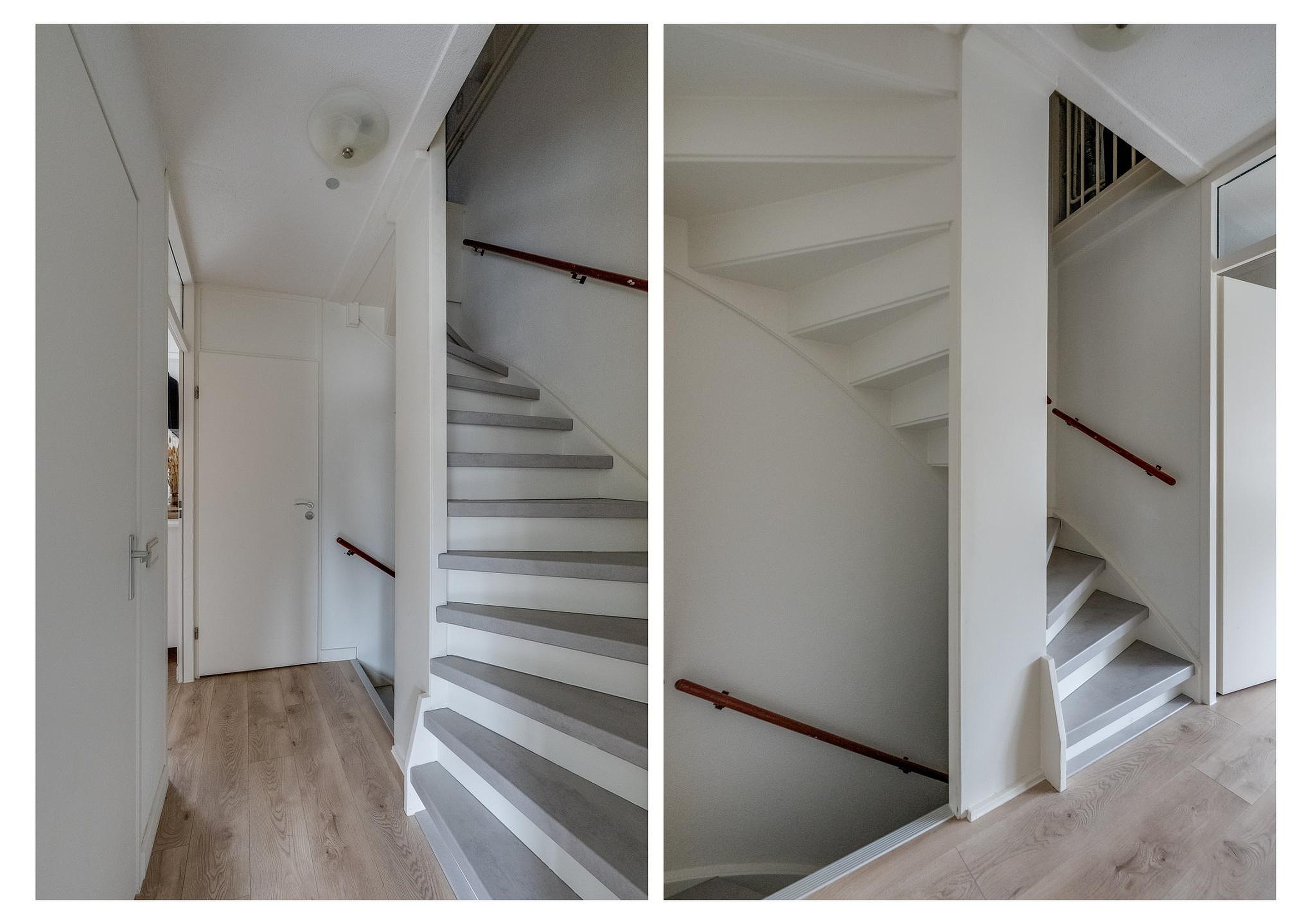 Eerste verdieping Vanuit de hal heeft u toegang tot 2 slaapkamers (voorheen 3), de moderne badkamer, een vaste legkast en de vaste trap naar de tweede verdieping. De hal en slaapkamers hebben een doorlopende laminaatvloer. De kunststof kozijnen op de slaapkamers zijn allen v.v. dubbel glas en horren.