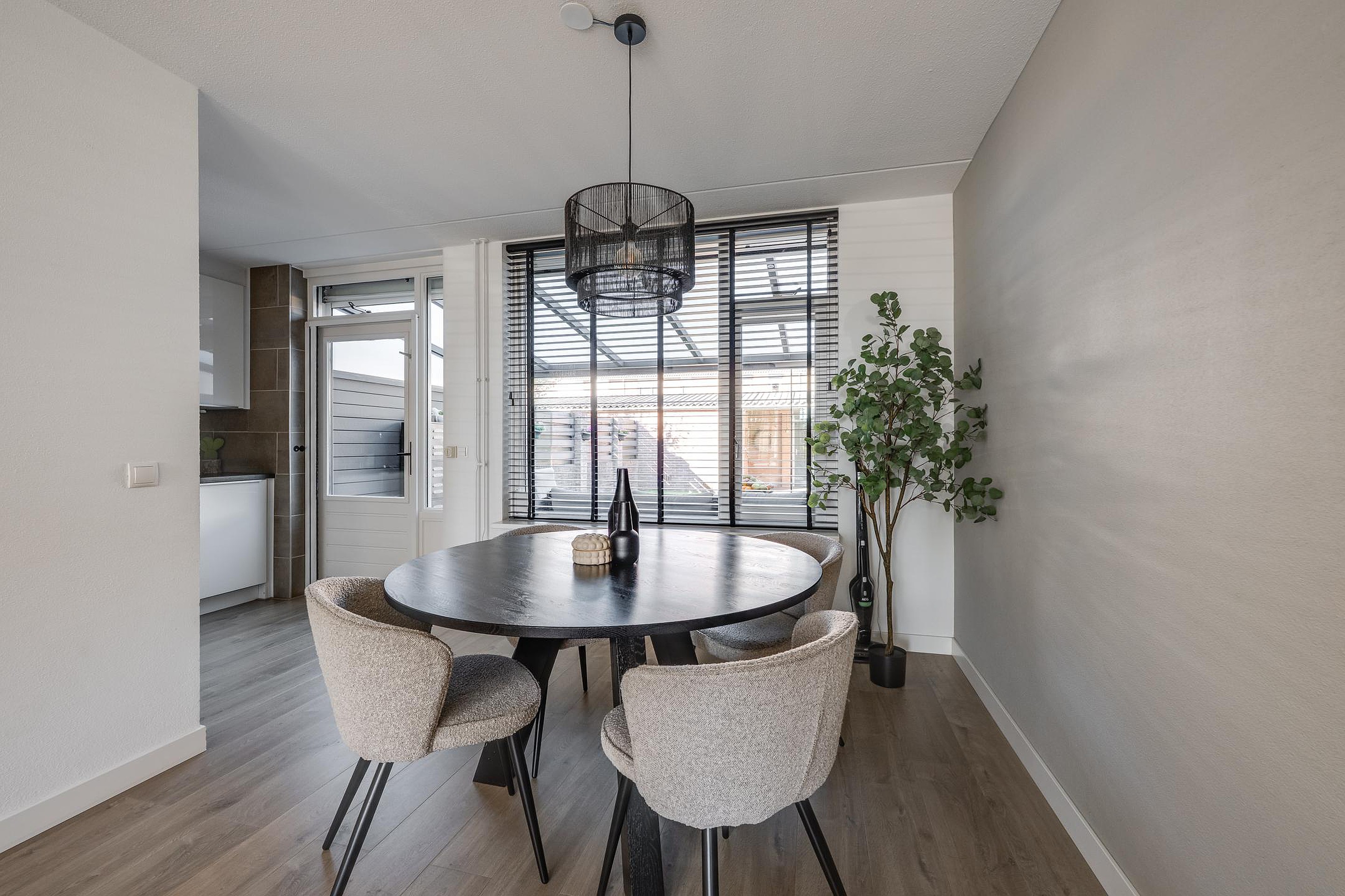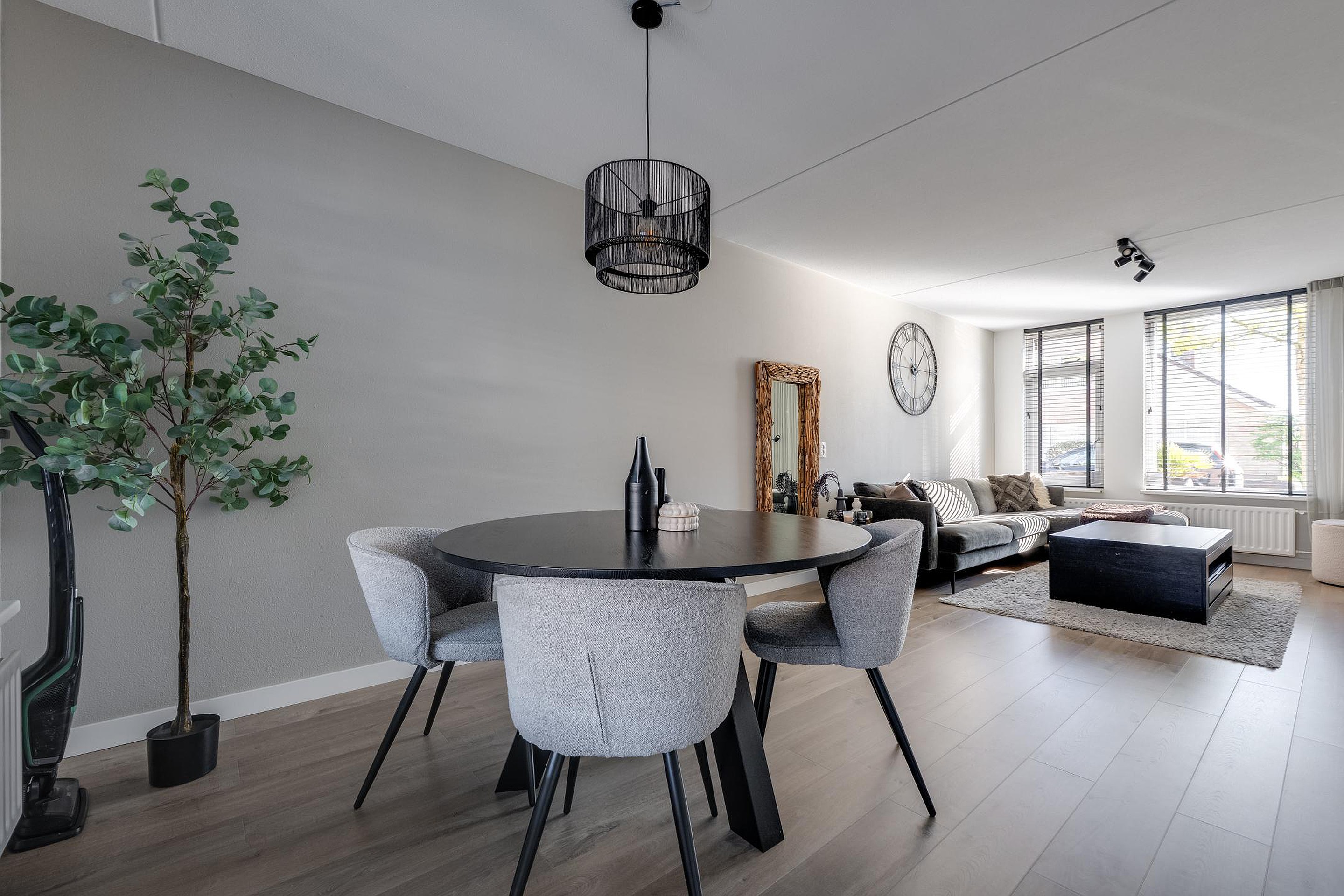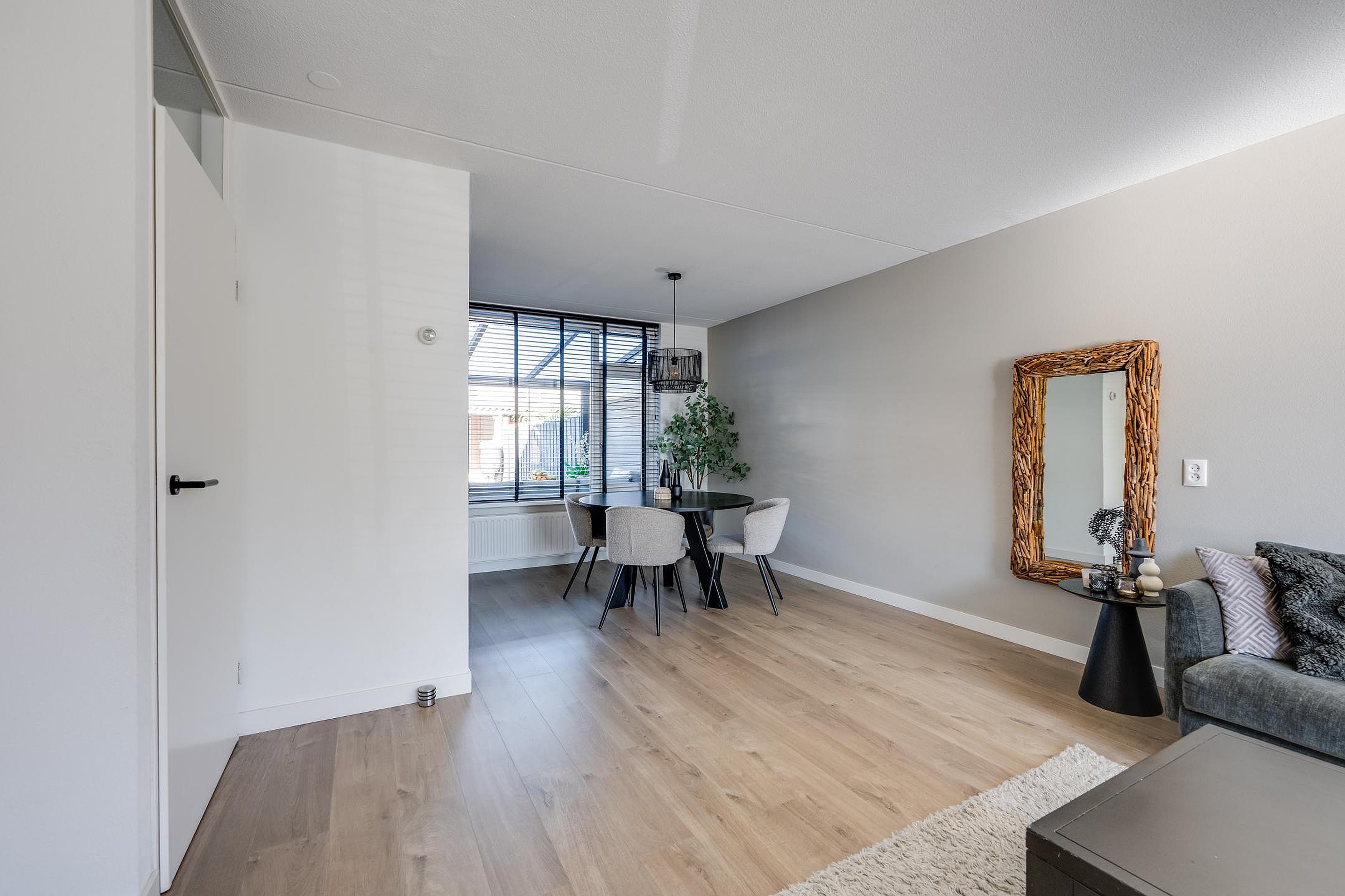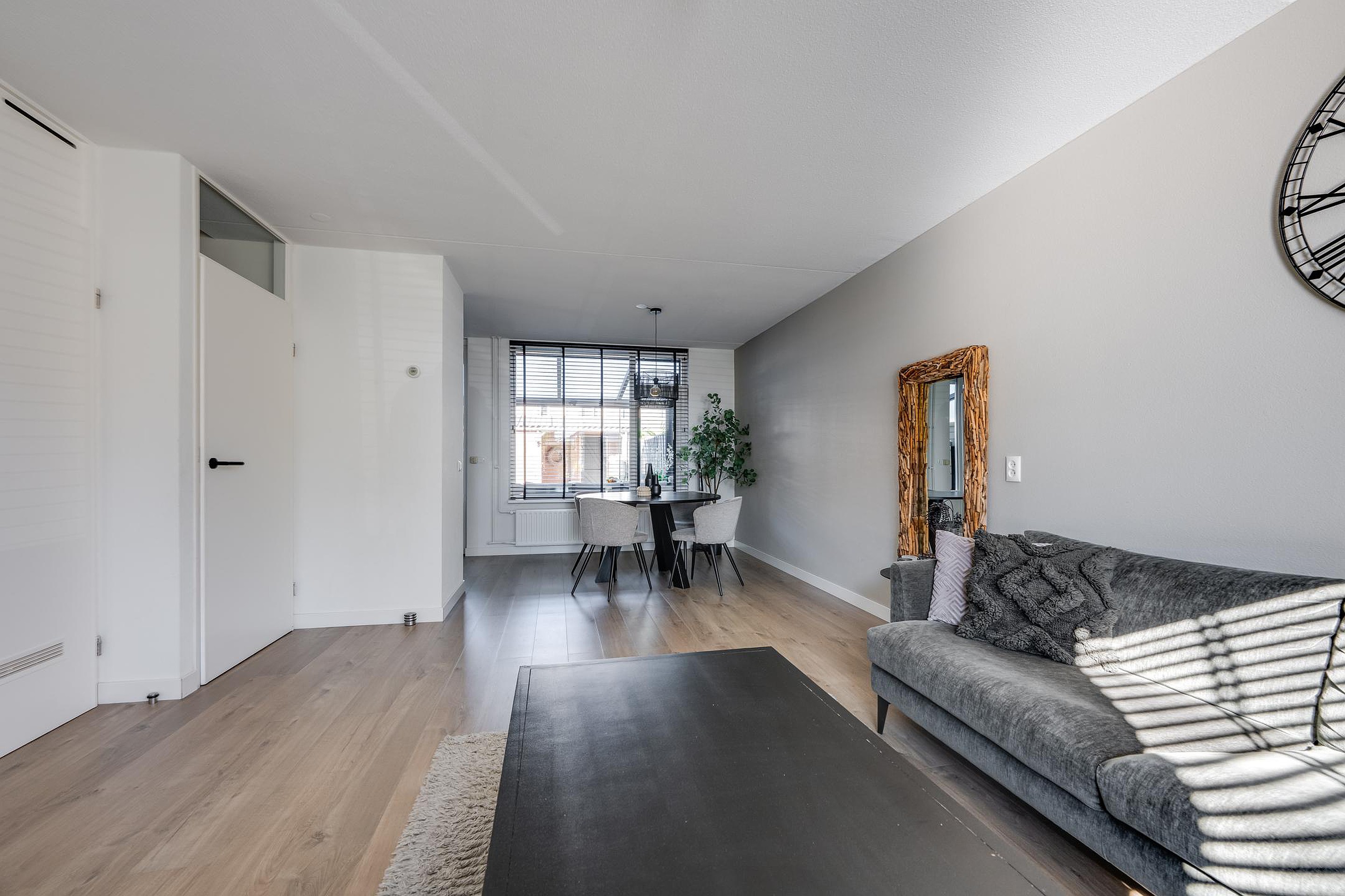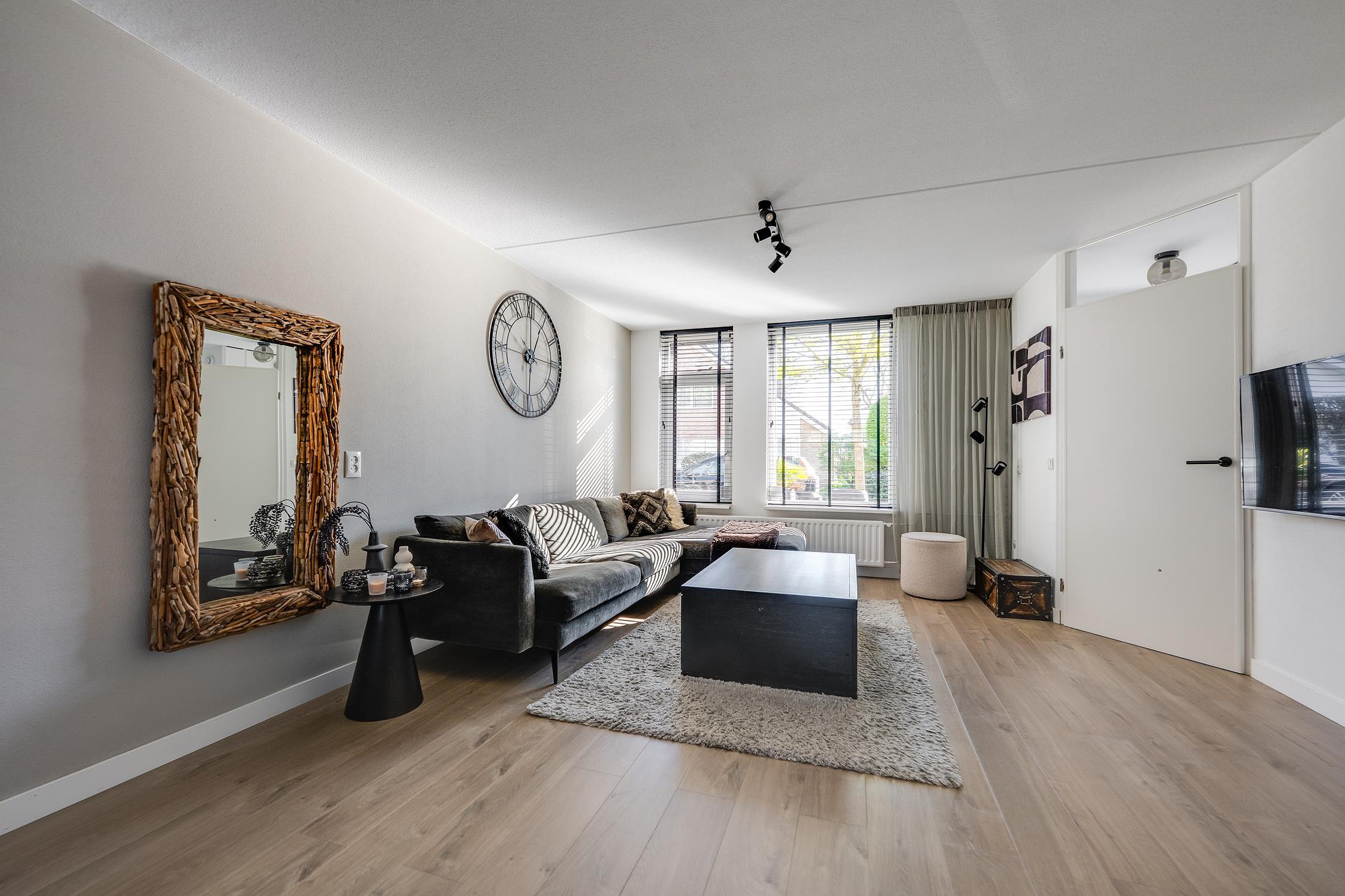 De lichte woonkamer (7,46 m. x 3,50 m.) heeft aan de De hardhouten kozijnen zijn v.v. dubbel glas. De twee kozijnen aan de voorzijde hebben handmatige rolluiken en het kozijn aan de achterzijde heeft een elektrisch rolluik.