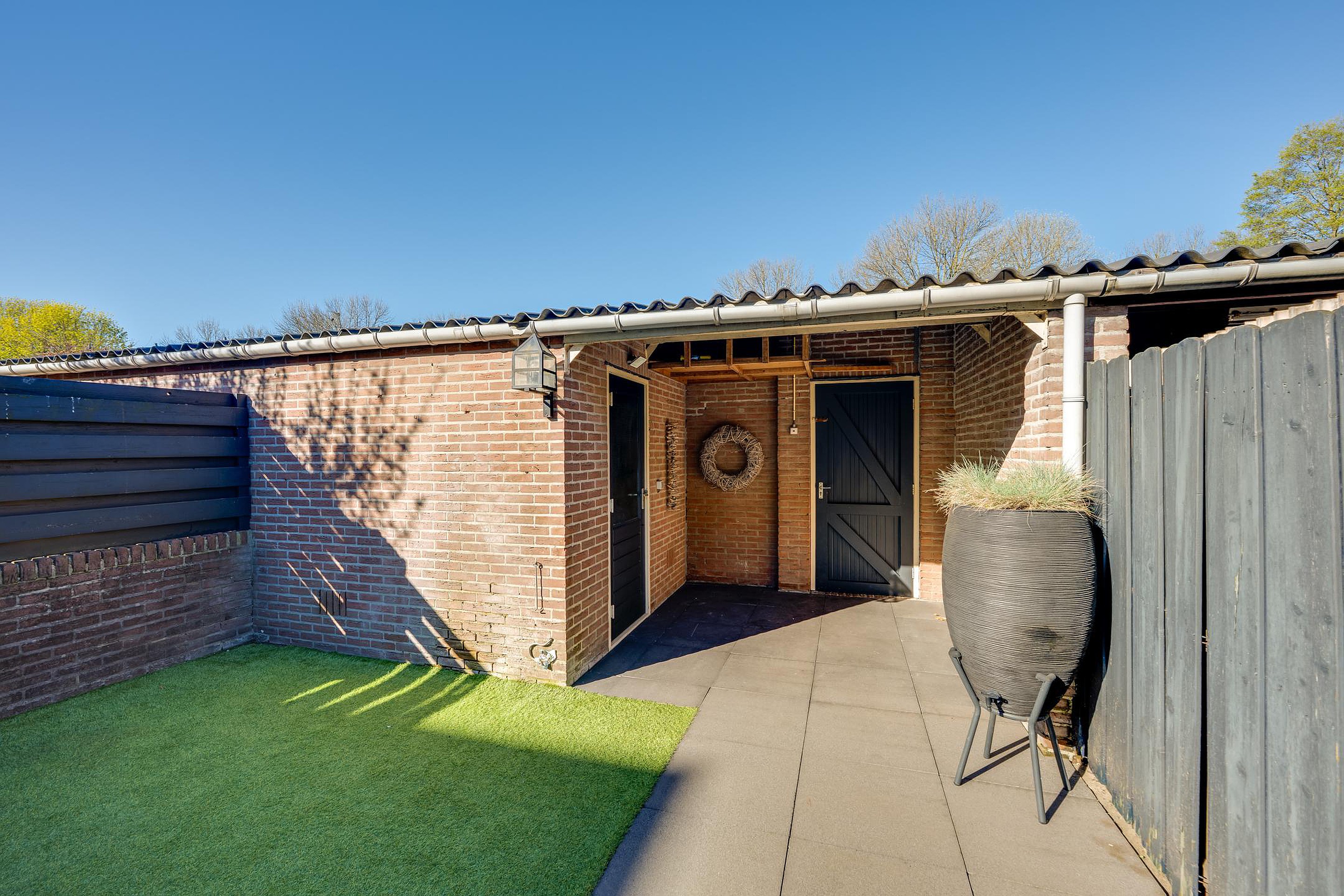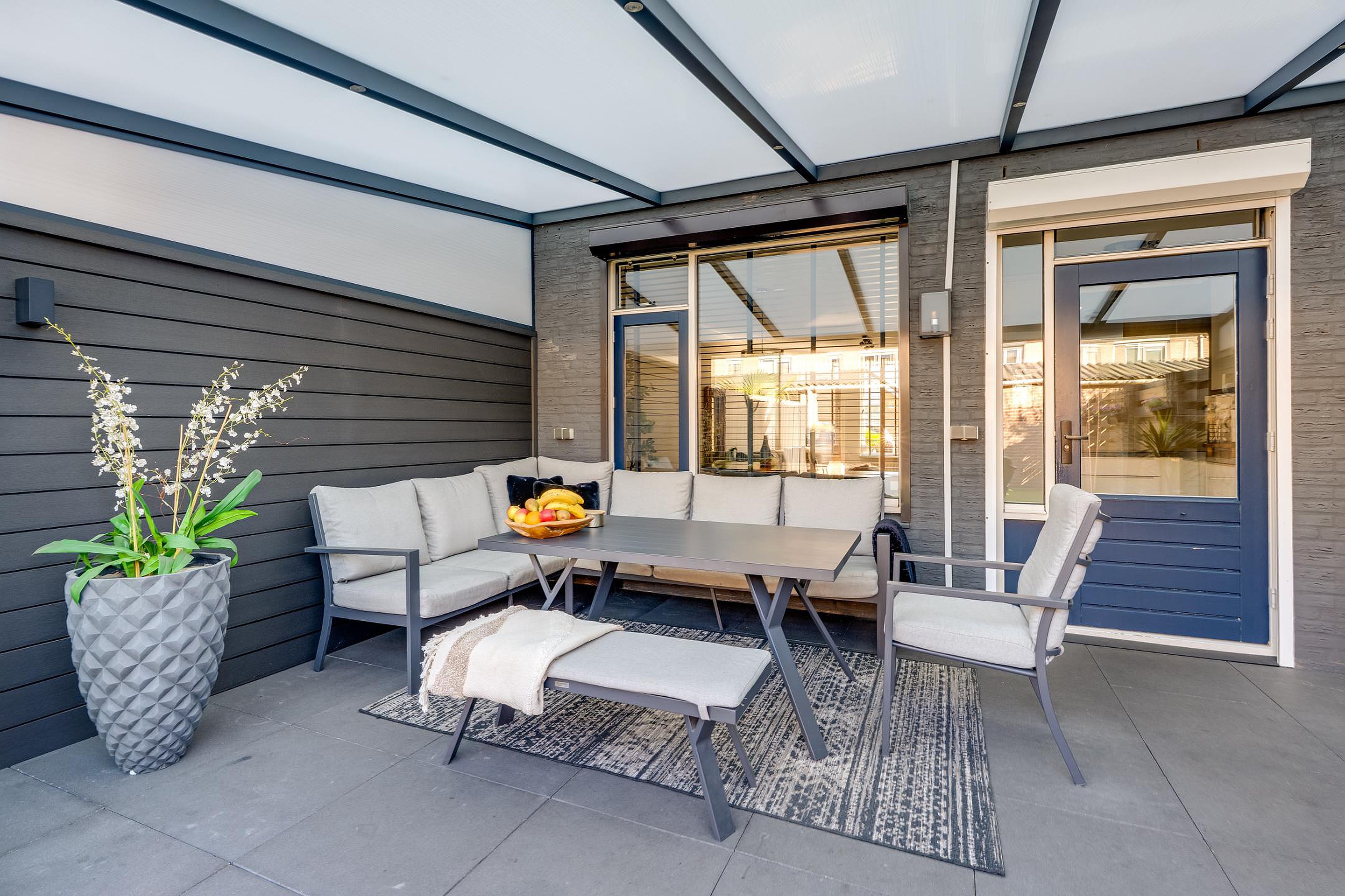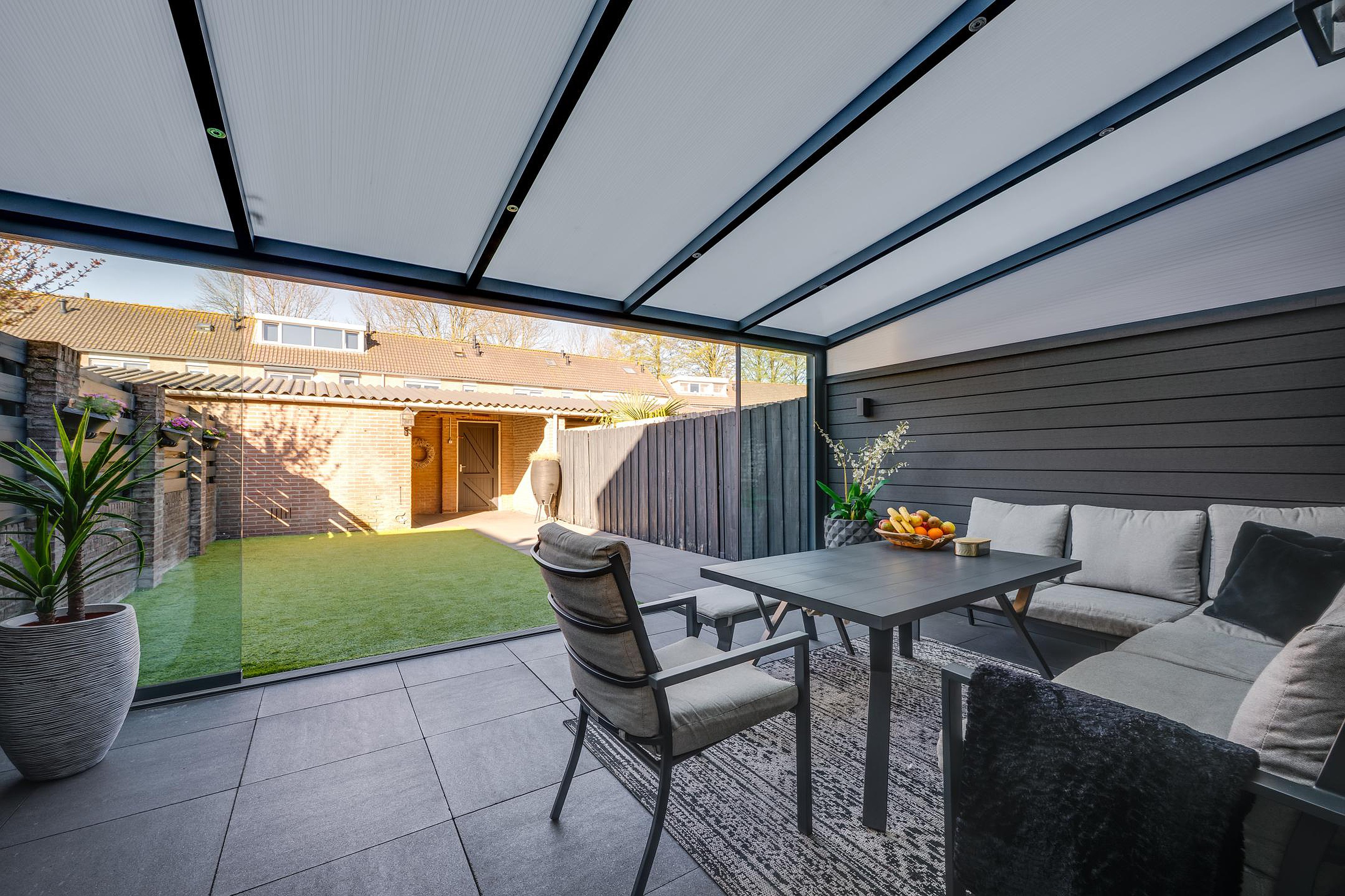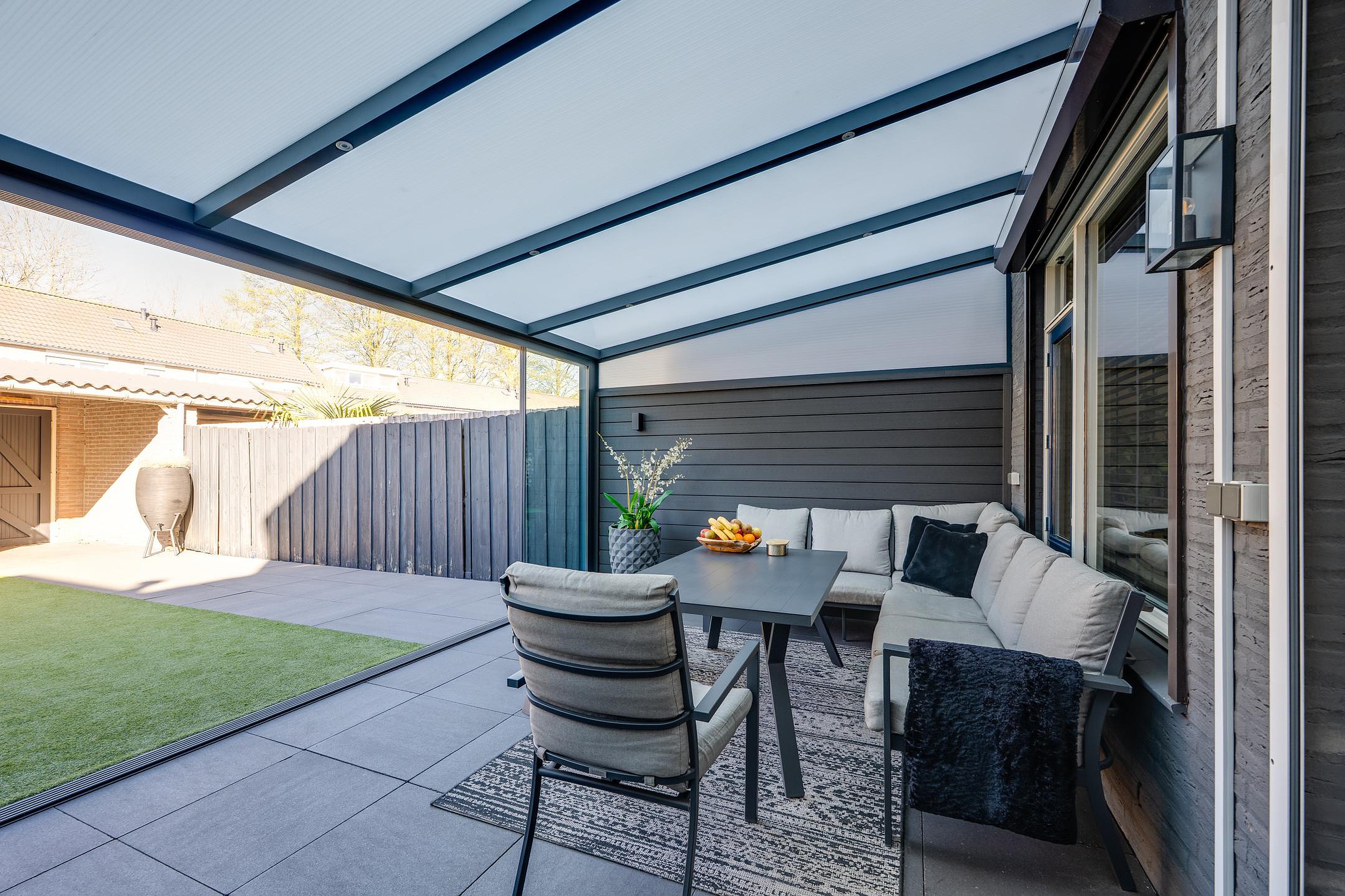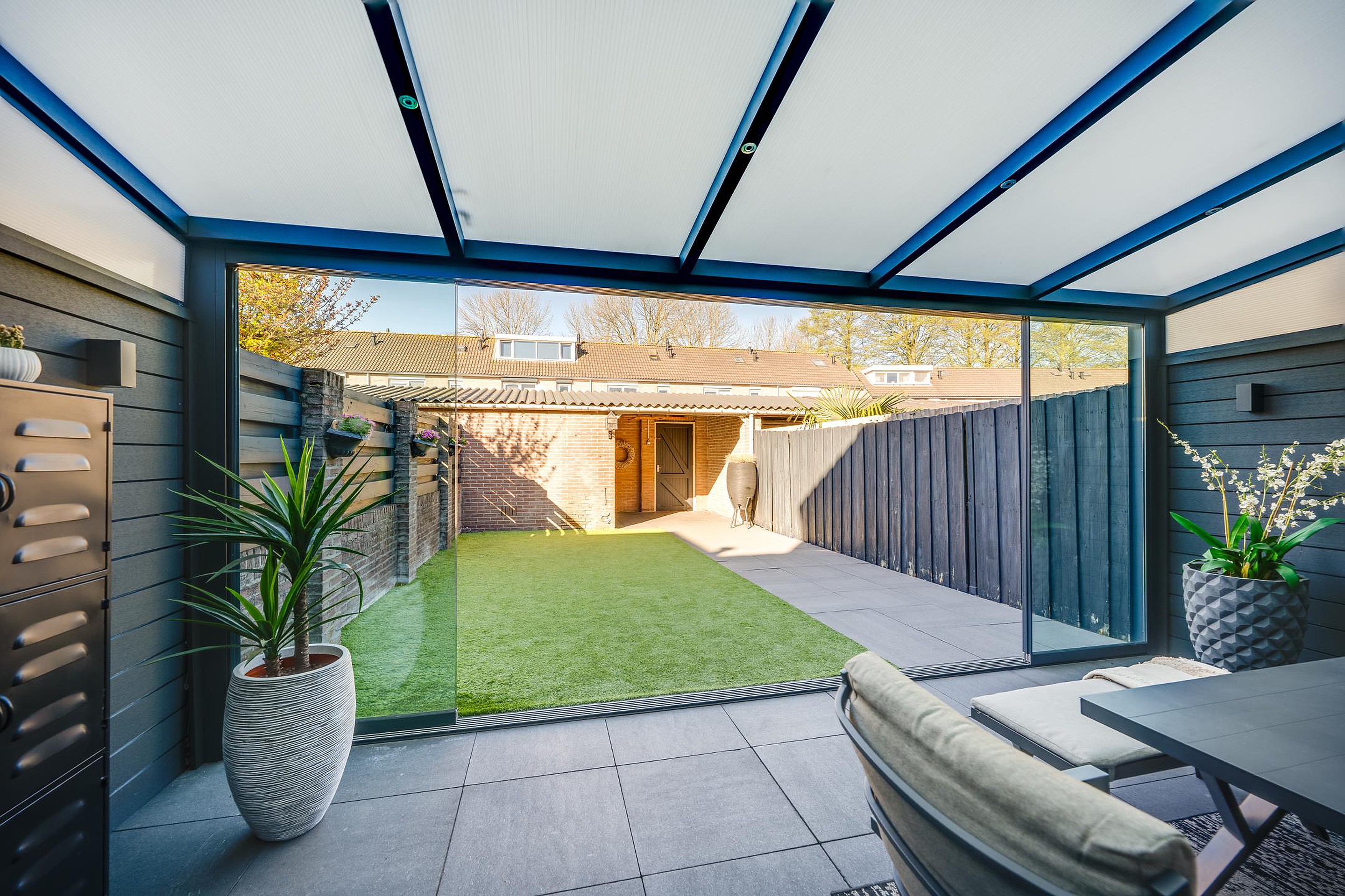 - onderhoudsvrije achtertuin met tuinserre en berging op het zuidwesten