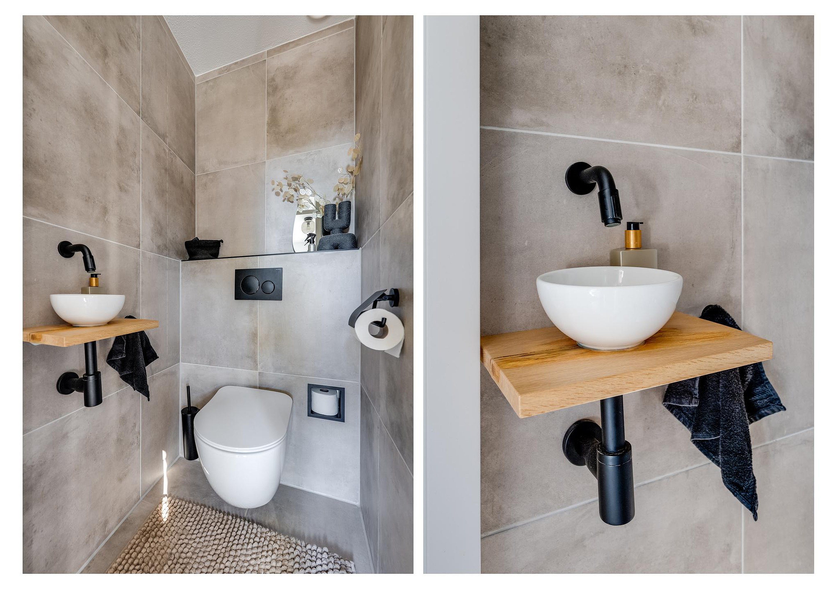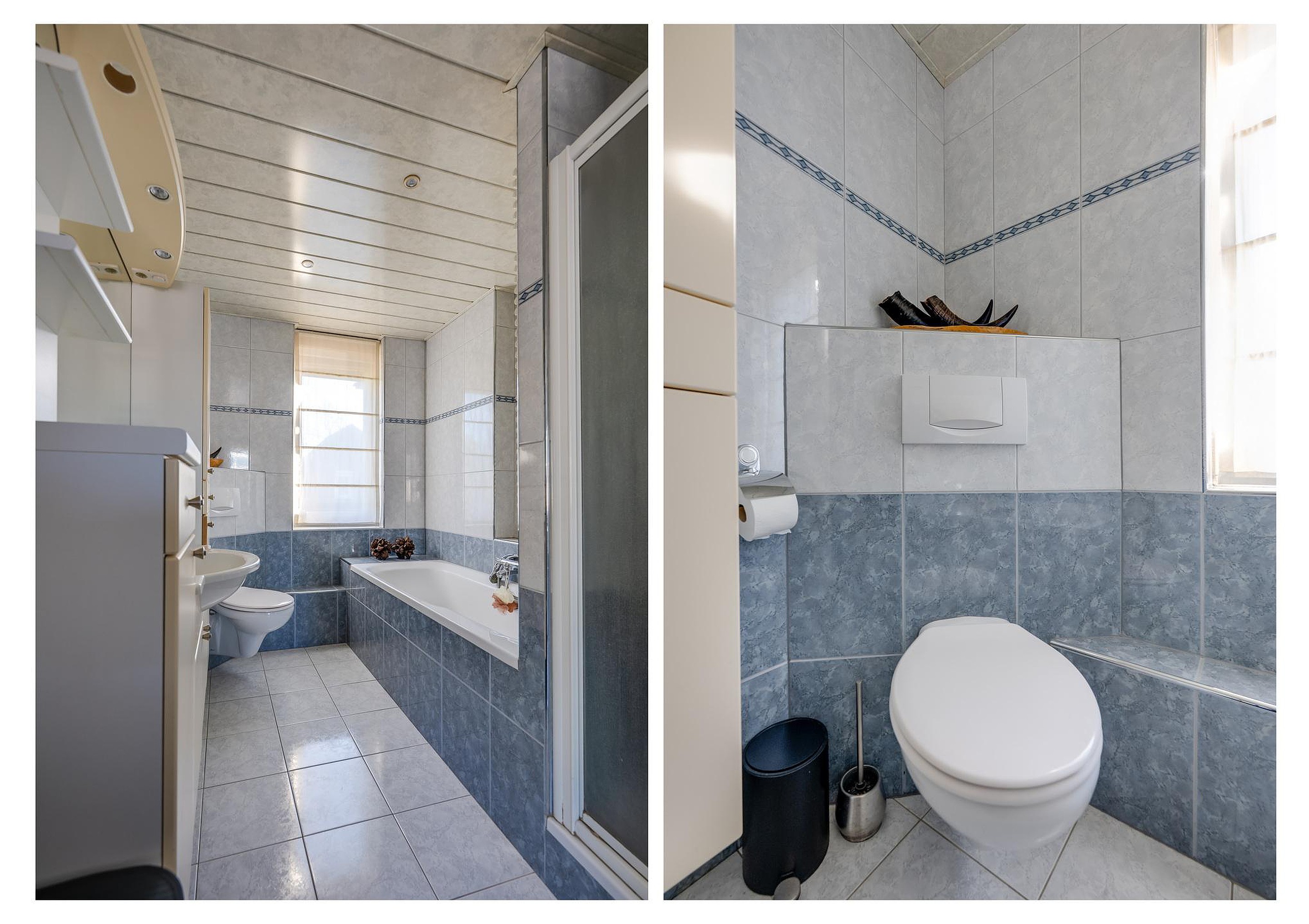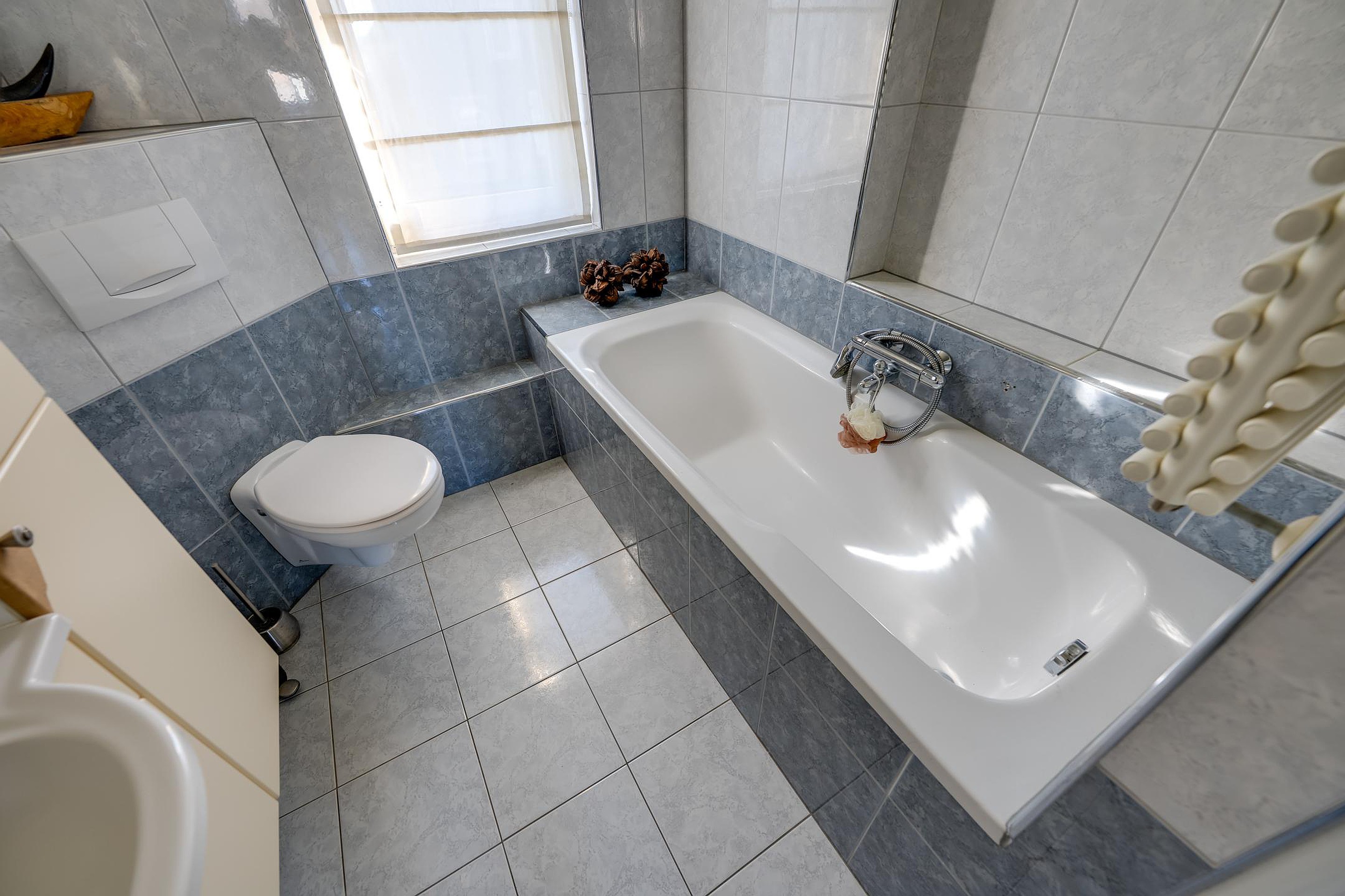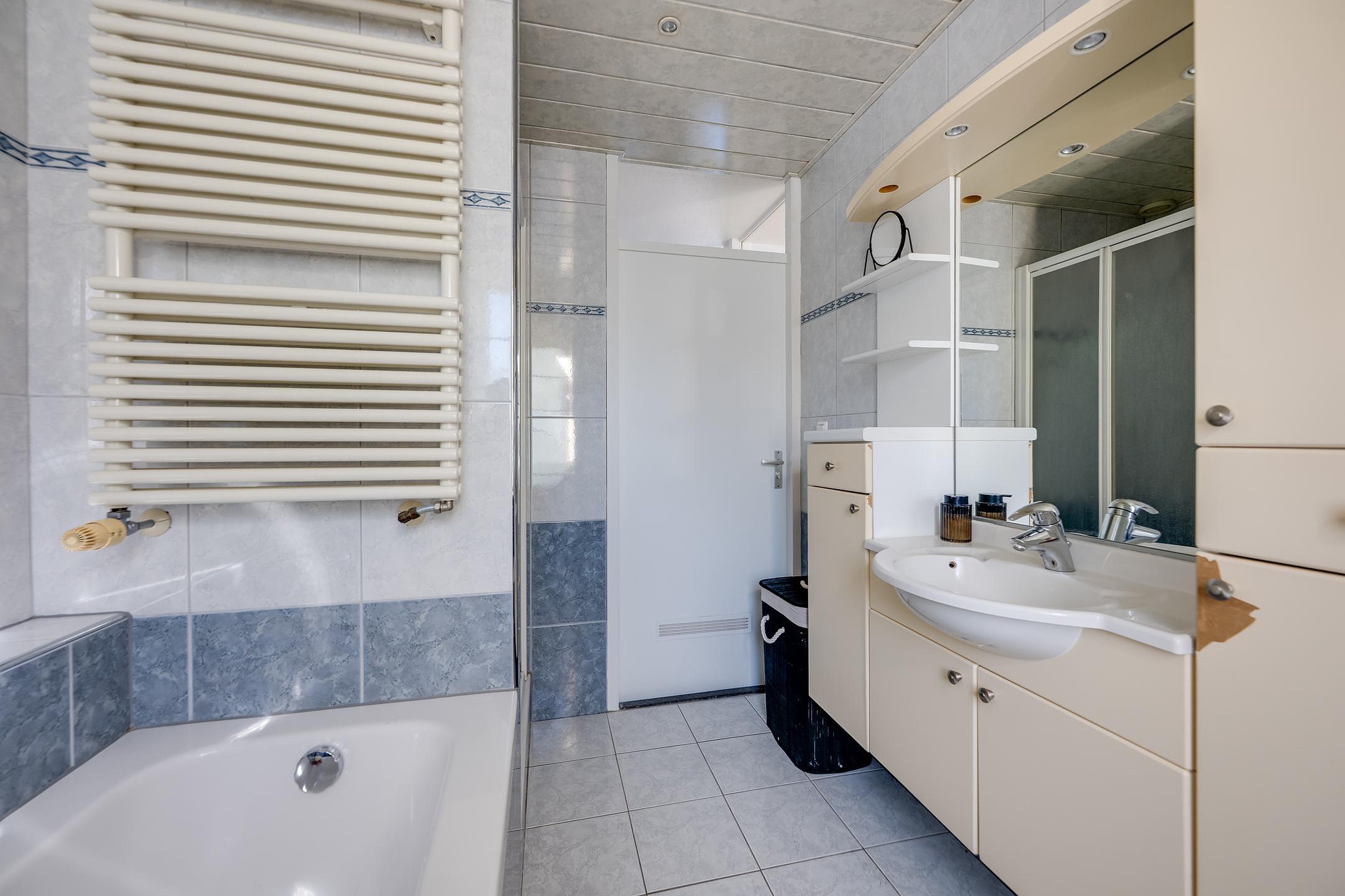 De badkamer (3,00 m. x 2,12 m.) heeft een ligbad met thermostaatkraan, een douchecabine met thermostaatkraan, een zwevend toilet en een breed wastafelmeubel (genoeg ruimte voor een dubbel wastafelmeubel). De ruimte is geheel betegeld. Er is mechanische ventilatie aanwezig.