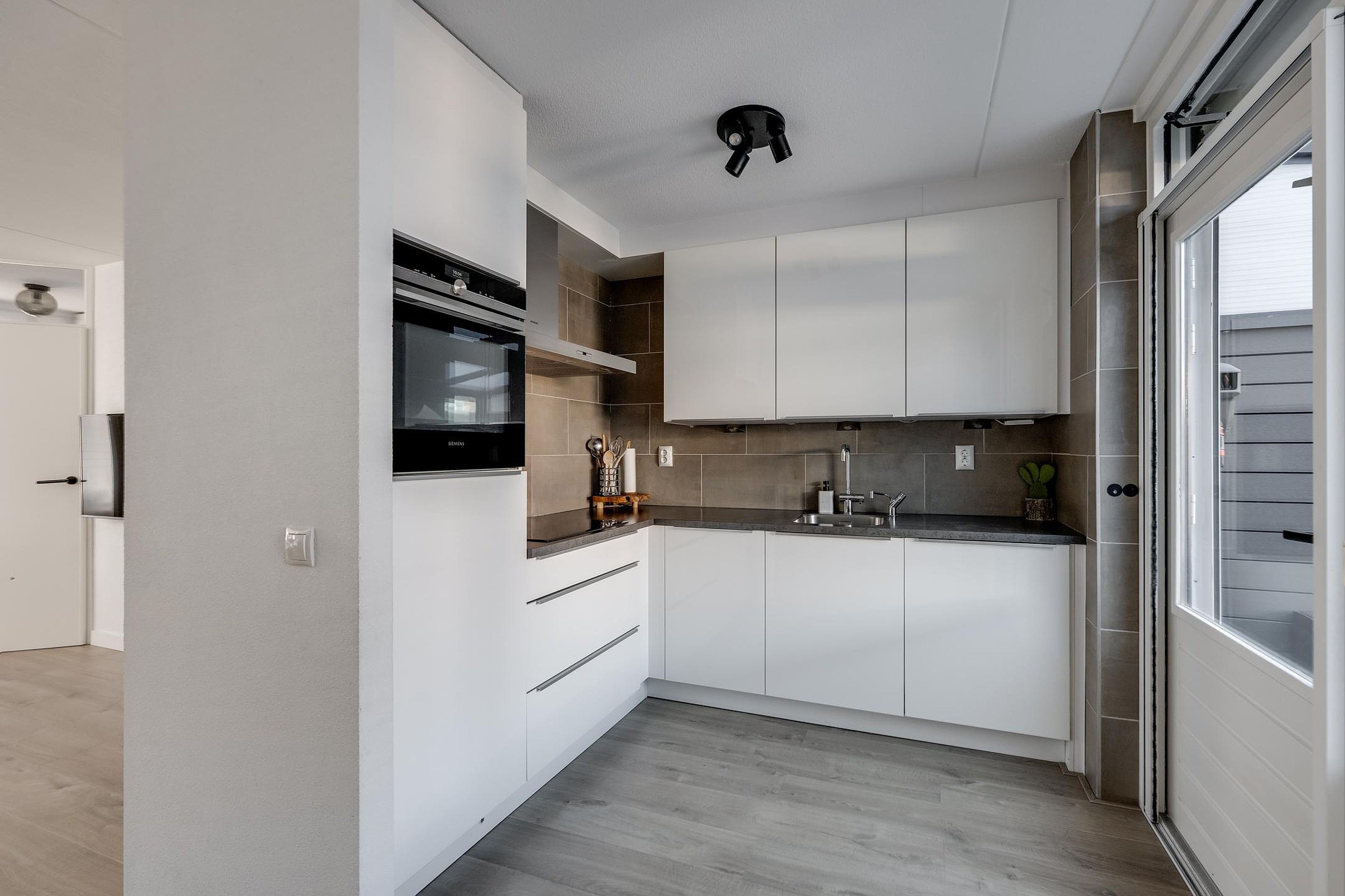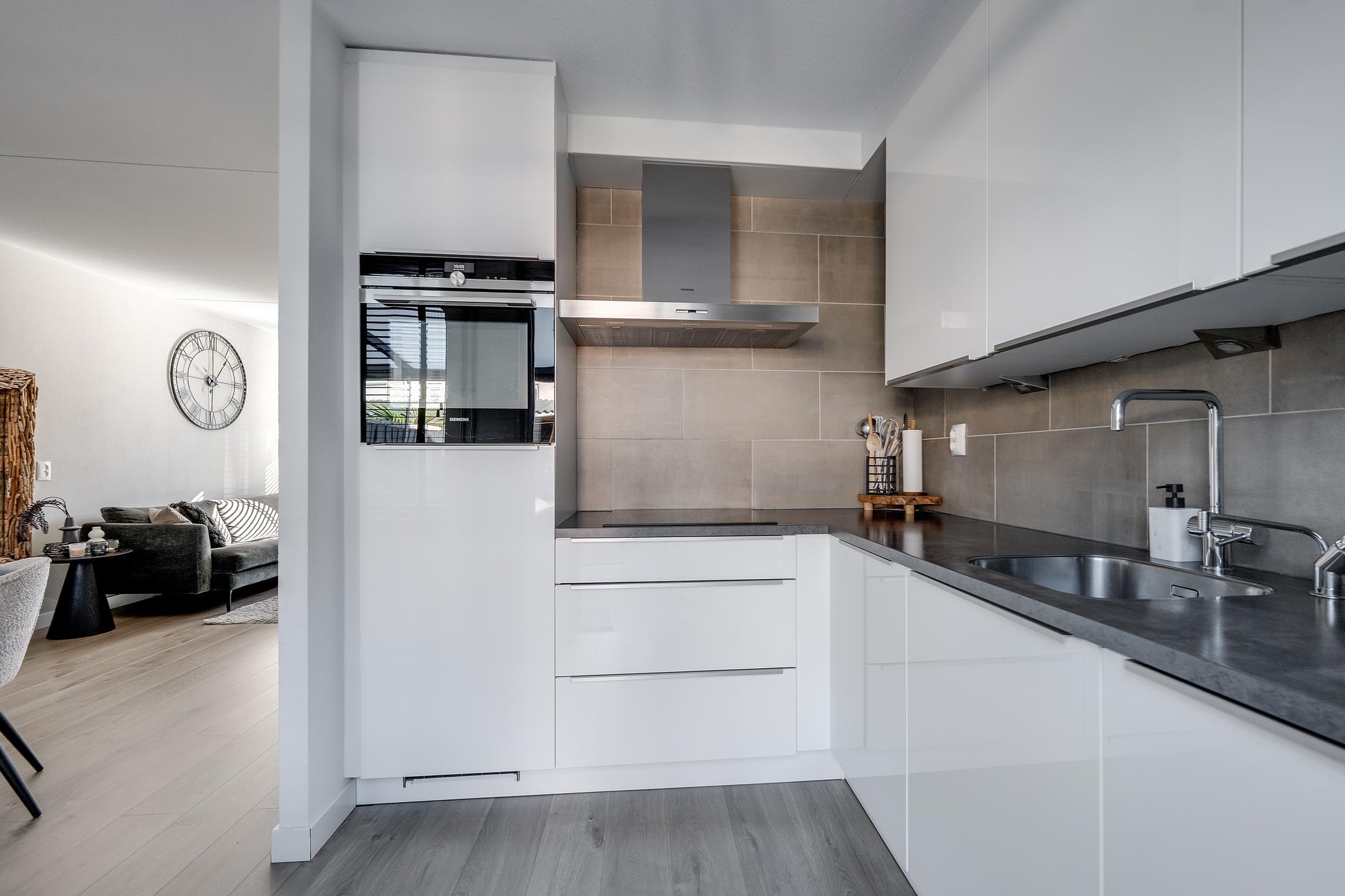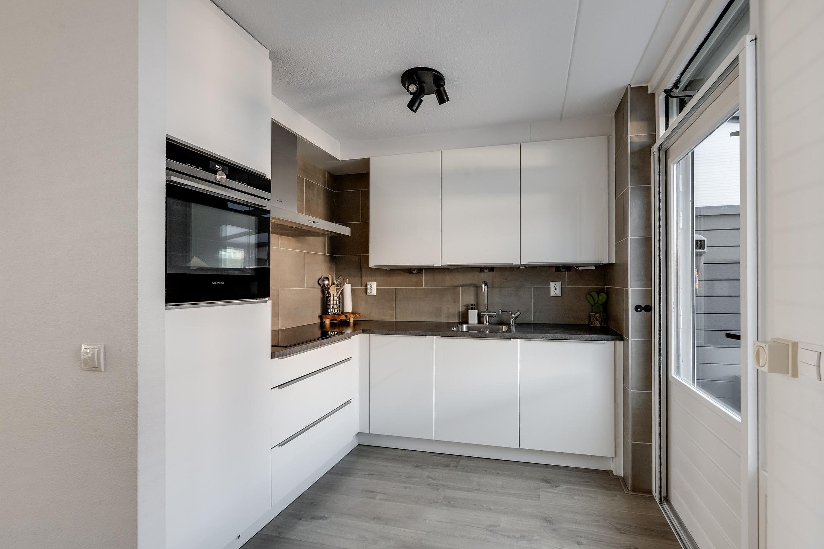 De keuken (2,40 m. x 2,13 m.) bevindt zich aan de achterzijde van de woning. Er staat een modern keukenblok in hoekopstelling. Er zijn zowel onder- als bovenkasten. De witte keuken is v.v. een koelkast, een vaatwasser, een combimagnetron, een 4-pits inductie kookplaat en een rvs afzuigkap. Er is een loopdeur (met schuifhor) naar de tuinserre.